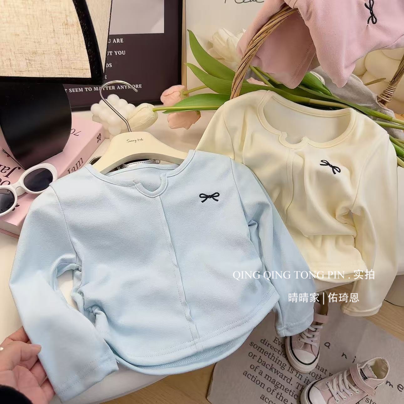여아용 봄 자수 리본 티셔츠 긴팔 심플 귀여운 상의 다용도 캐주얼