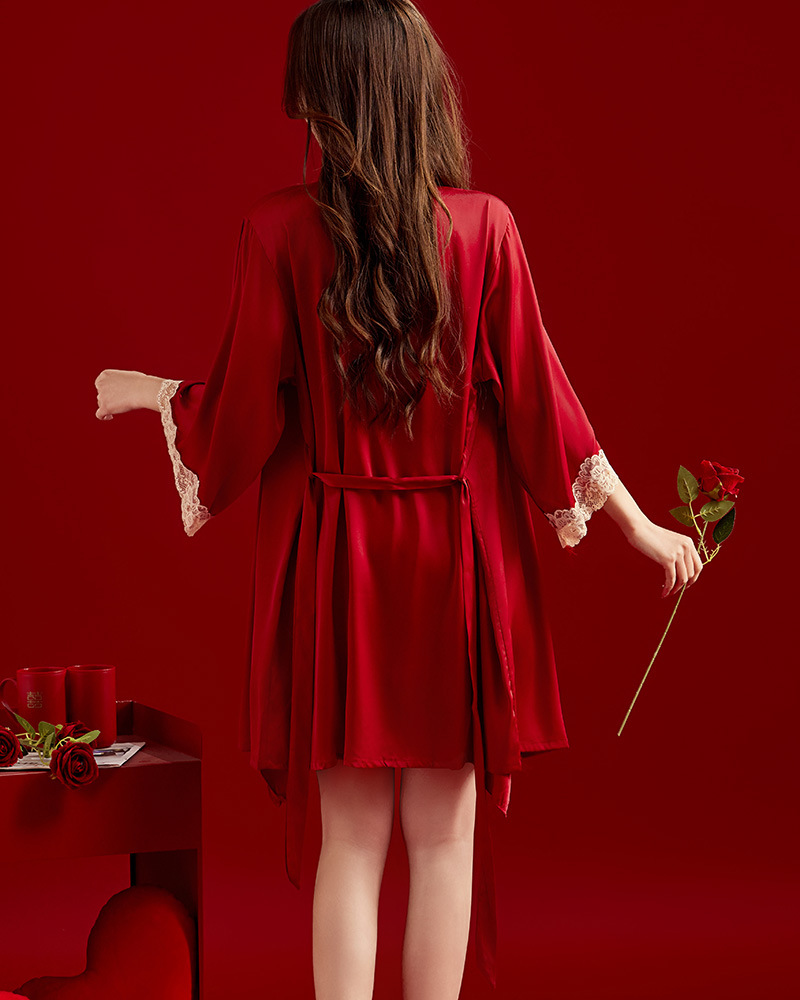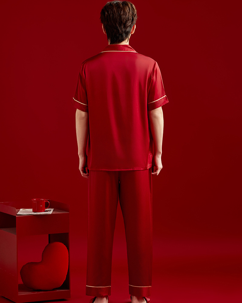 결혼한 커플 잠옷 여성용 잠옷 빨간색 생년월일 여름 아이스 실크 반팔 남성용 고급 실크 홈웨어