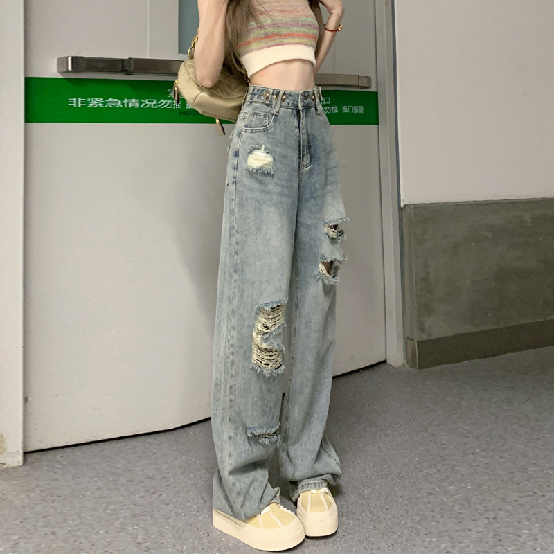 거지의 찢어진 독특한 넓은 다리 청바지 여성용 멀티 버클 조정 가능한 높은 허리 느슨한 바지 스트레이트 바지 봄과 여름 Mopping 바지스토어 가기