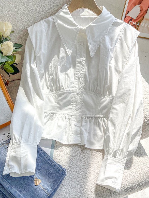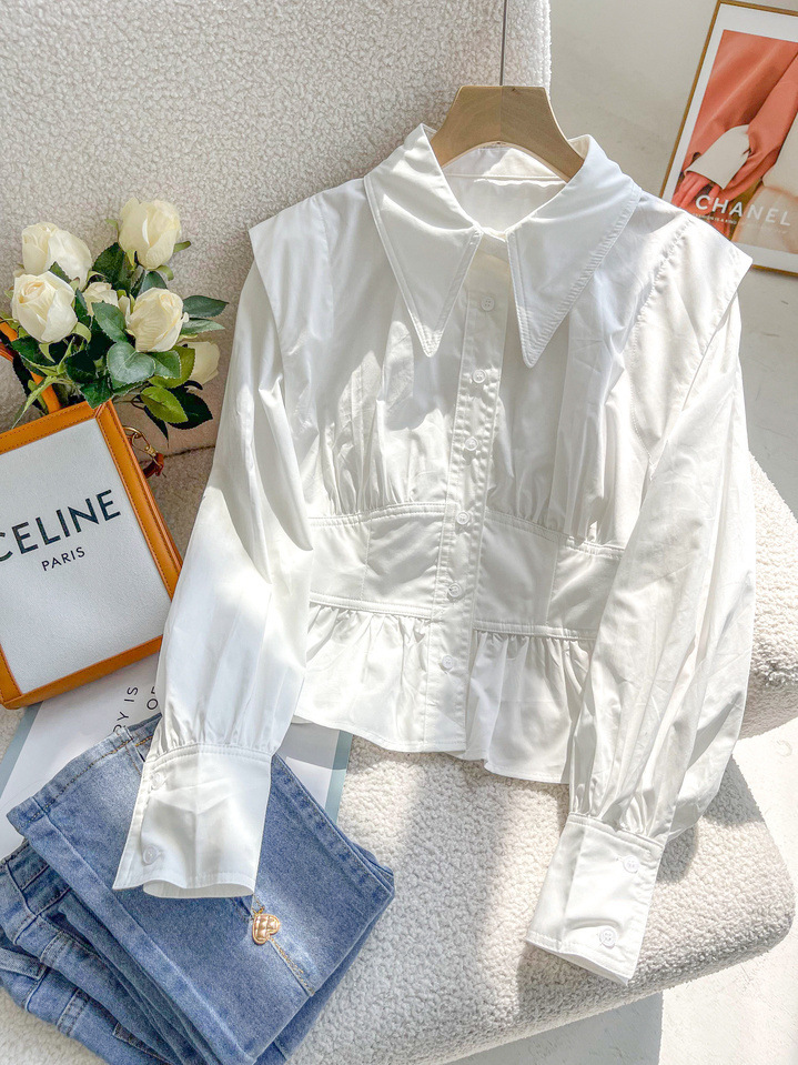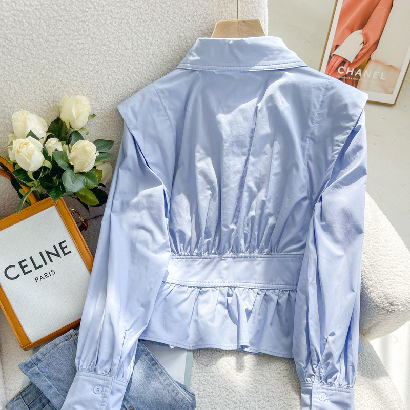 단색 주름 셔츠 여성의 2025 봄 새로운 스타일 작은 셔츠 디자인 틈새 프랑스 달콤하고 매운 허리 긴팔 탑스토어 가기