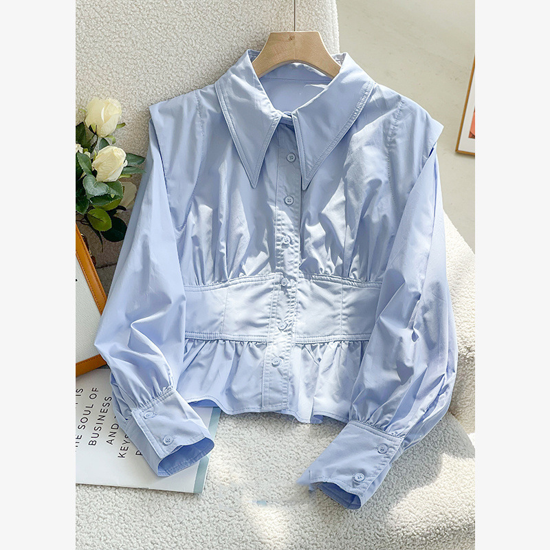 단색 주름 셔츠 여성의 2025 봄 새로운 스타일 작은 셔츠 디자인 틈새 프랑스 달콤하고 매운 허리 긴팔 탑