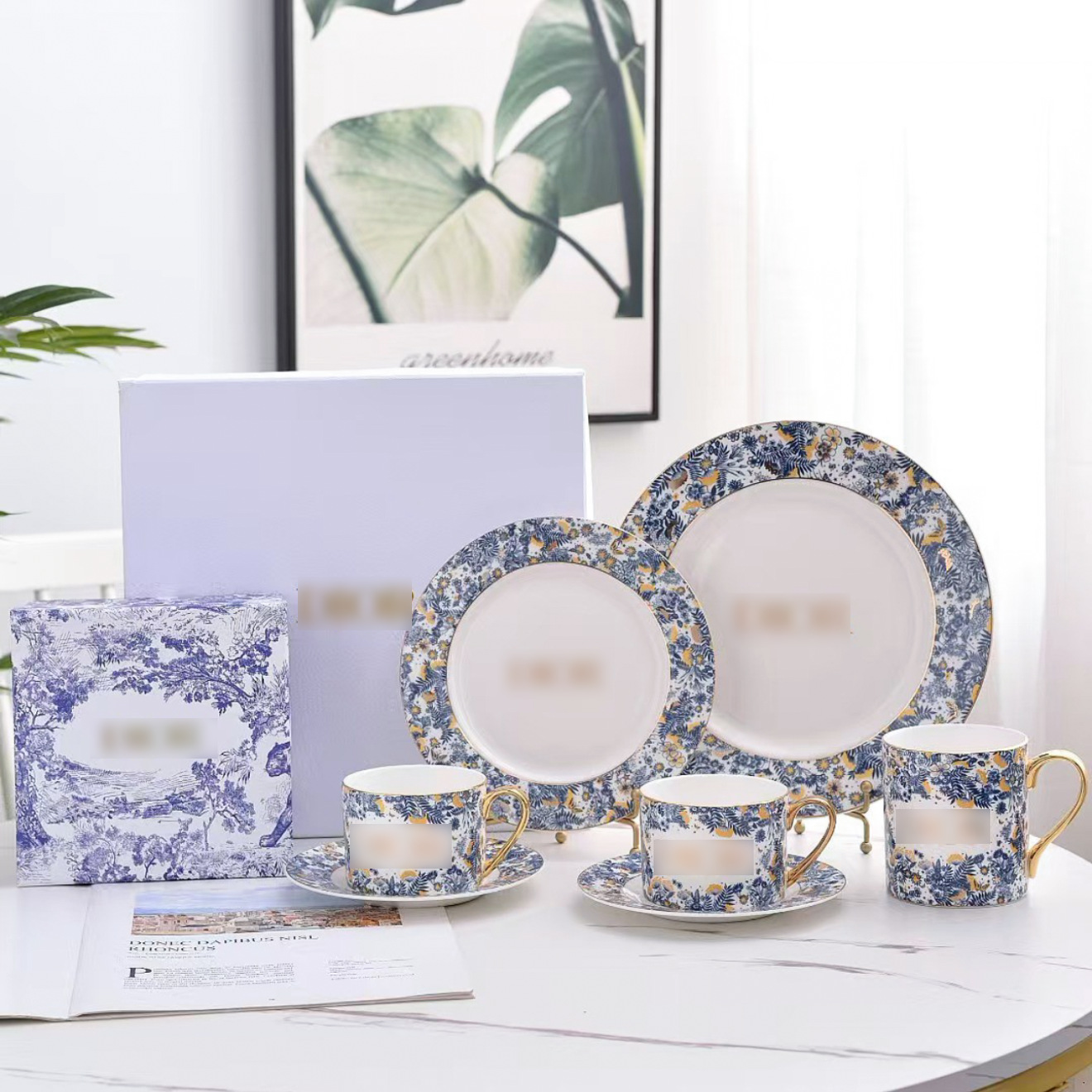 고급 세라믹 서양식 접시 D가족 블루 골드 애프터눈 티 디저트 접시 커피잔 과자 과일 접시 물컵
