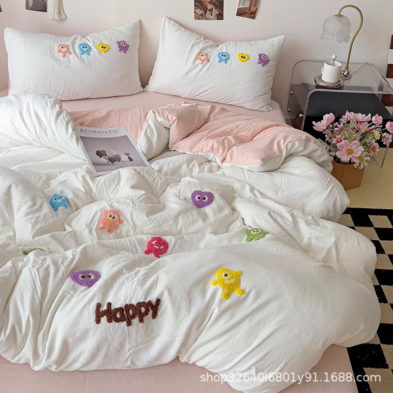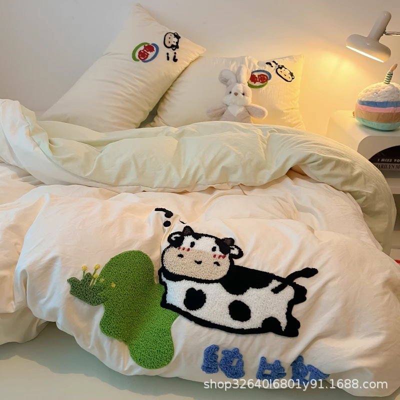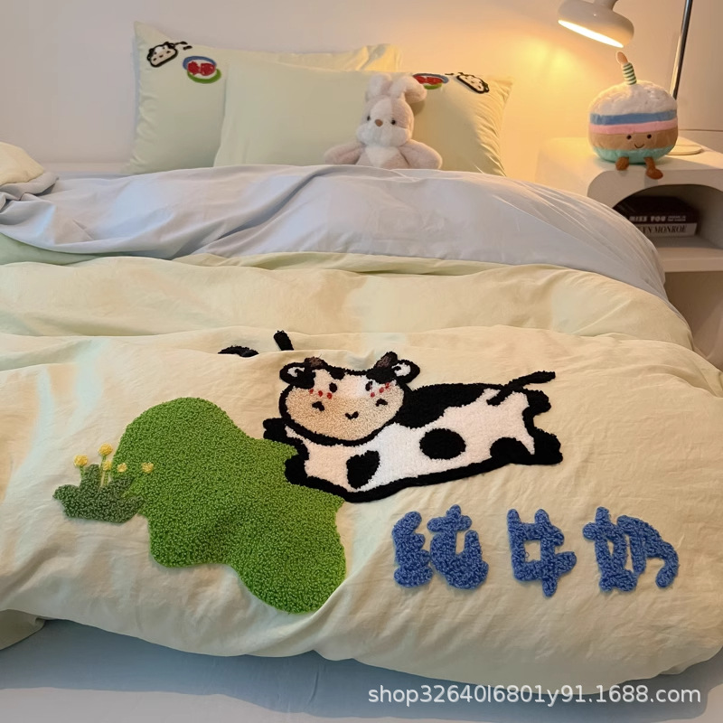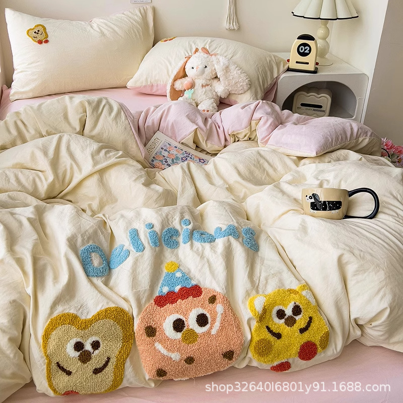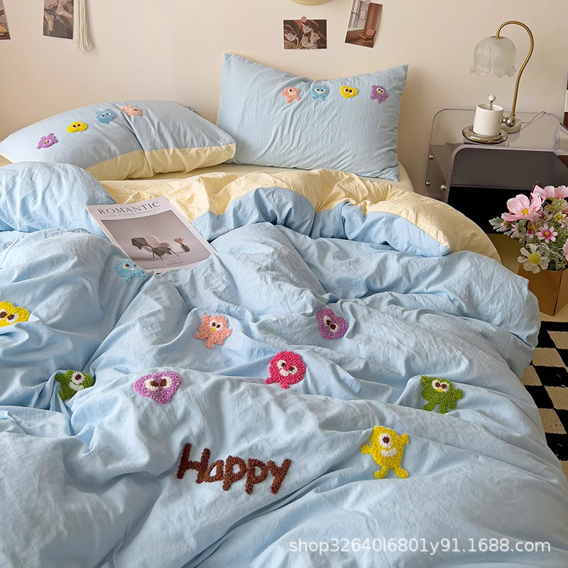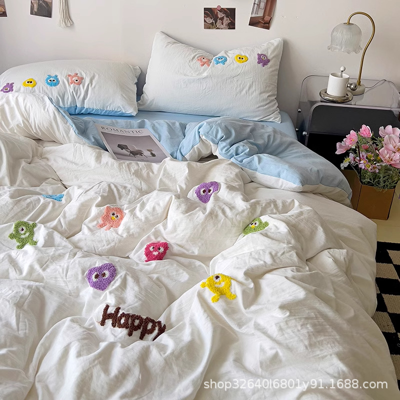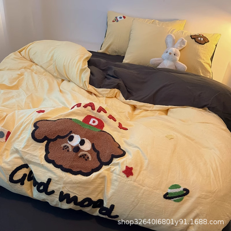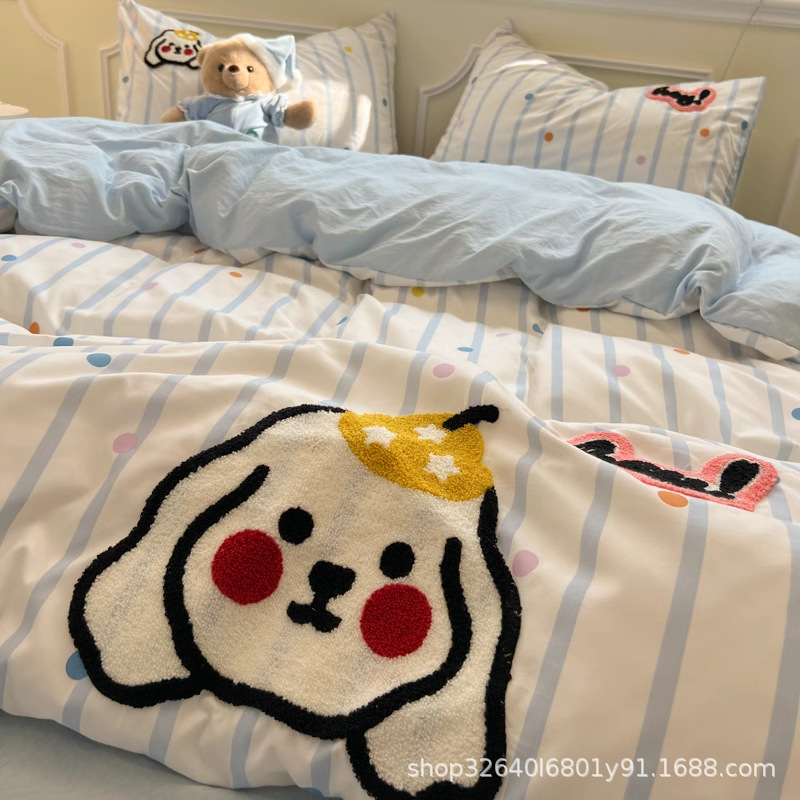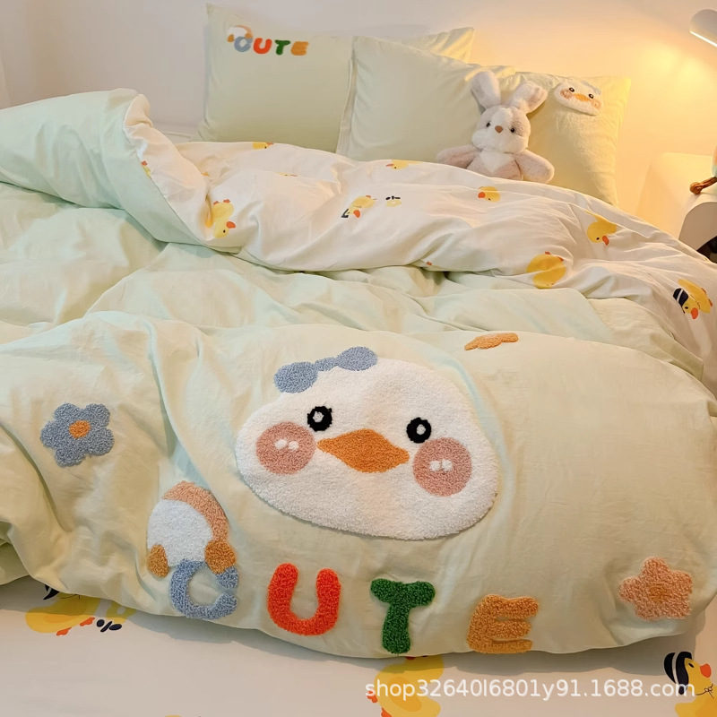 순면 침구 이불 커버 퀼트 커버 봄과 가을 두꺼운 침대 시트 침대 모자 학생 기숙사 3 피스 세트