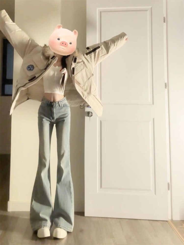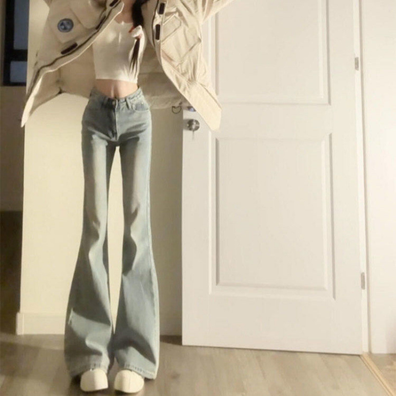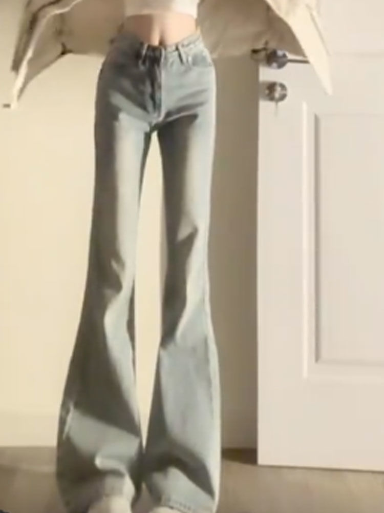 빈티지 미국식 라이트 블루 마이크로 청바지 여성의 2025 년 봄과 가을 새로운 작은 탄성 슬림 말굽 뿔