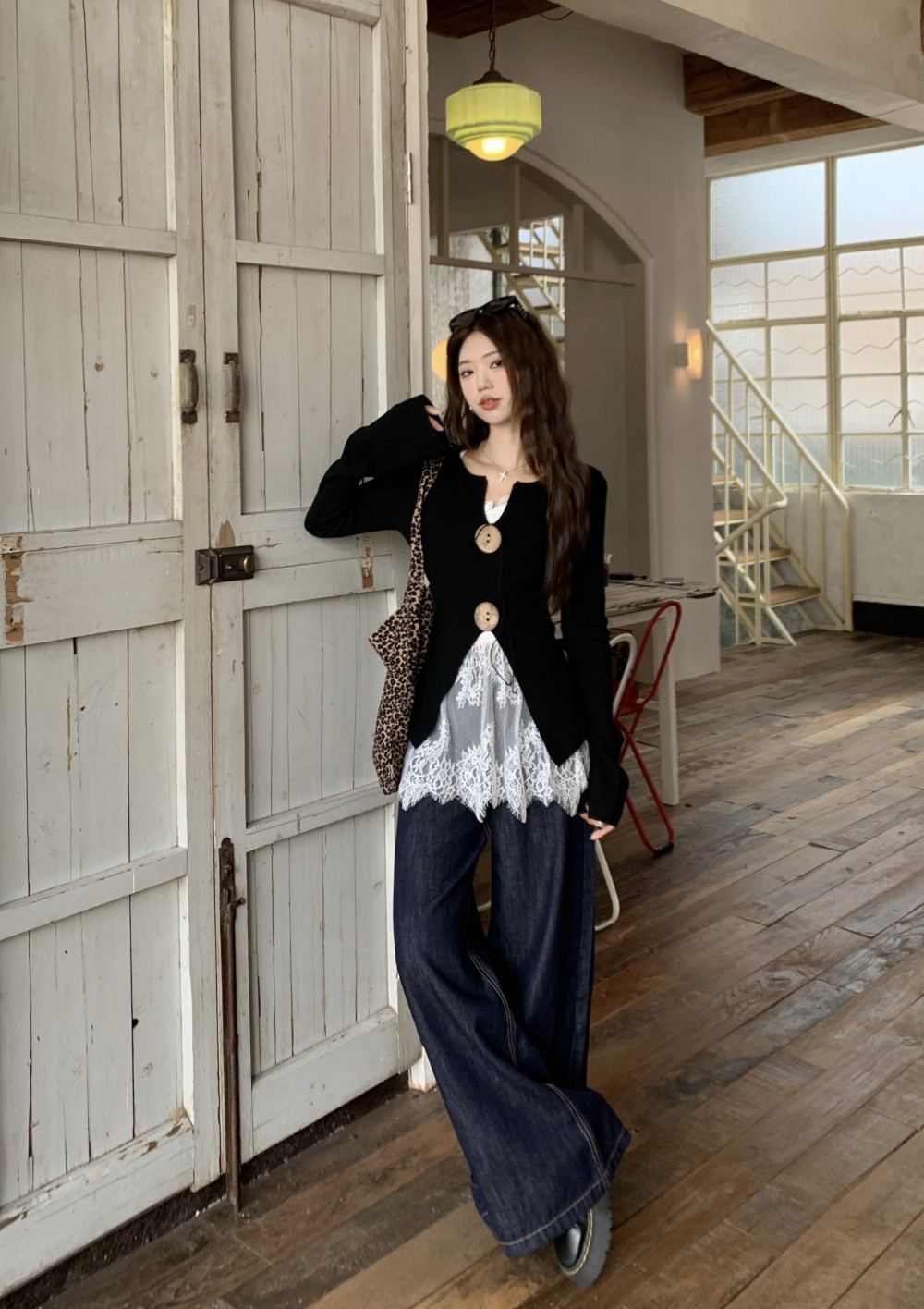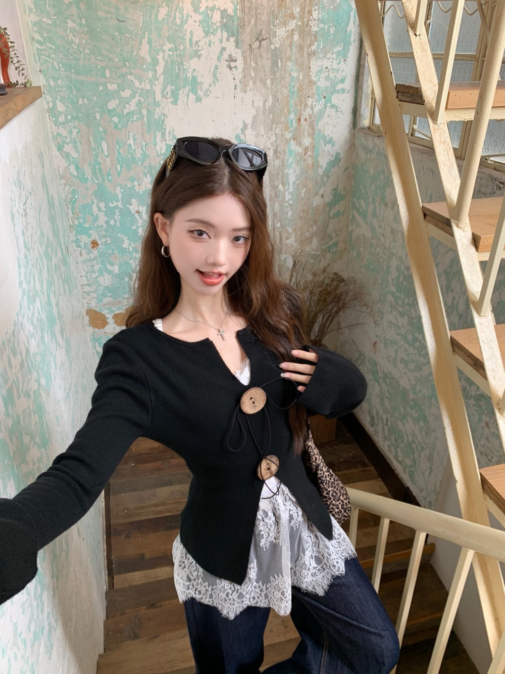 • 블랙 니트 + 레이스 멜빵