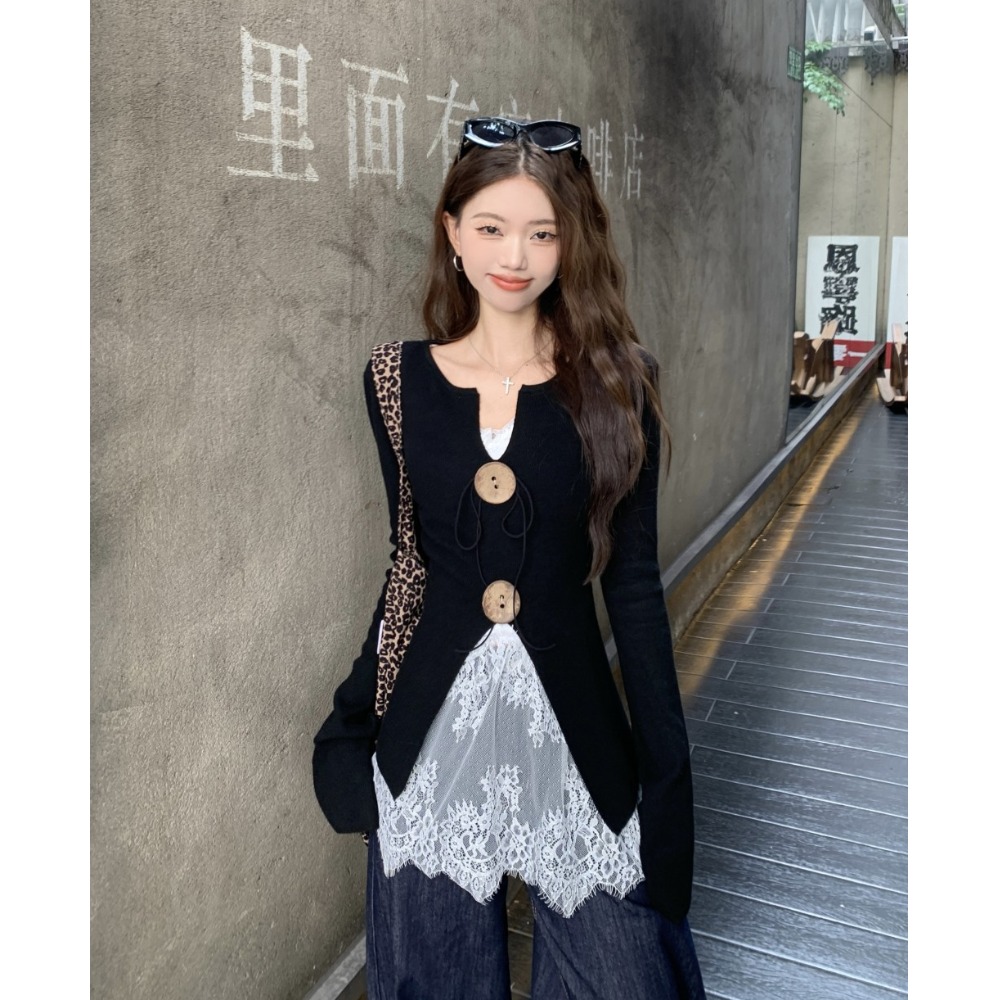 버튼 스타일 블랙 긴팔 스웨터 여성의 봄과 가을 디자인 센스 틈새 타이트 허리 스플릿 베이스 셔츠 탑
