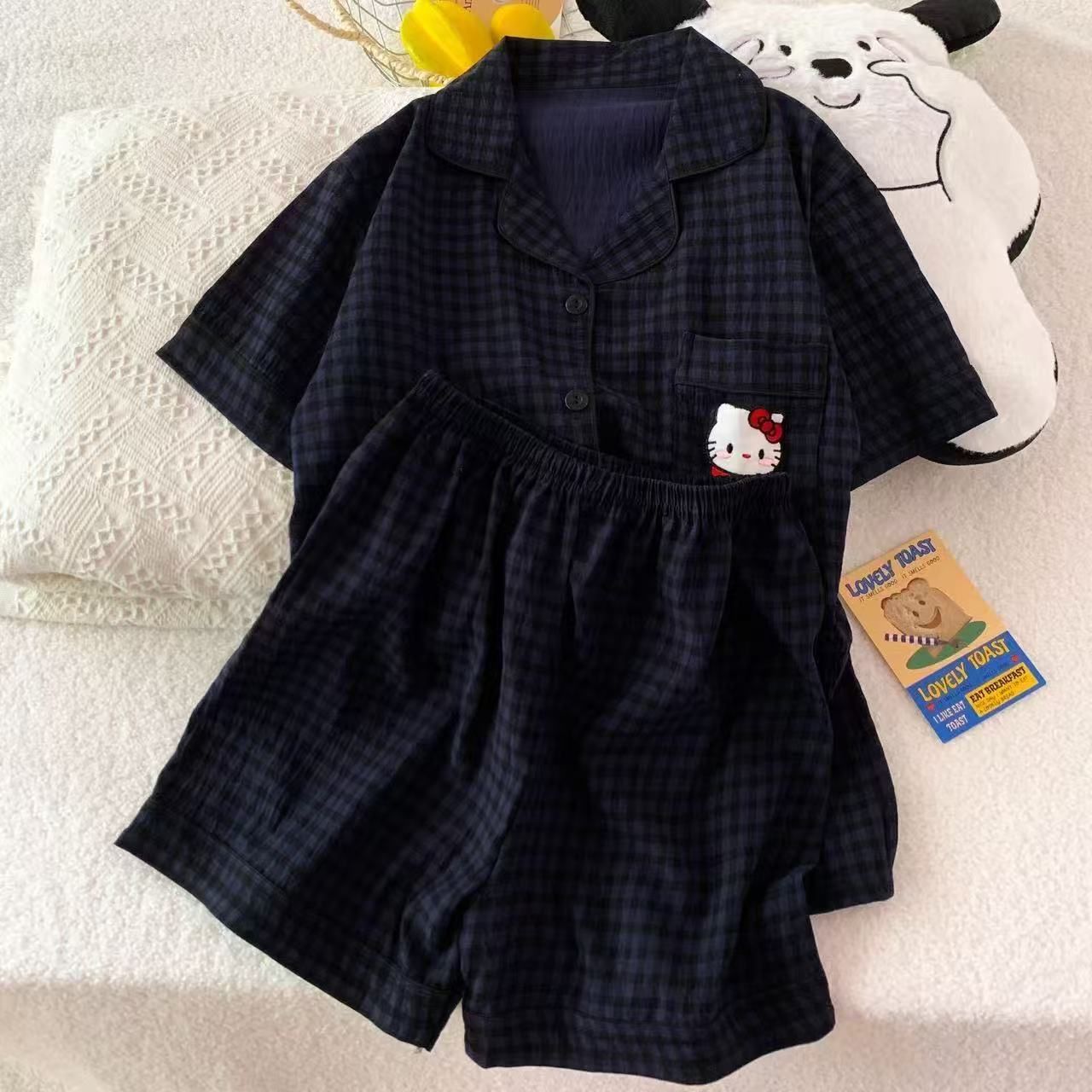 • 5523 딥블루 체크 KT 고양이 - 구름면 반팔 반바지 세트