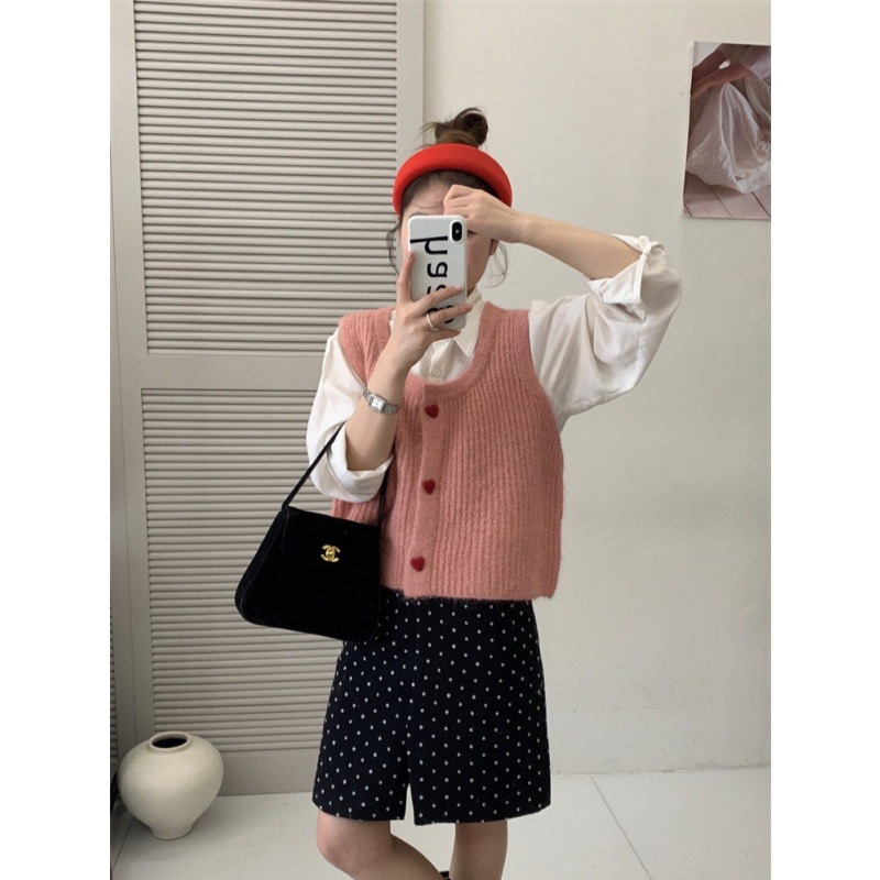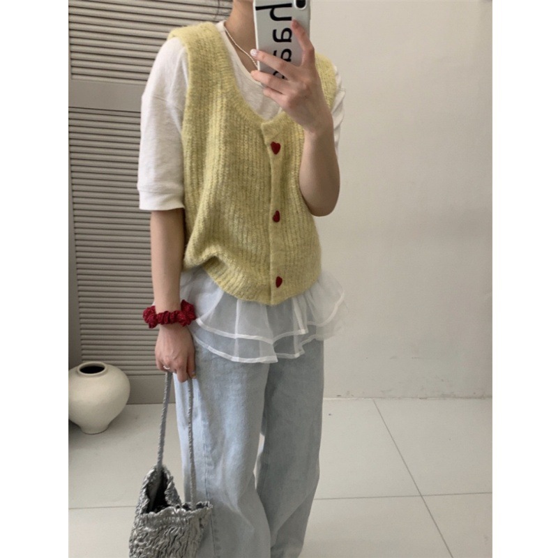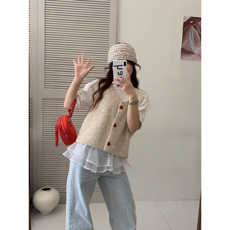 한국 스타일 부드러운 왁스 달콤한 낮은 둥근 목 사랑 버튼 카디건 조끼 여성 민소매 짧은 스태킹 스웨터