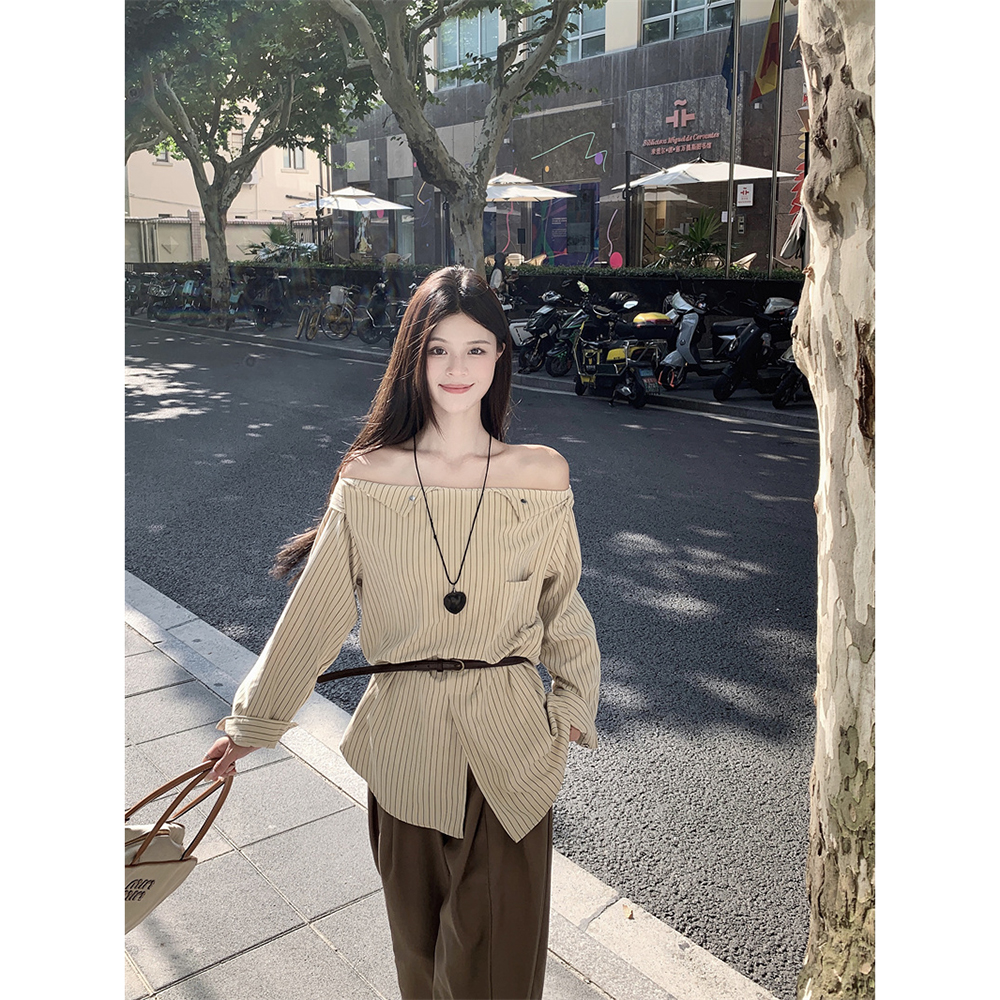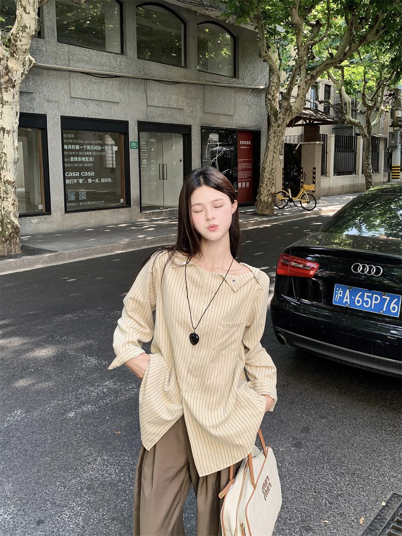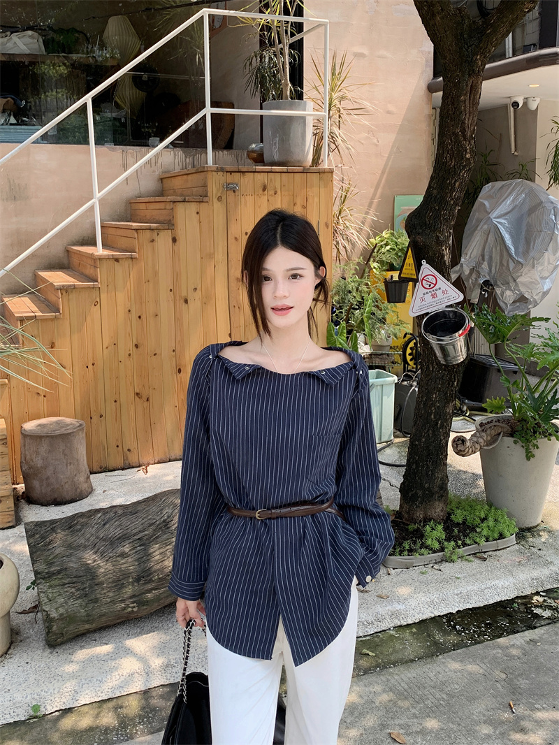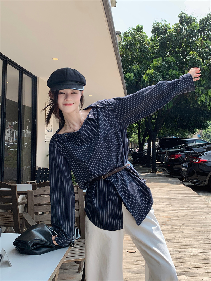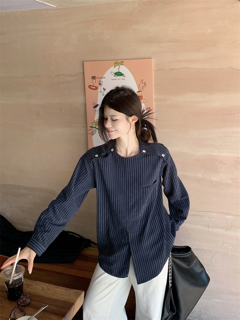 한국식 줄무늬 어깨 분할 긴팔 셔츠 봄 2025 새로운 디자인 센스 패션 여성을위한 우아한 틈새스토어 가기