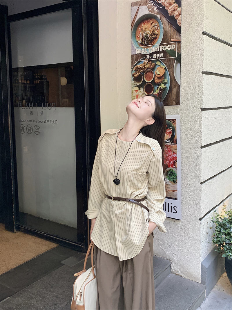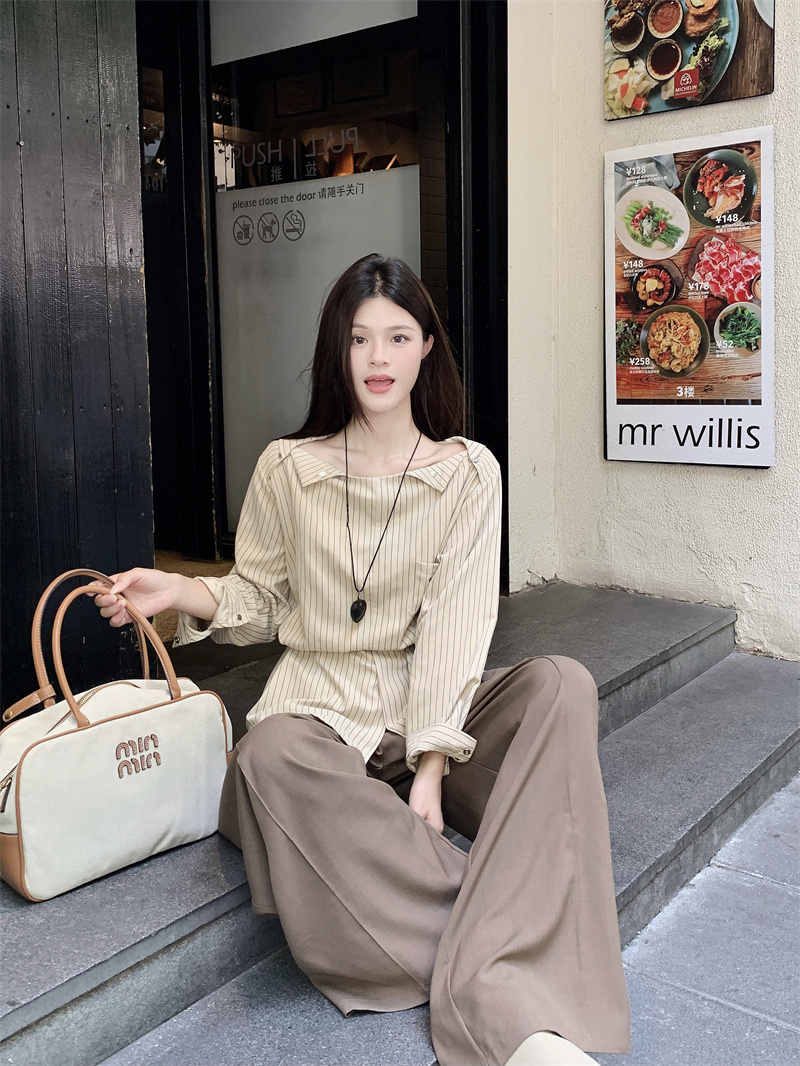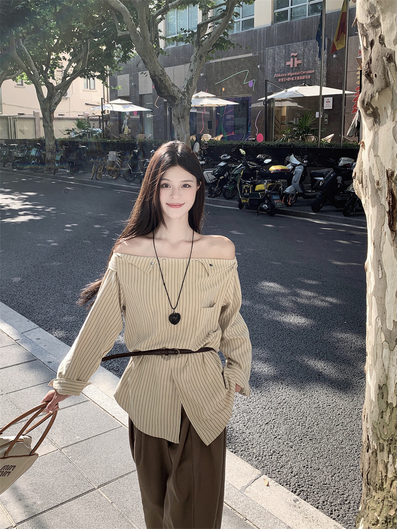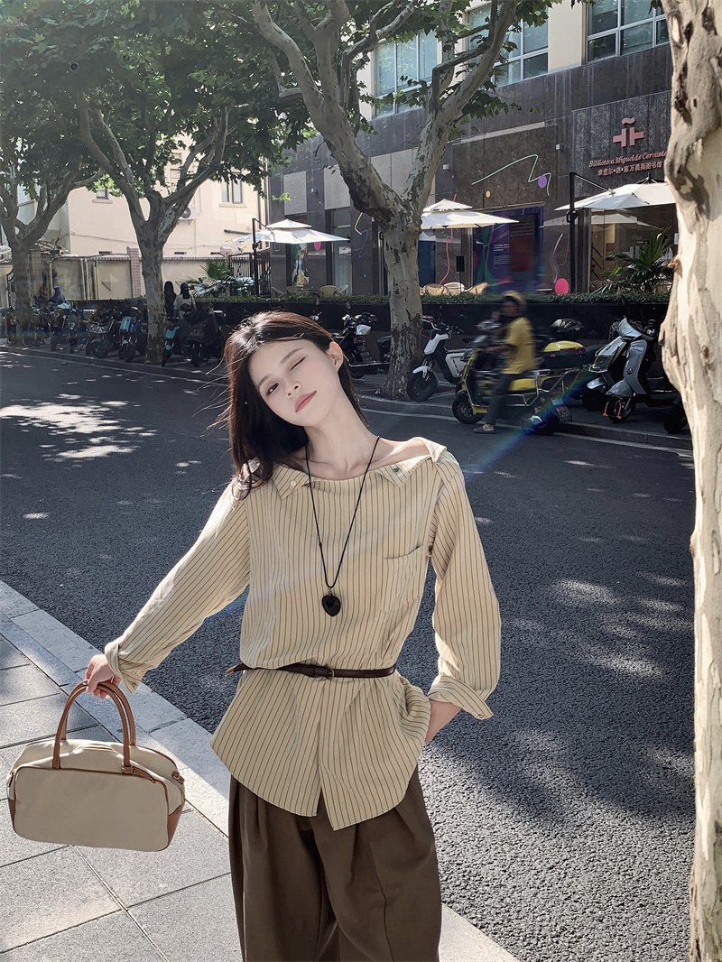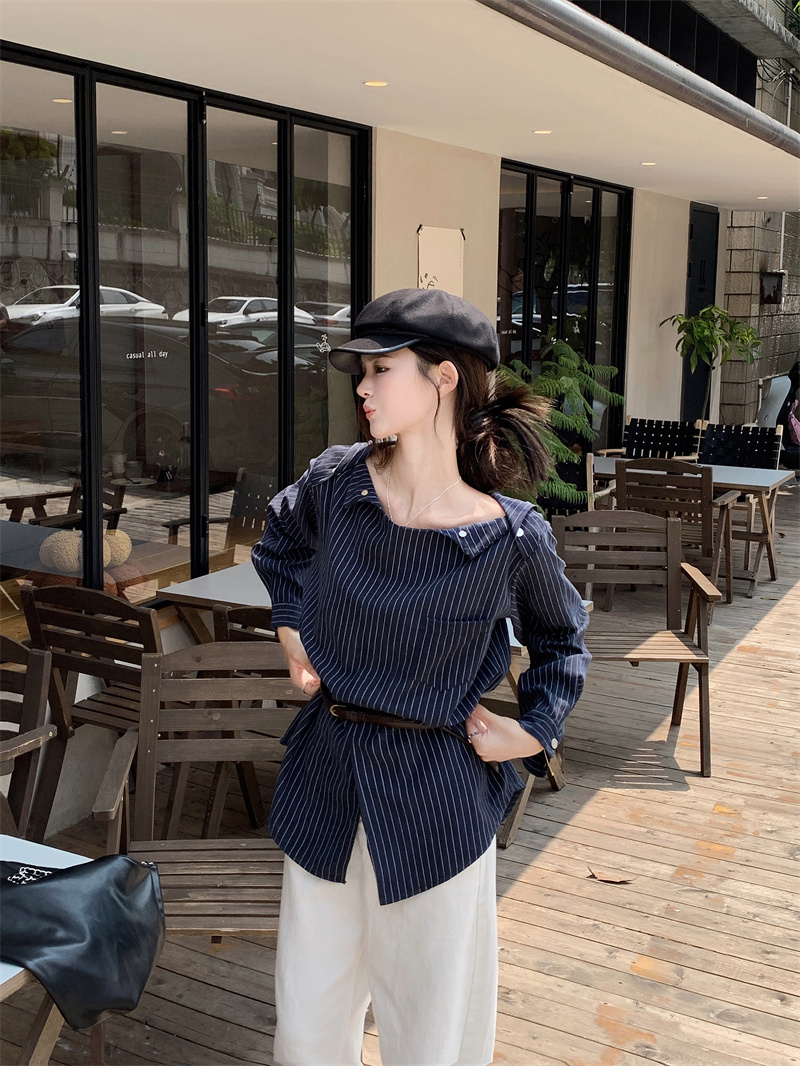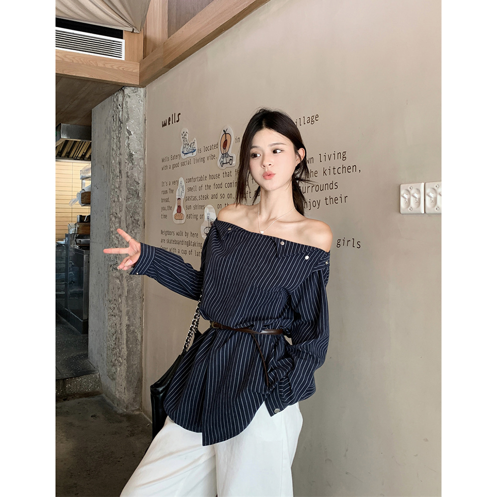 한국식 줄무늬 어깨 분할 긴팔 셔츠 봄 2025 새로운 디자인 센스 패션 여성을위한 우아한 틈새스토어 가기