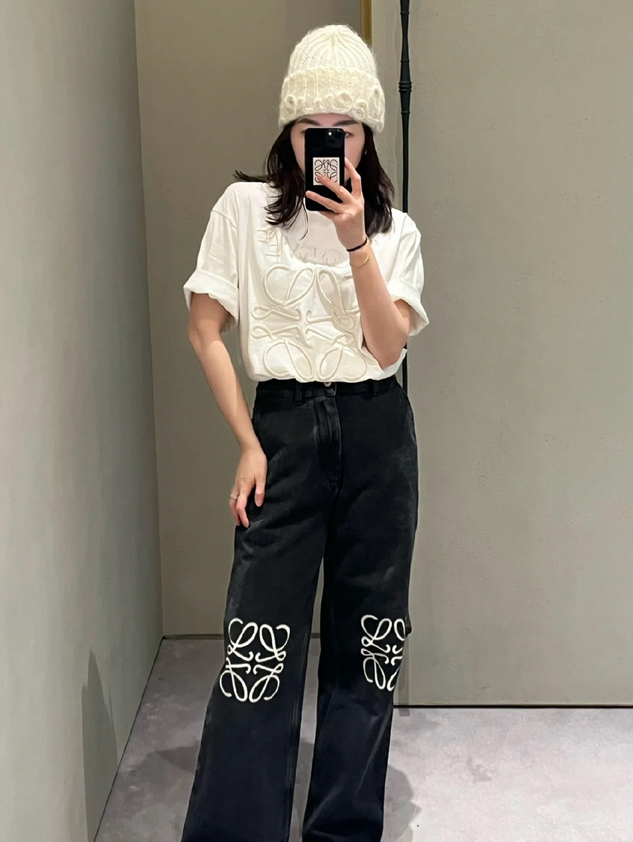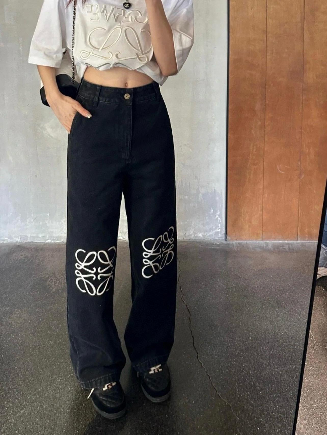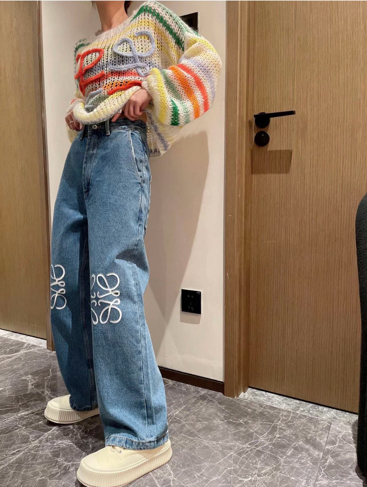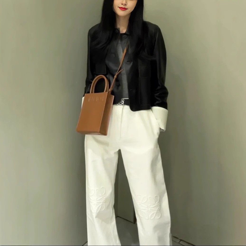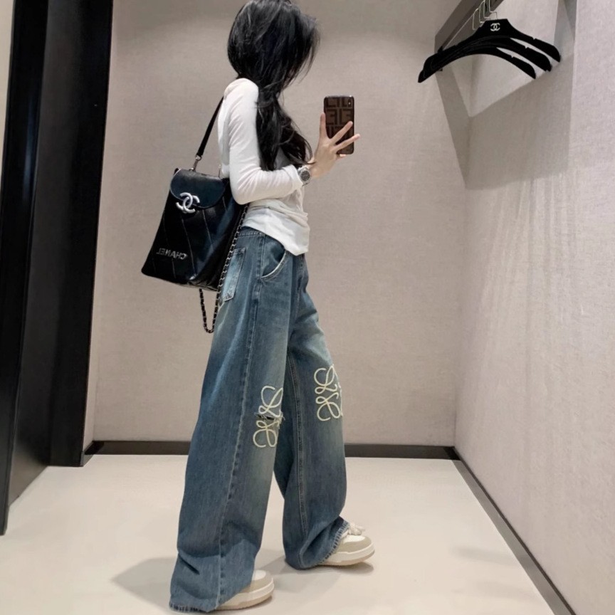 유행 브랜드 LOWE 클래식 자수 청바지 여성용 높은 허리 스트레이트 와이드 레그 팬츠 캐주얼 패션 슬리밍 스타 바지스토어 가기