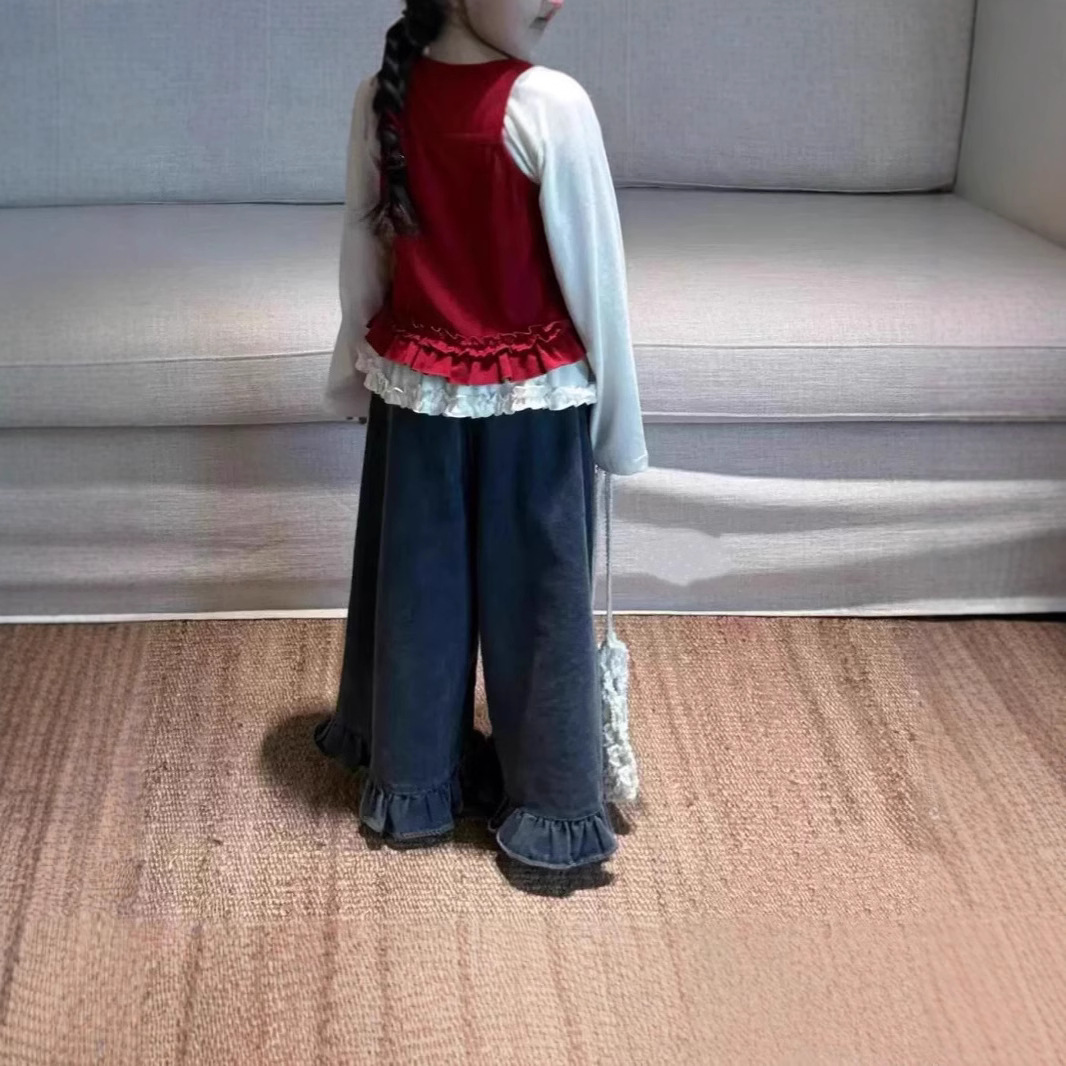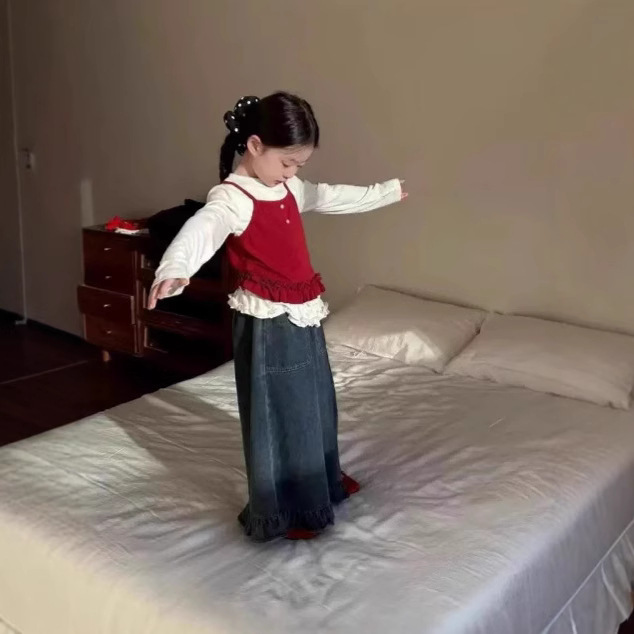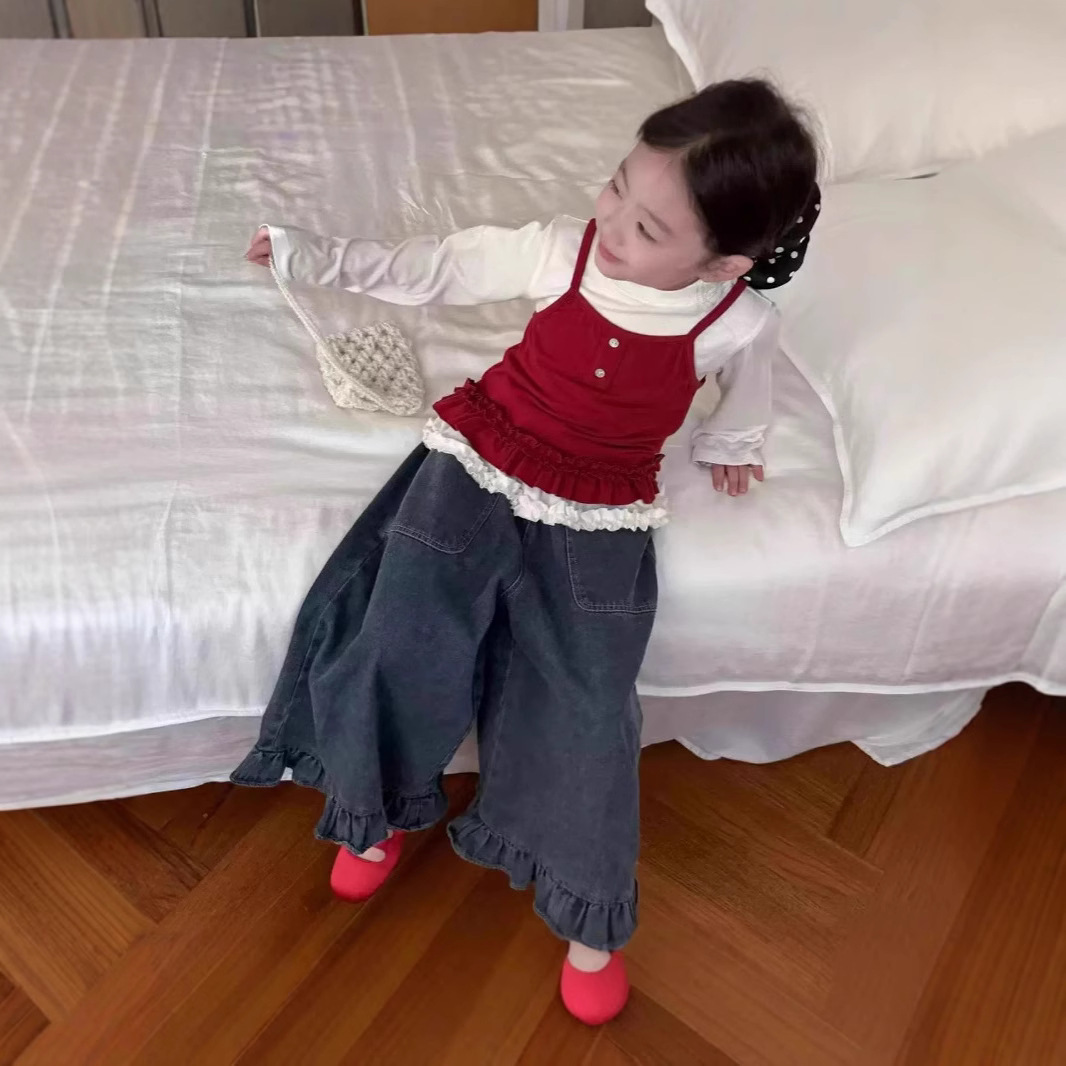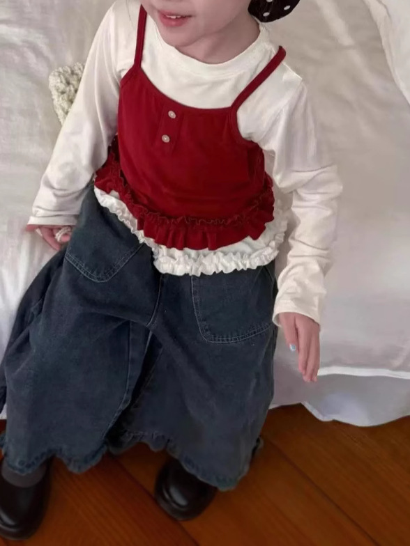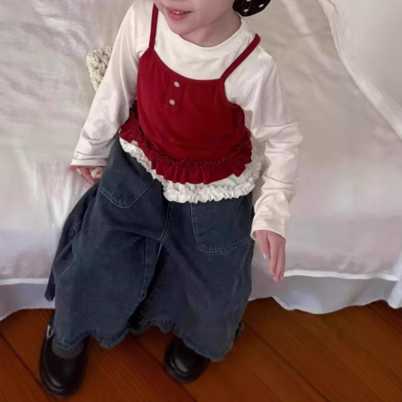 소녀의 봄 세트 2025 새로운 어린이 더블 레이스 카미 솔 얇은 내부 긴 소매 T 투피스 세트