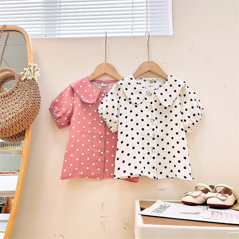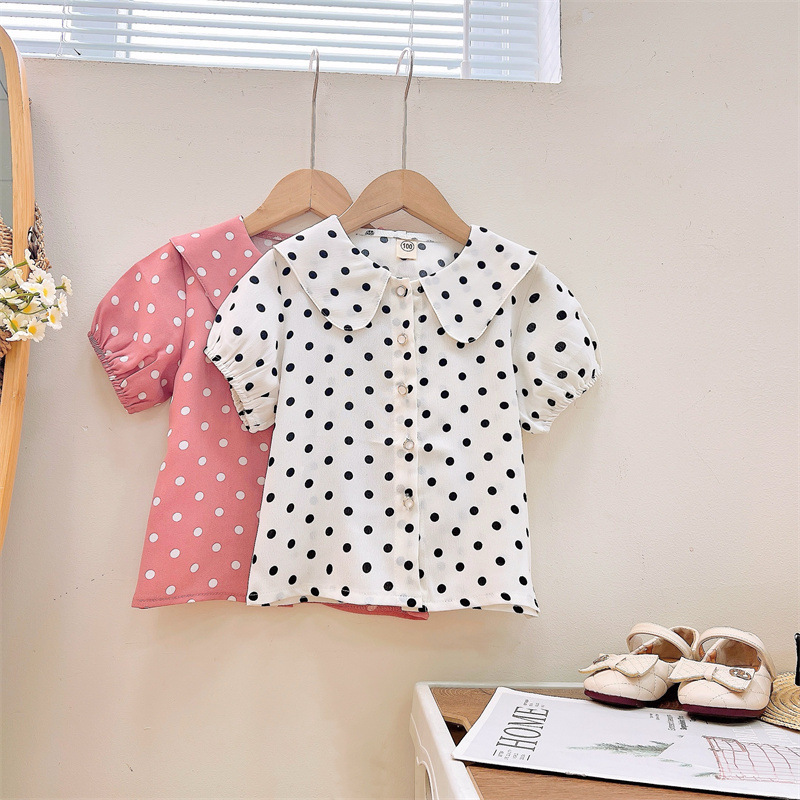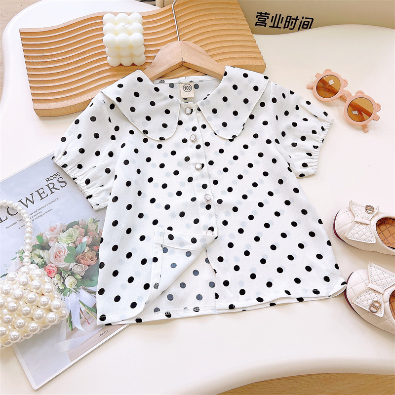 여자 여름 반팔 티셔츠 2025 여름 새 쉬폰 폴도트 인형 칼라 스타일 아기 반팔 셔츠스토어 가기