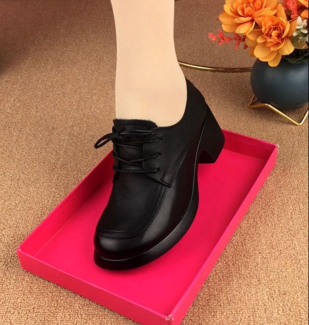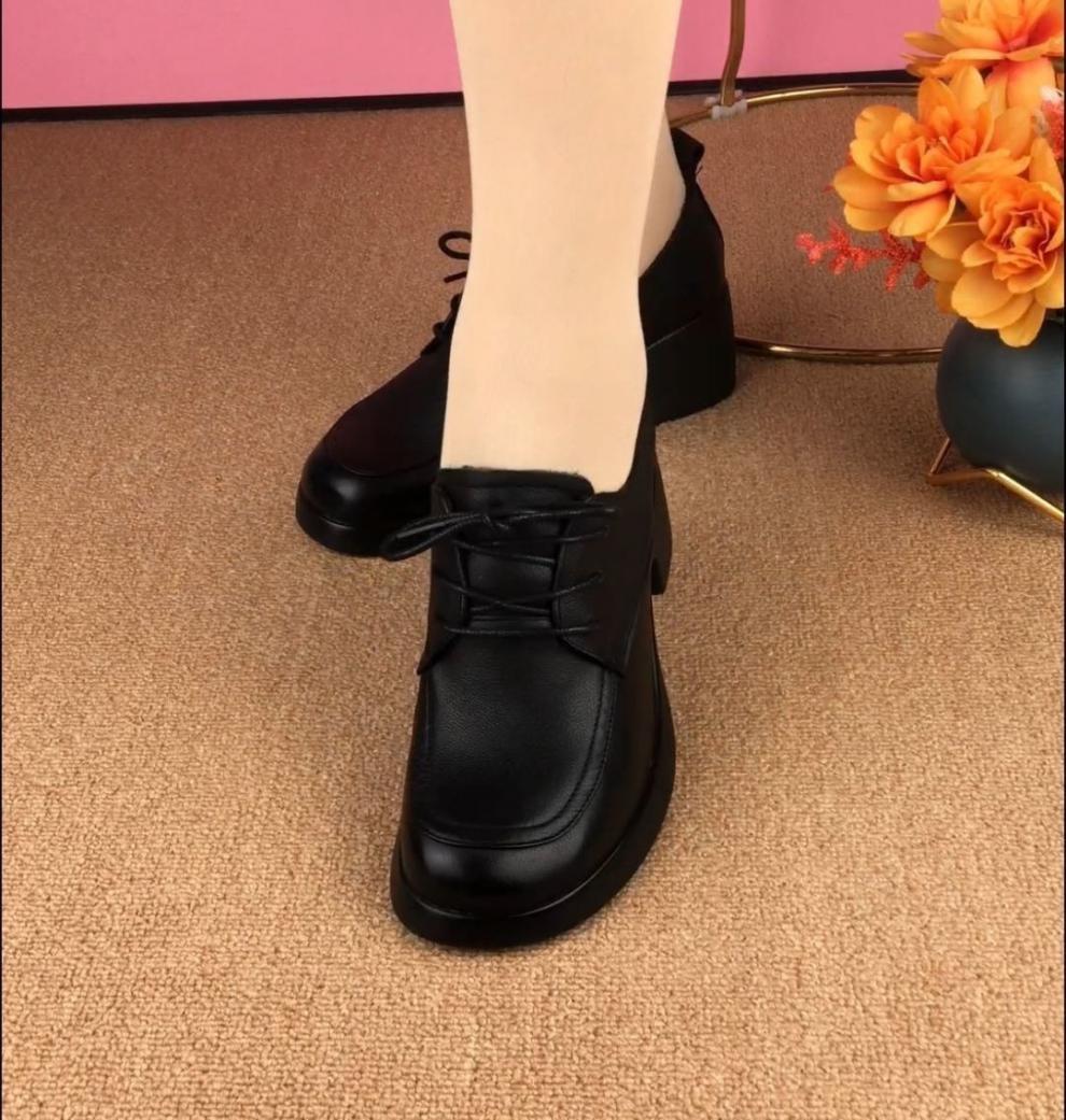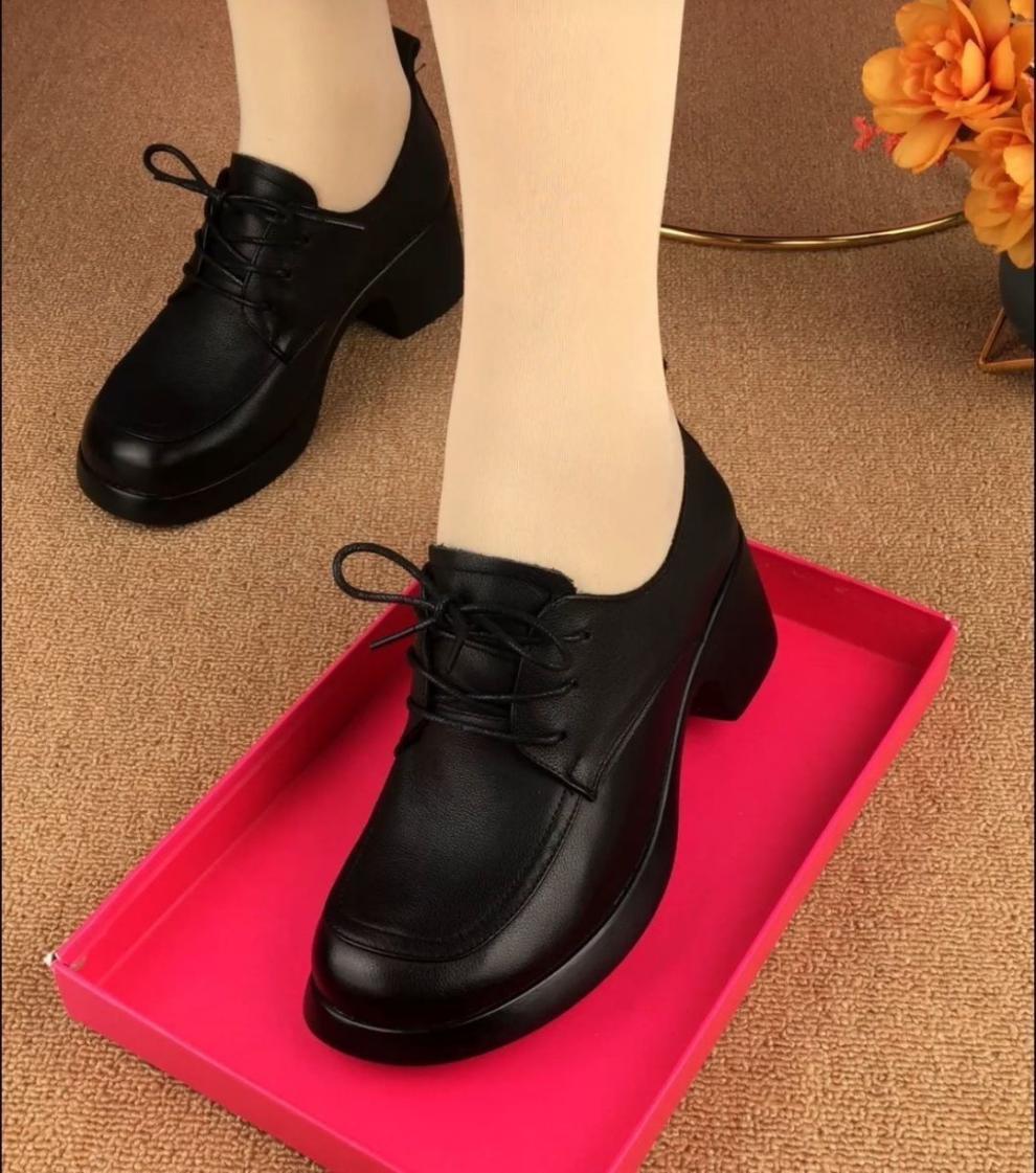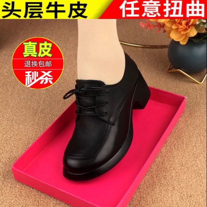 진짜 부드러운 가죽 깊은 입 싱글 레이어 신발 여성의 2023 가을 새로운 편안한 미드 힐 라운드 토 레이스 업 웨스턴 스타일 올 매치 여성 가죽 신발스토어 가기