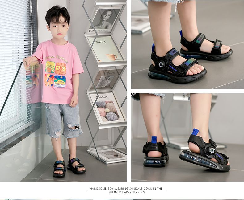 소년 샌들 여름 2025 새로운 소프트 단독 미끄럼 방지 어린이 스위블 버튼 패션 오픈 발가락 소년 비치 슈즈스토어 가기
