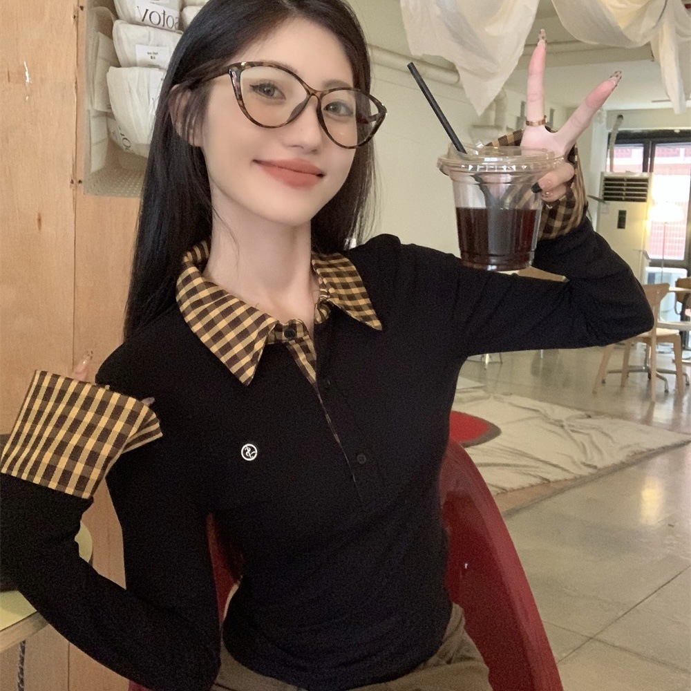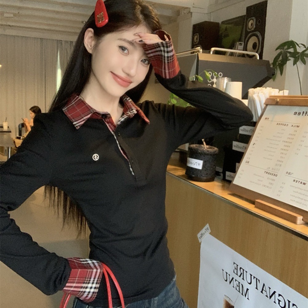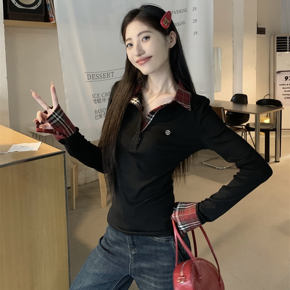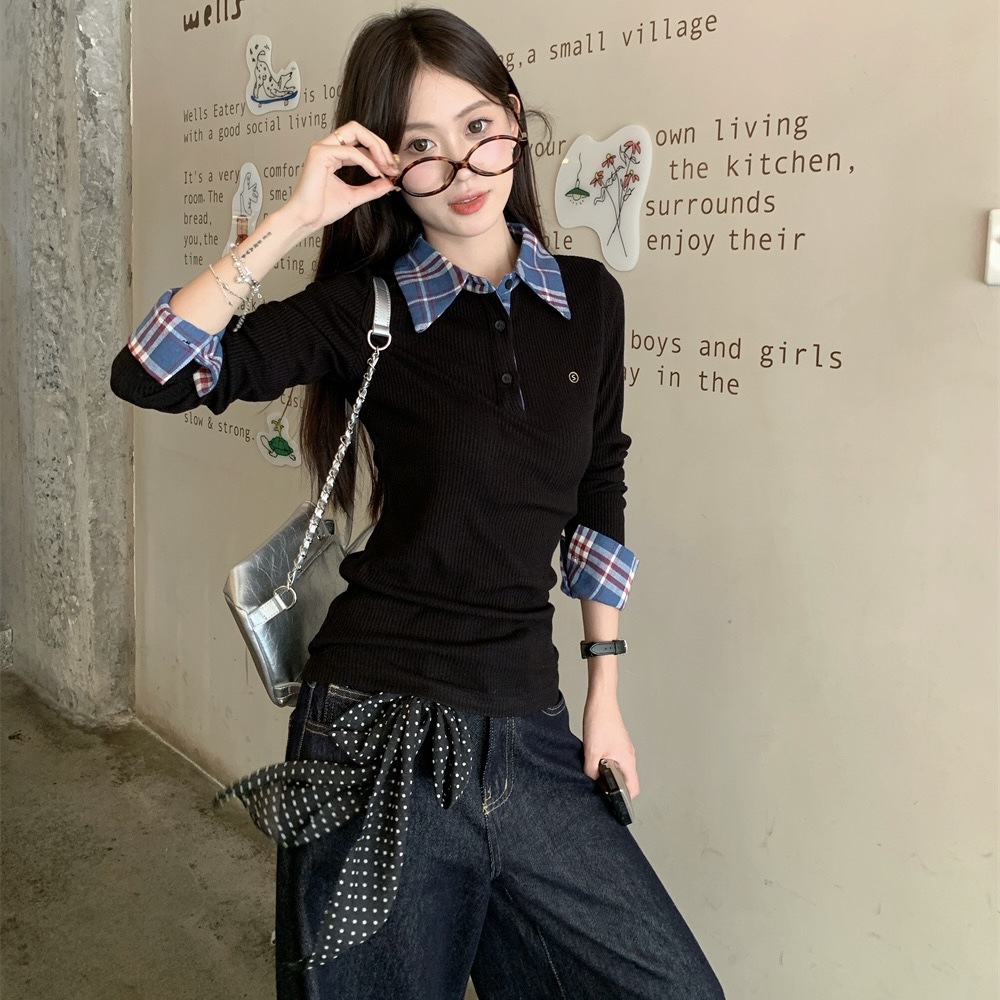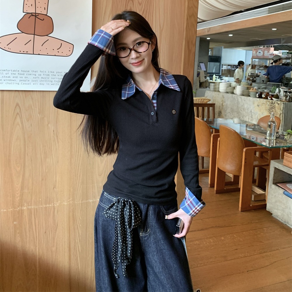 블랙 폴로 칼라 가짜 투피스 긴팔 티셔츠 여성용 봄과 가을 디자인 센스 슬림베이스 니트 탑