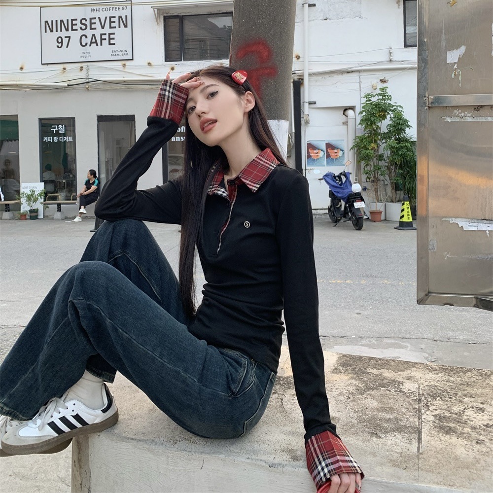 블랙 폴로 칼라 가짜 투피스 긴팔 티셔츠 여성용 봄과 가을 디자인 센스 슬림베이스 니트 탑스토어 가기