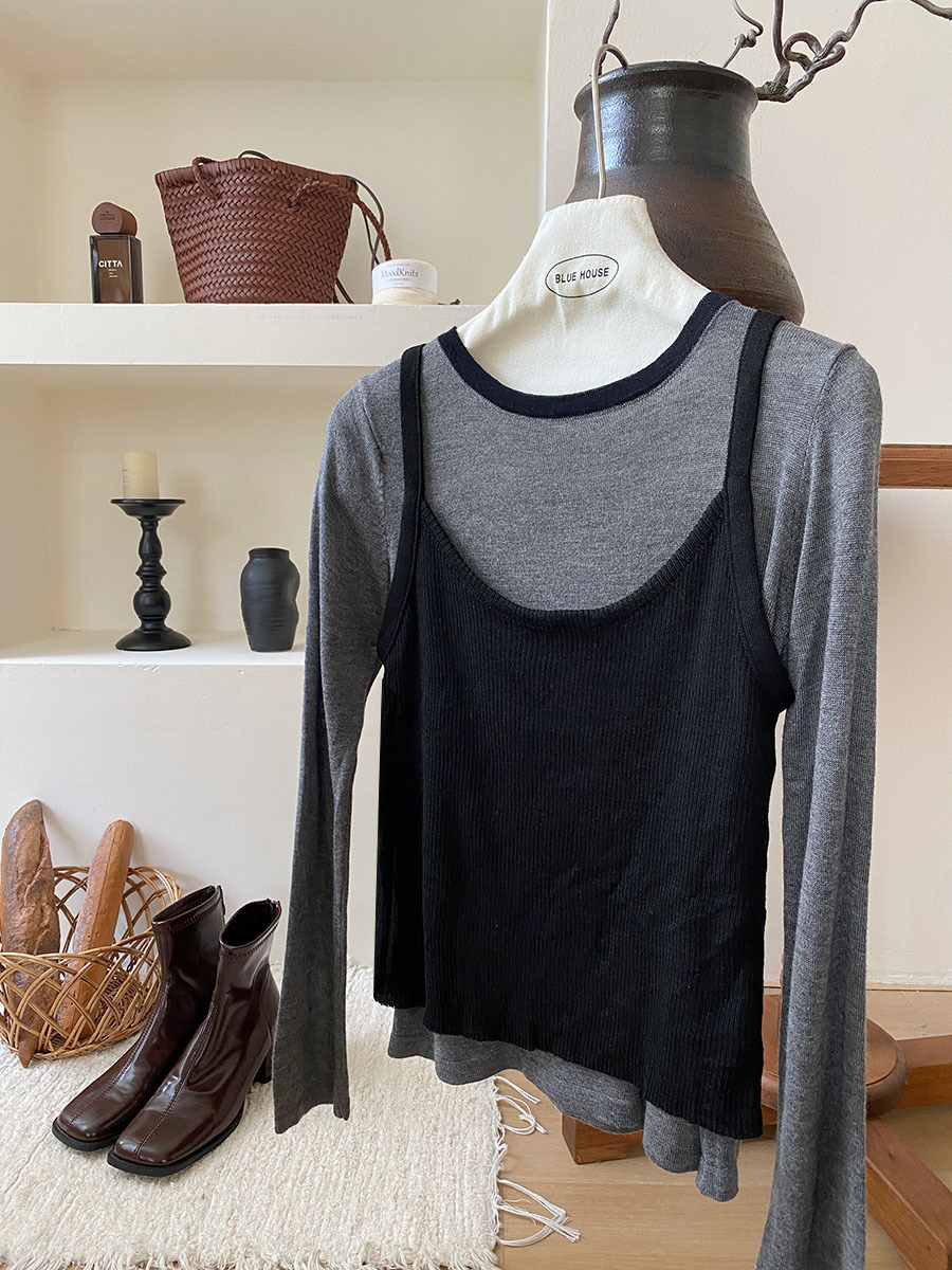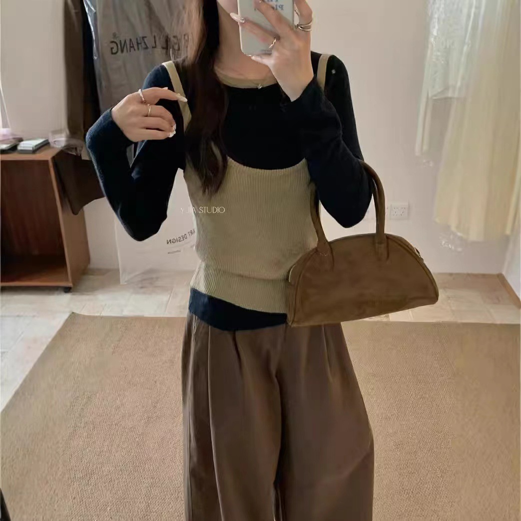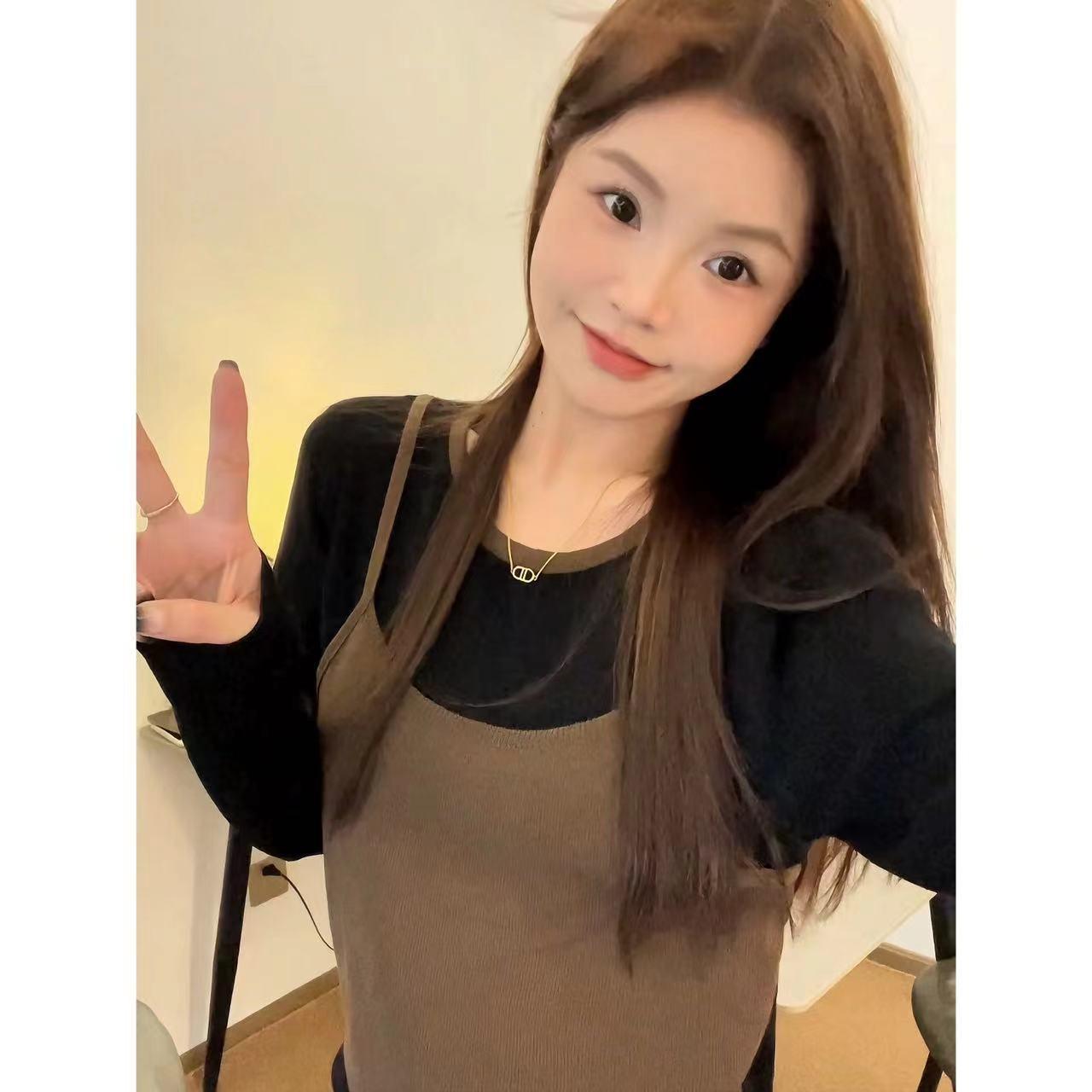 한국식 이른 봄 스웨터 대비 컬러 라운드 넥 슬리밍 올 매치 긴 소매베이스 니트 스웨터 우아한 니트 조끼 세트