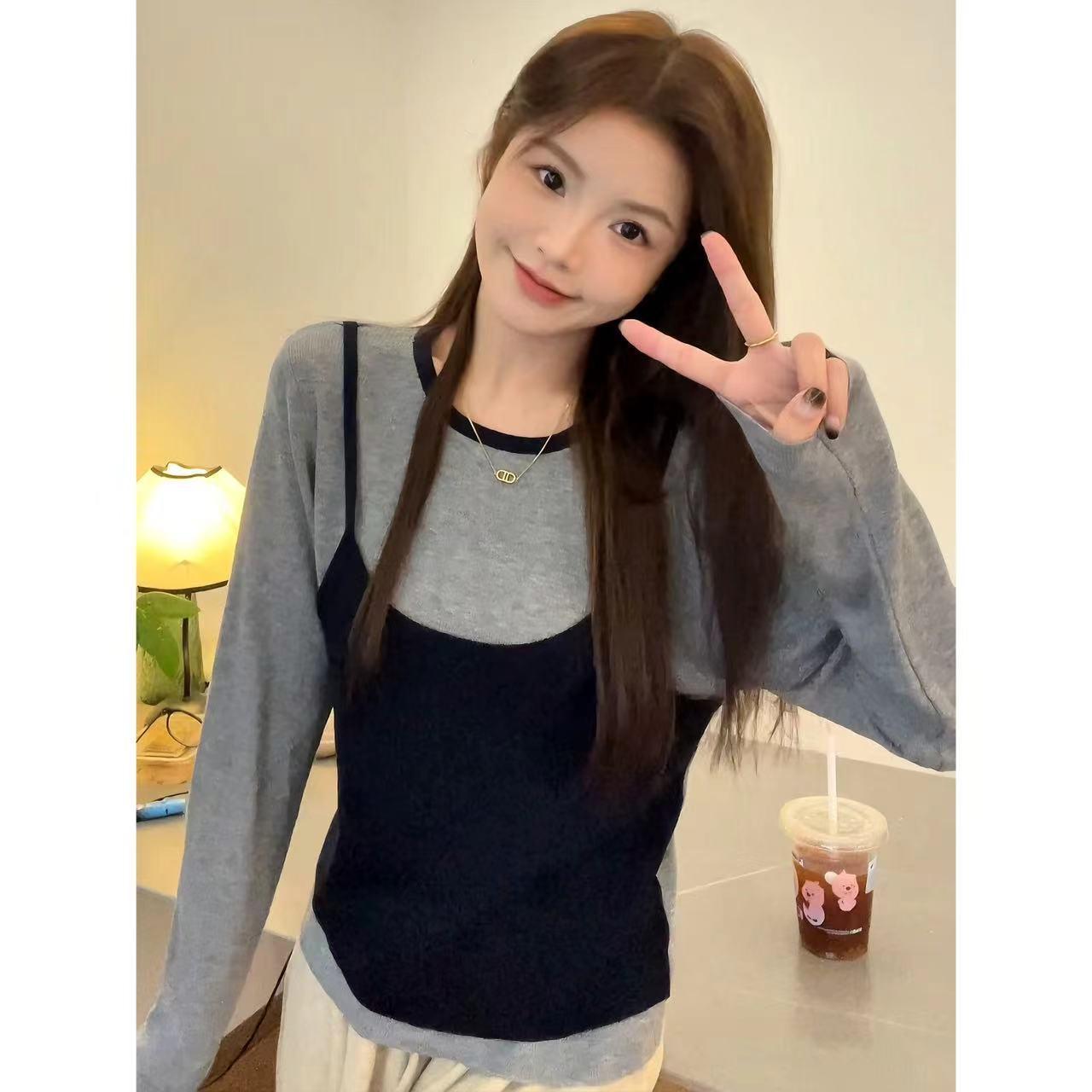 한국식 이른 봄 스웨터 대비 컬러 라운드 넥 슬리밍 올 매치 긴 소매베이스 니트 스웨터 우아한 니트 조끼 세트스토어 가기