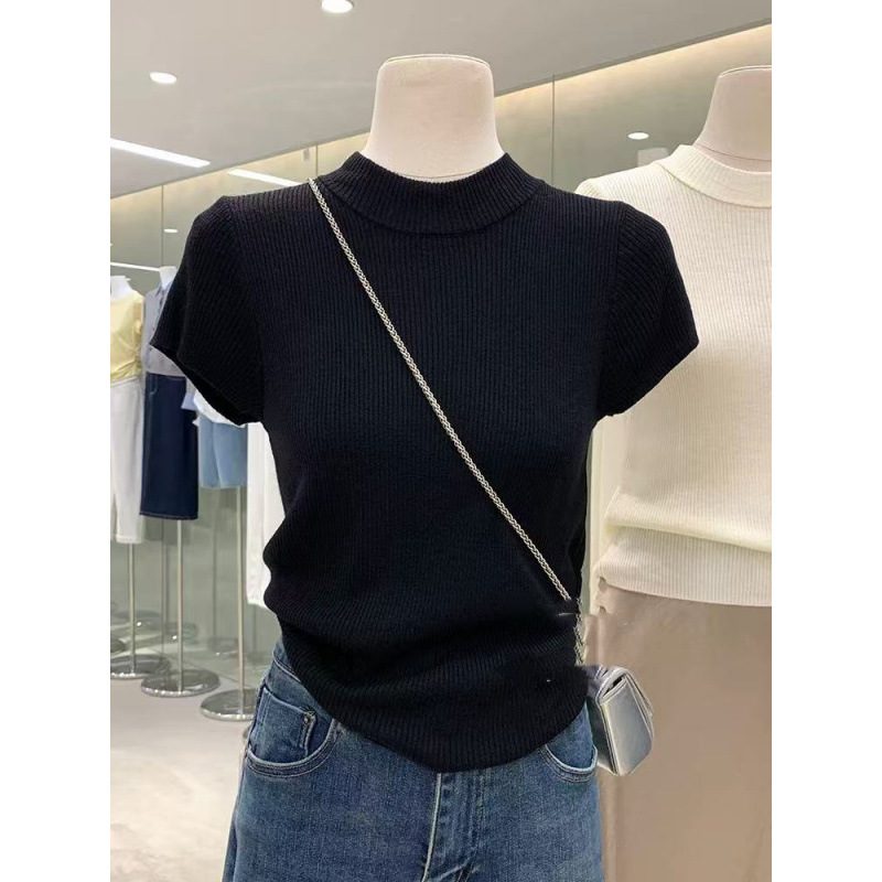 몇 조각으로 시작하십시오! 솔리드 컬러 하프 하이 넥 니트 반팔 티셔츠 여성용 슬림핏 슬리밍 짧은 내부베이스 탑스토어 가기