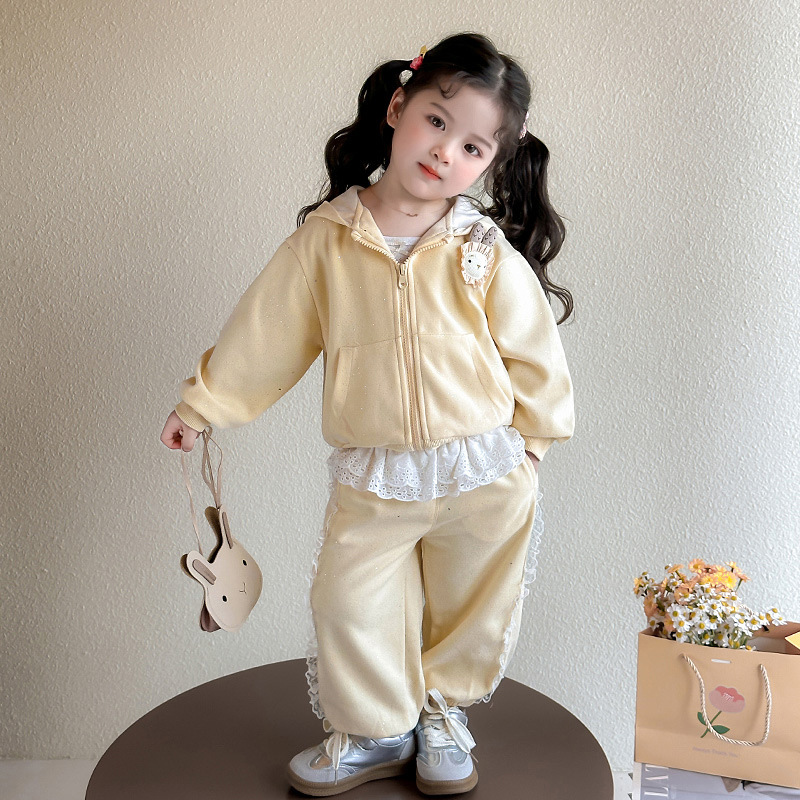 소녀 후드 세트 봄 2025 새로운 서양식 어린이 보물 레이스 캐주얼 착용 재킷 한국 투피스 세트