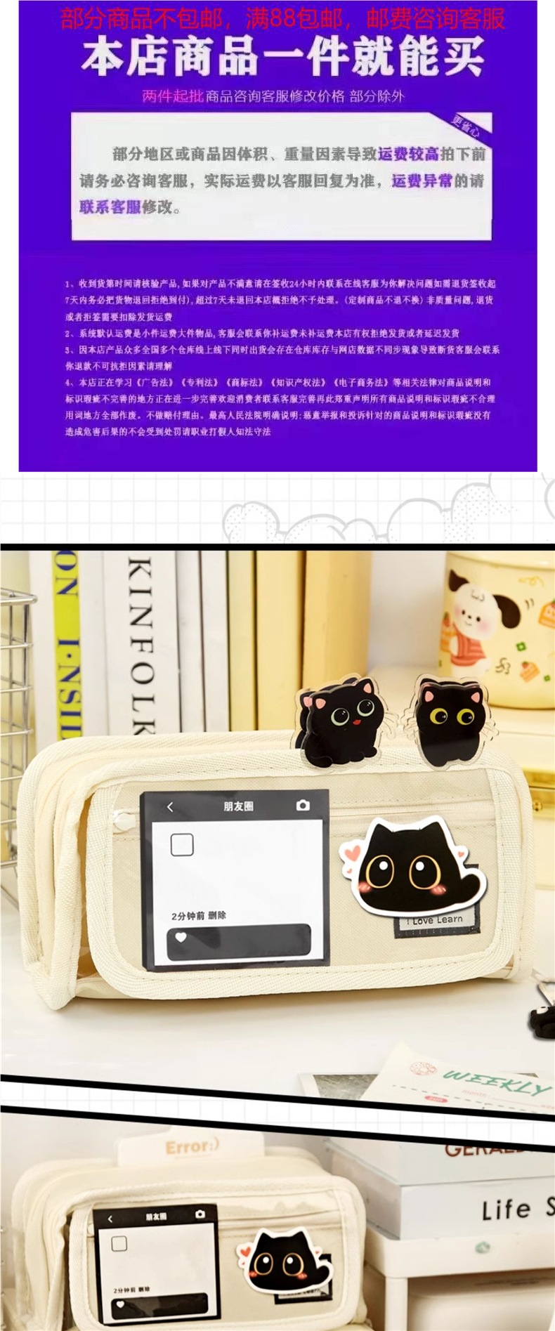• [업그레이드 및 두꺼워짐] 흰색 필통 + 스티커 5개 + 검은 고양이 클립 2개 + 펜던트