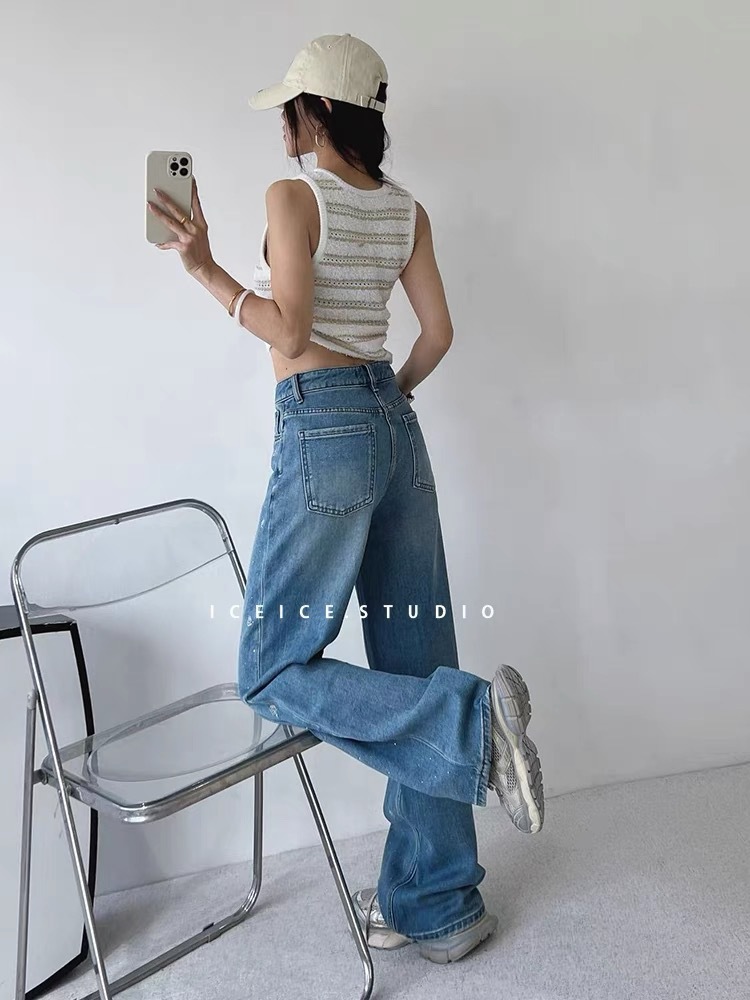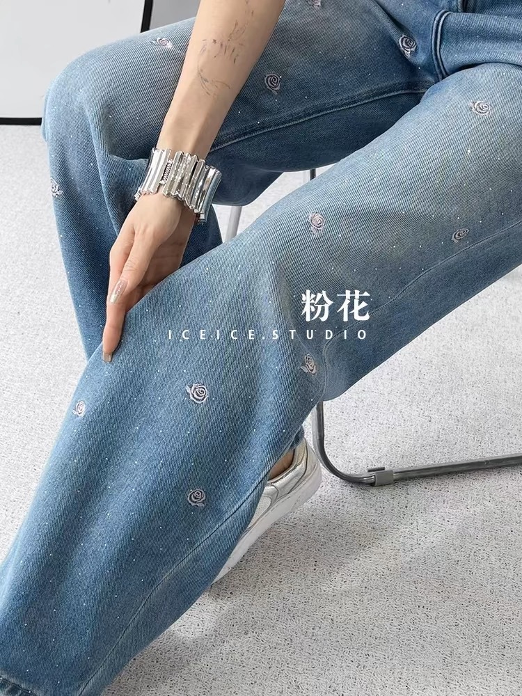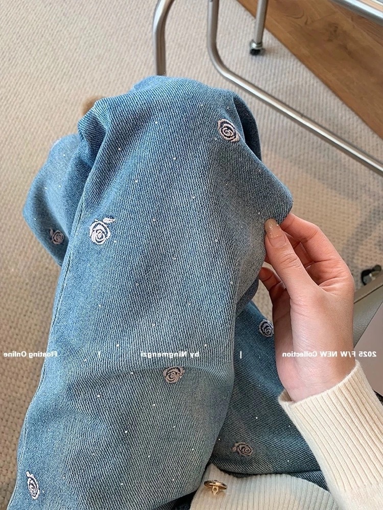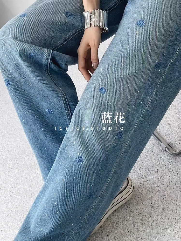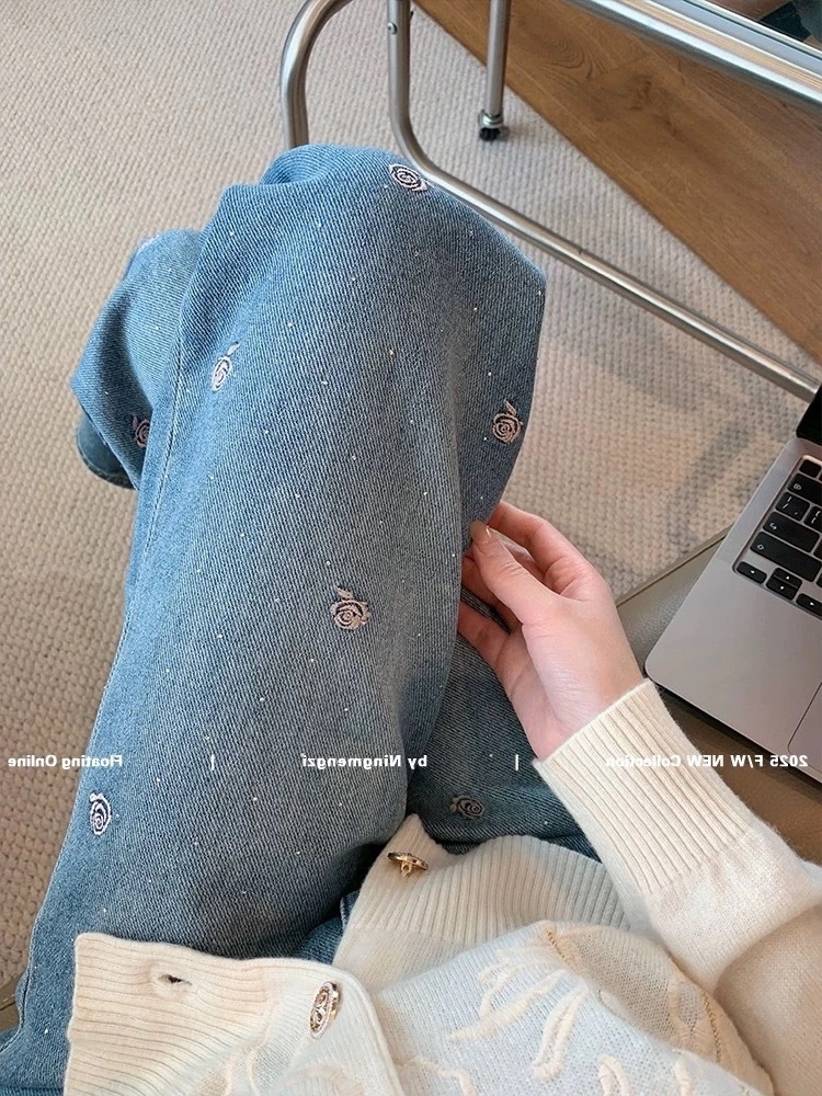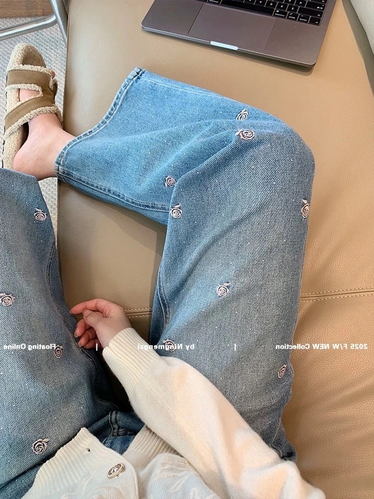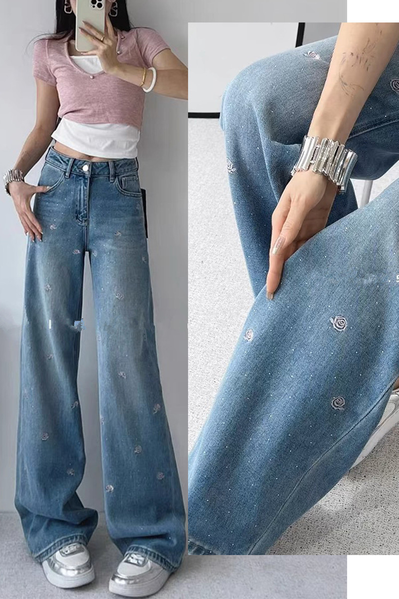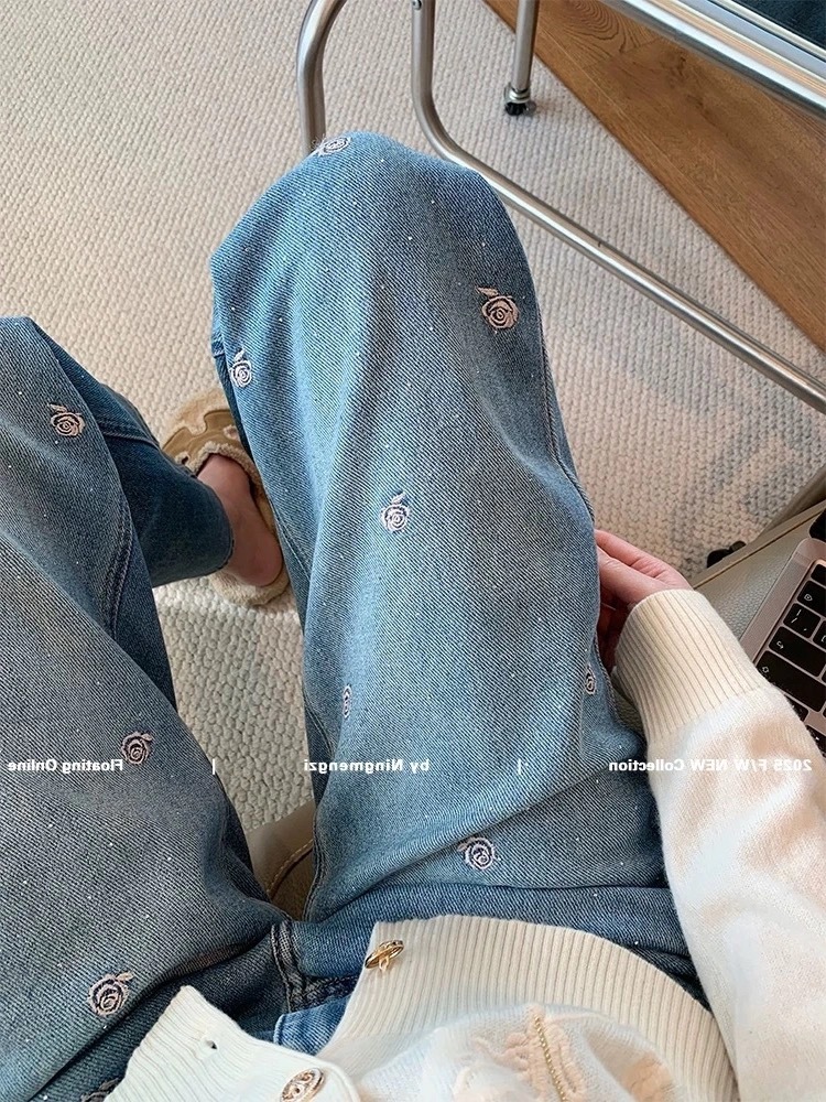 밝은 색상 디자인 자수 청바지 여성의 여름 새로운 높은 허리 느슨한 슬림 넓은 다리 좁은 버전 스트레이트 유행 바지스토어 가기