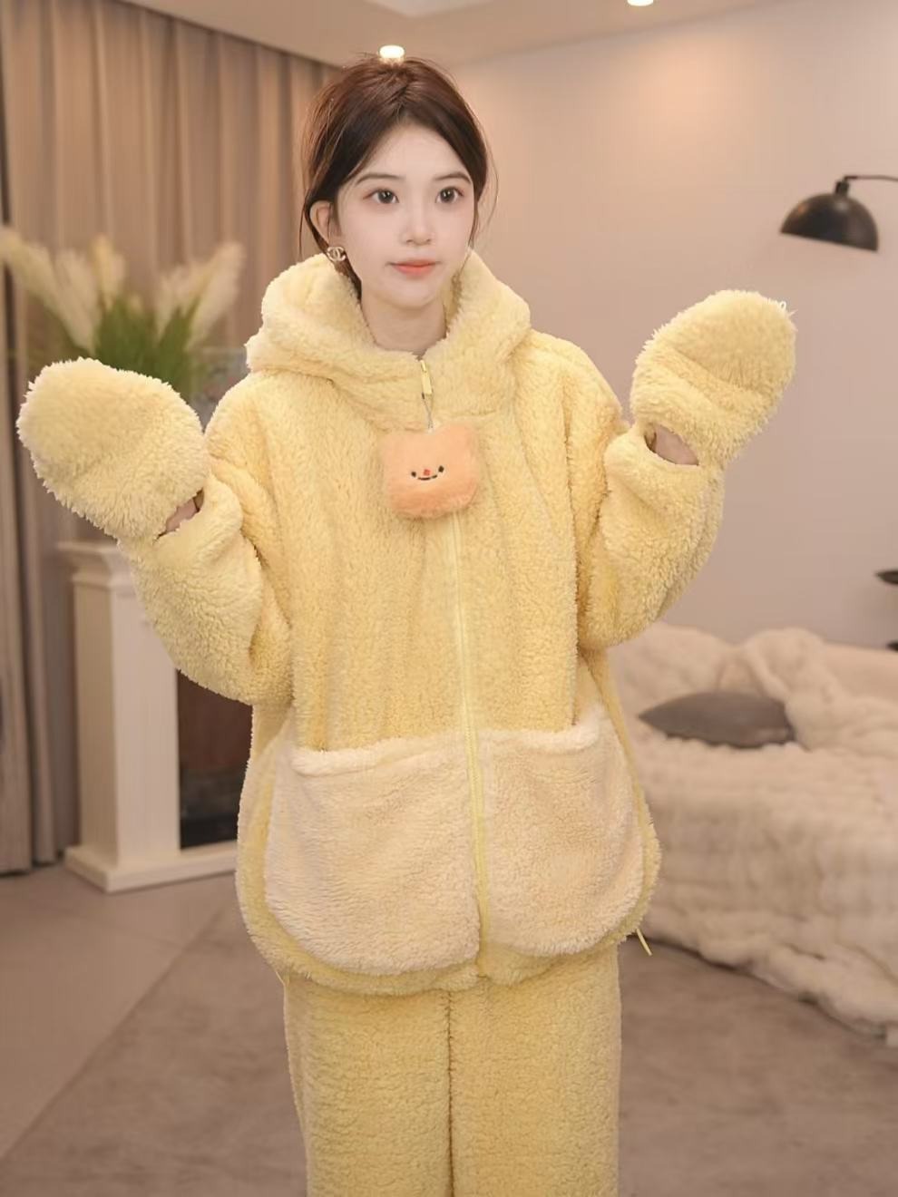 [버터베어 A] 홈 의류 잠옷 세트 여성용 겨울 두꺼운 후드 따뜻한 달콤하고 사랑스러운 아우터