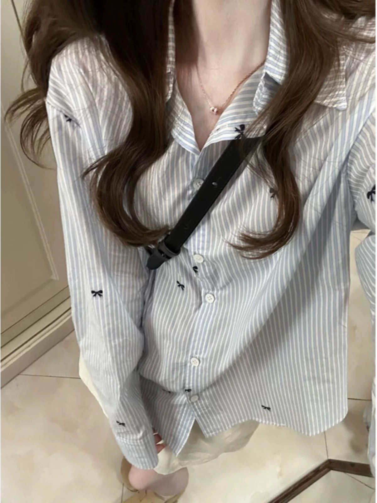 빈티지 활 블루 스트라이프 긴팔 셔츠 여성의 봄과 가을 느슨한 디자인 틈새 탑 올 매치 셔츠 트렌디스토어 가기
