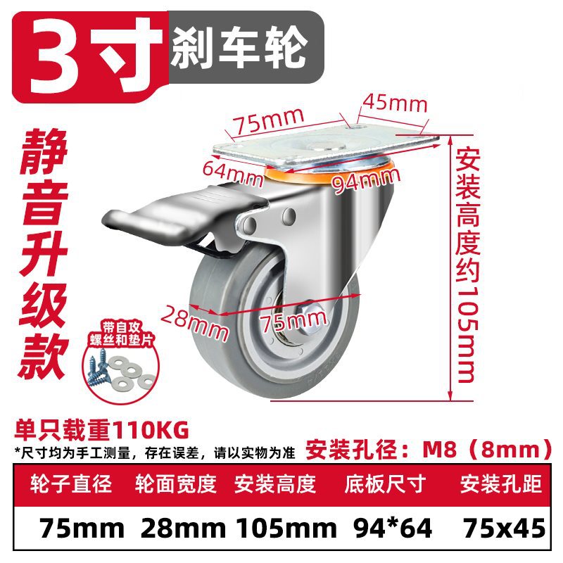 • 3inch 고무 범용 휠(브레이크 포함)(조용한 업그레이드)