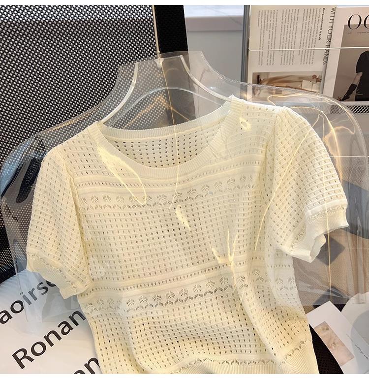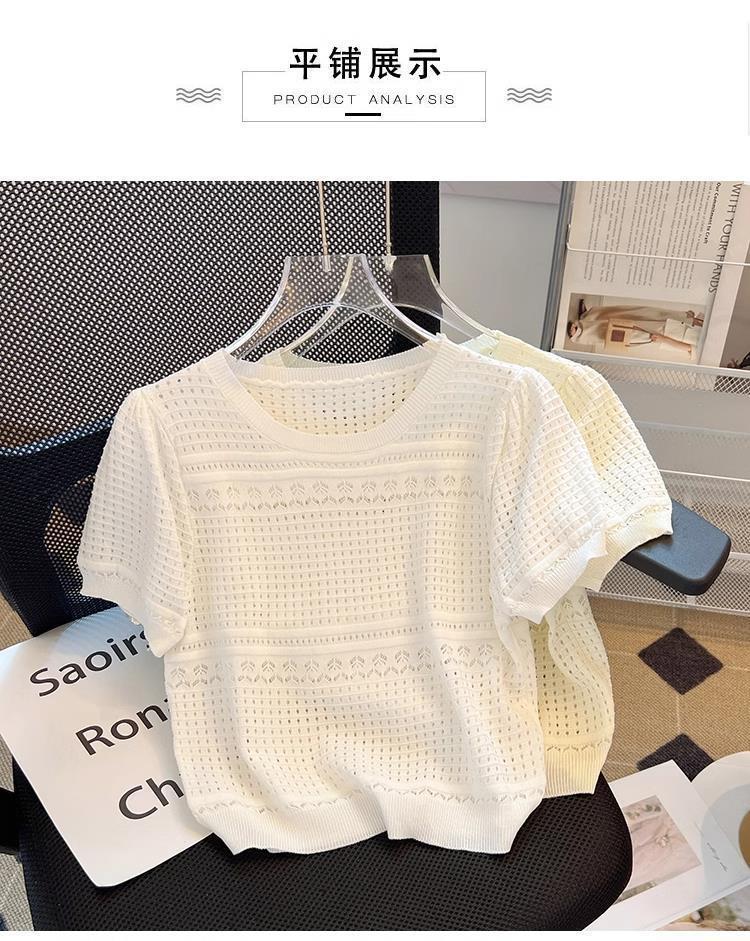 2024 새로운 아이스 실크 니트 스웨터 여성 화이트 여름 라운드 넥 샤넬 빈 반팔 셔츠 얇은 풀오버 탑