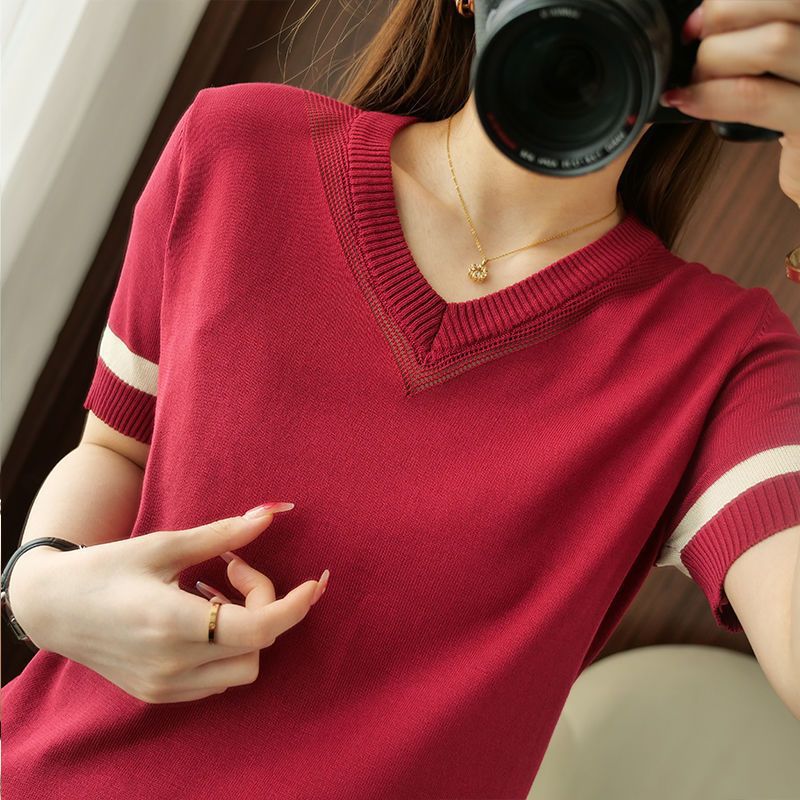 • 브릭 레드 브이넥 아이스 실크 반소매