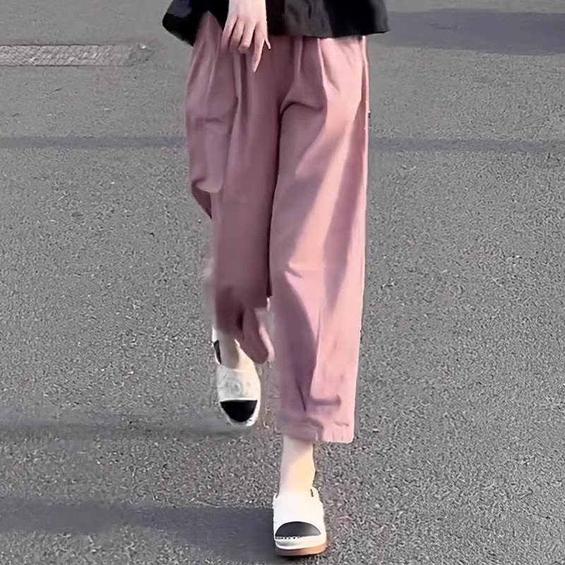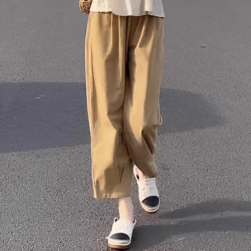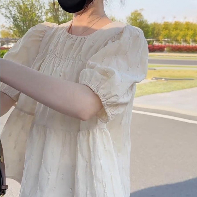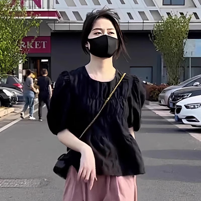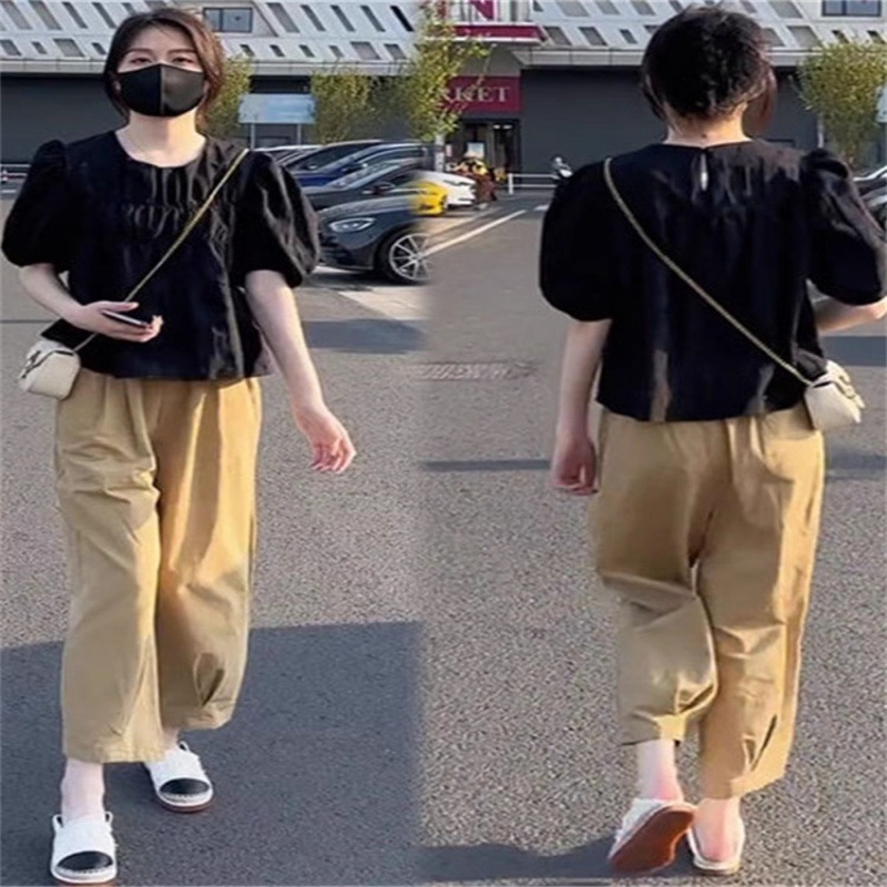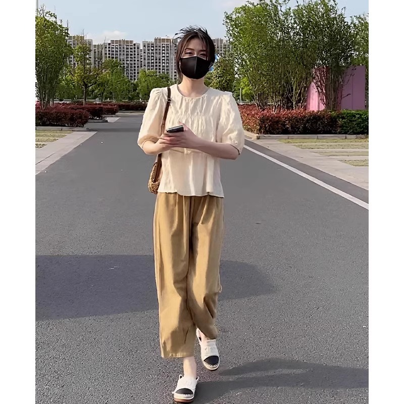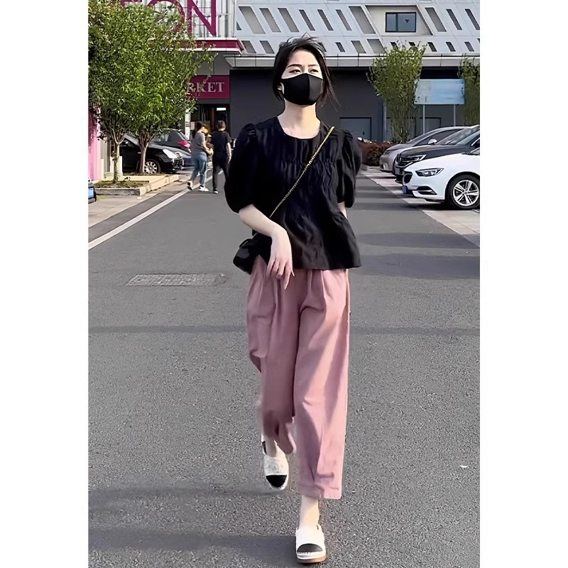 작은 인형 셔츠 주름 반팔 셔츠 최고 여름 세트 여성의 새로운 캐주얼 스트레이트 와이드 다리 9 포인트스토어 가기