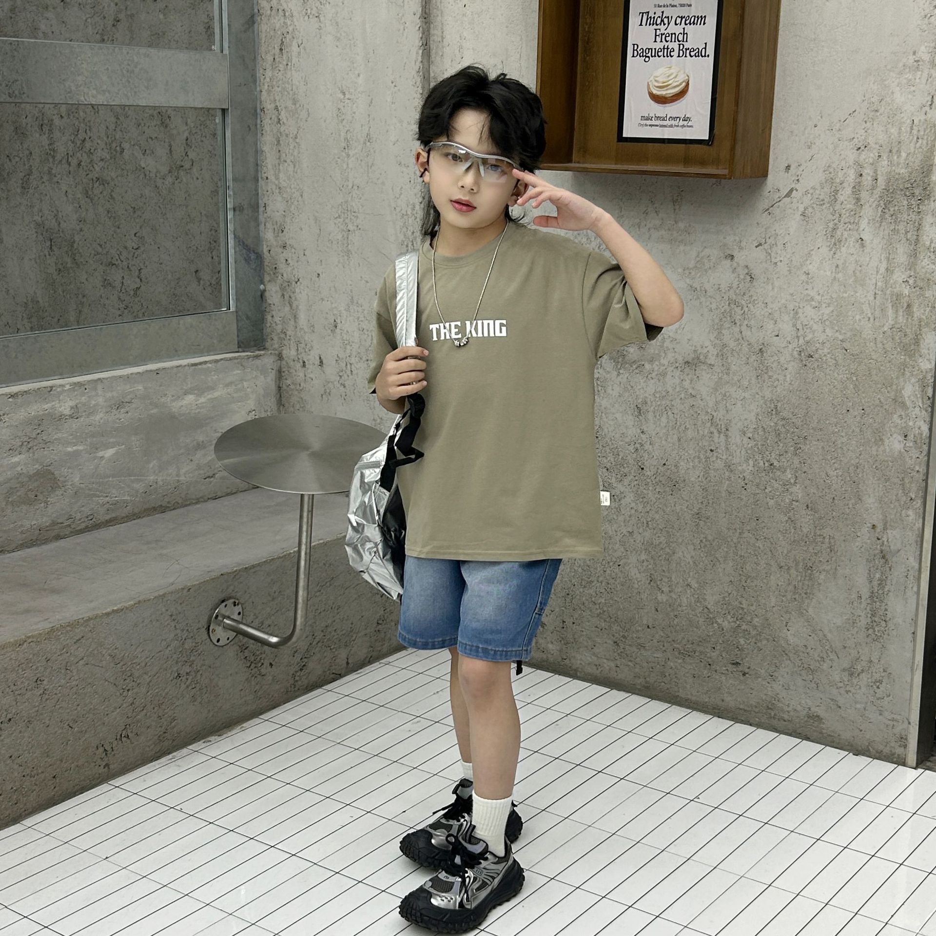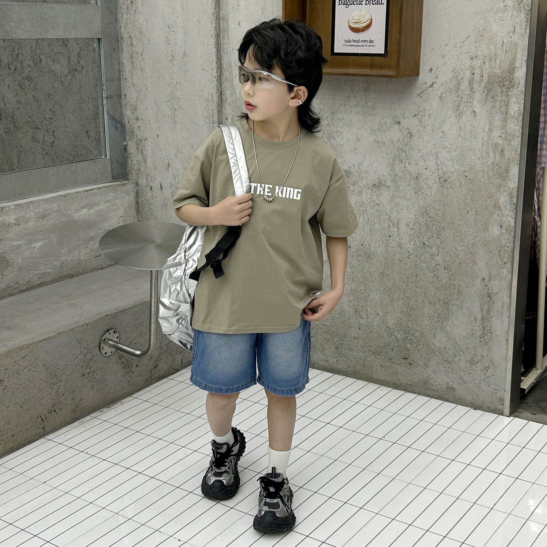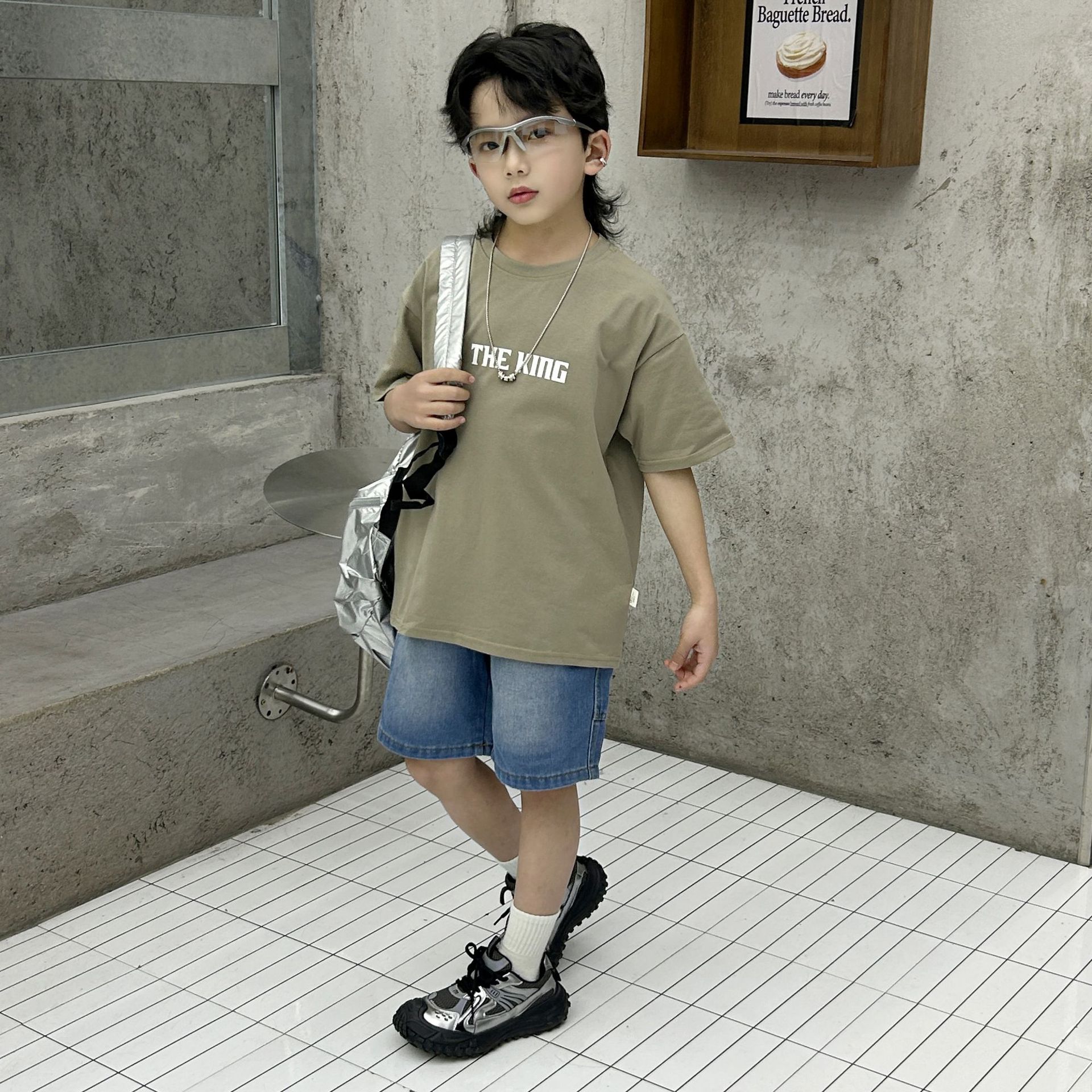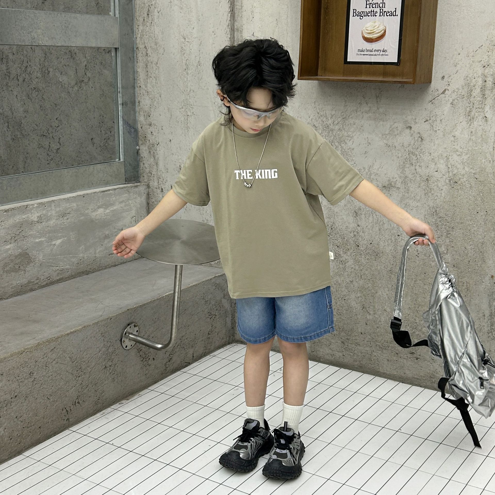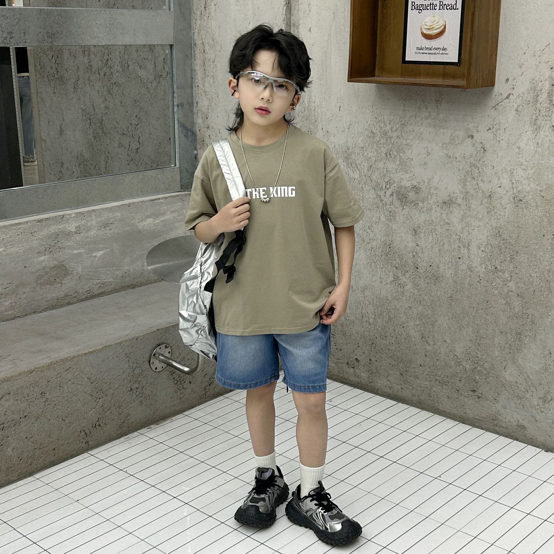 소년 여름 반팔 티셔츠 2025 새로운 어린이 탑 어린이 반팔 티셔츠 데님 반바지 세트 트렌디스토어 가기