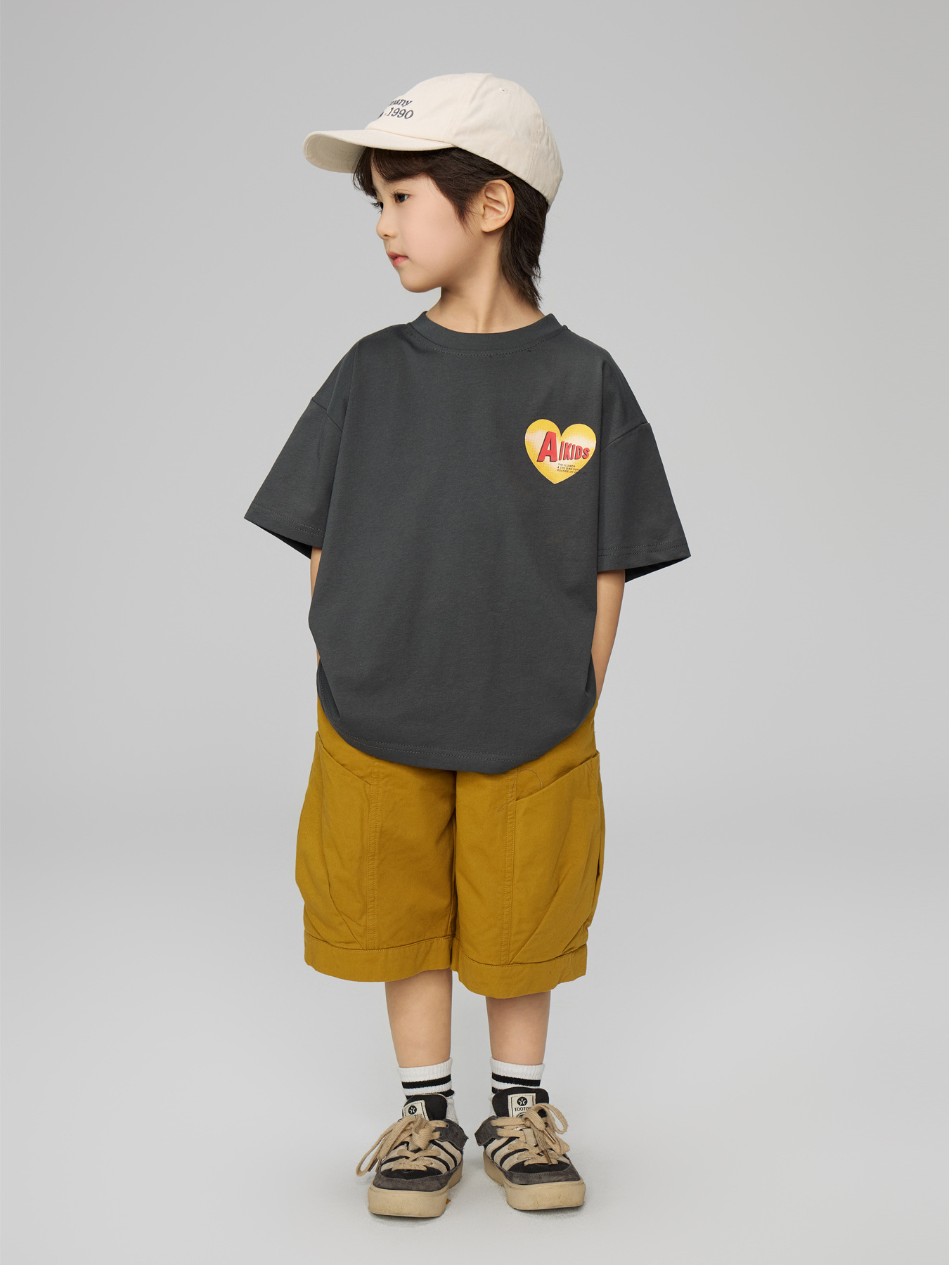 2025 여름 새로운 어린이 서양식 홍콩 스타일 느슨한 반팔 남성 중대형 어린이 캐주얼 라운드 넥 러브 프린트 티셔츠스토어 가기