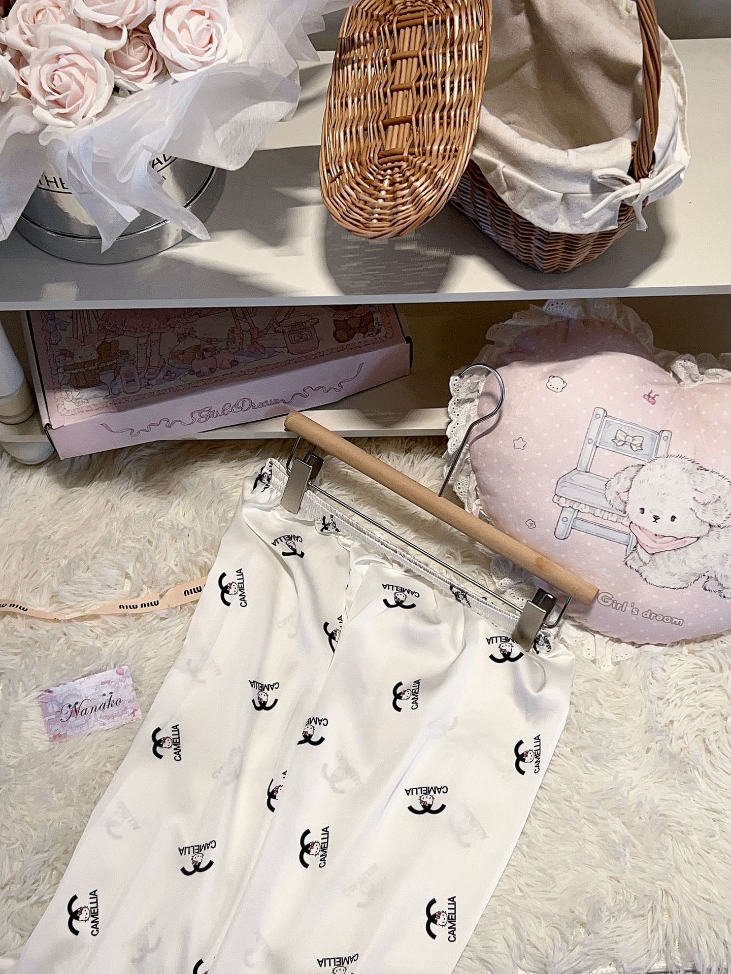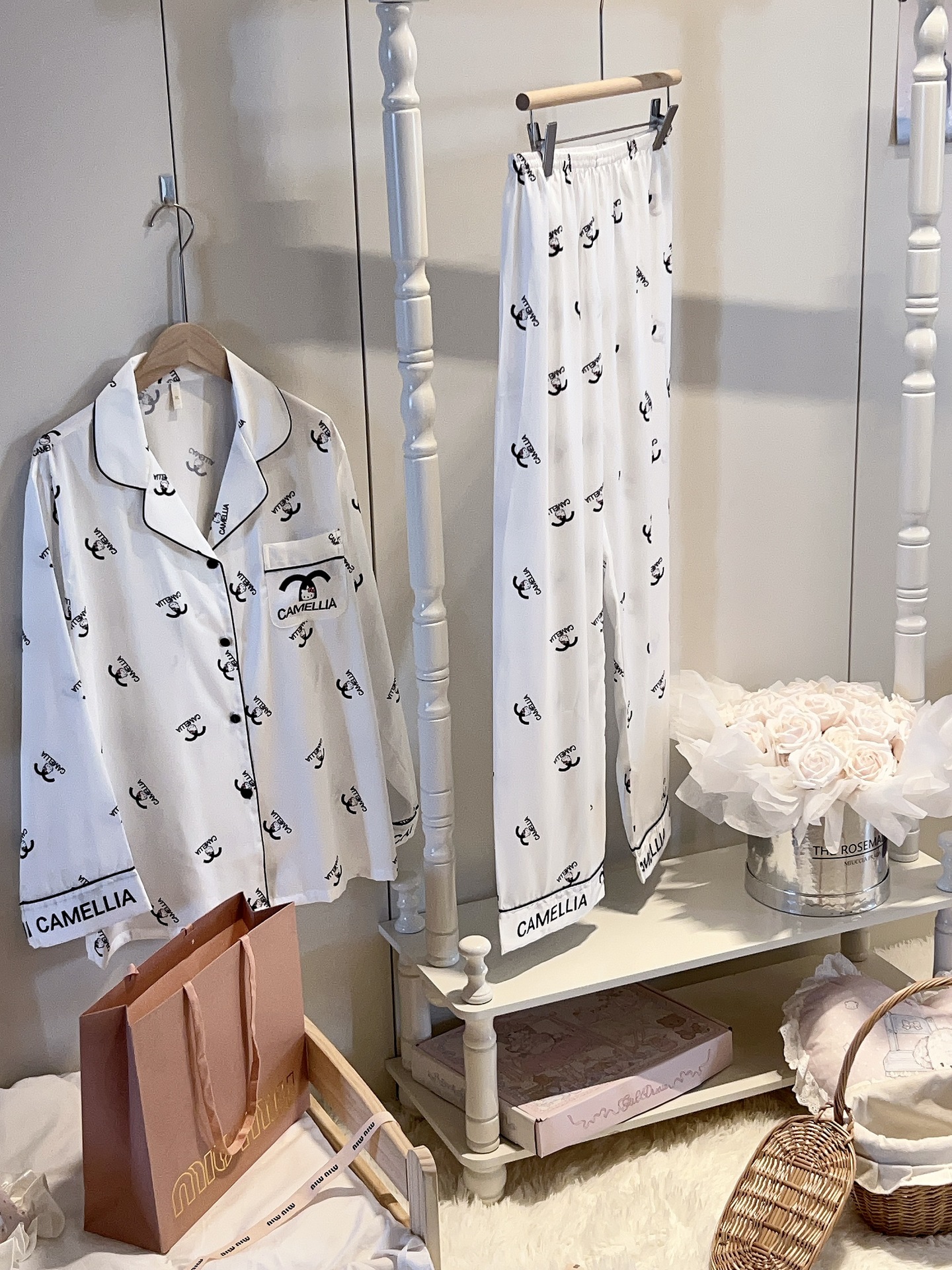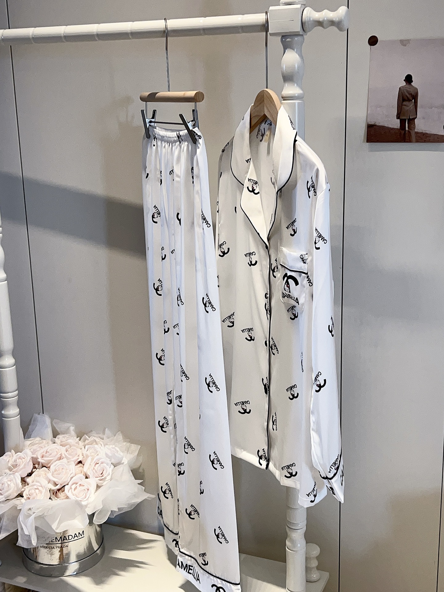 2025 봄과 여름 새로운 잠옷 여성 긴팔 바지 아이스 실크 홈 의류 세트 샤넬 스타일 KT 고양이 달콤한 외모
