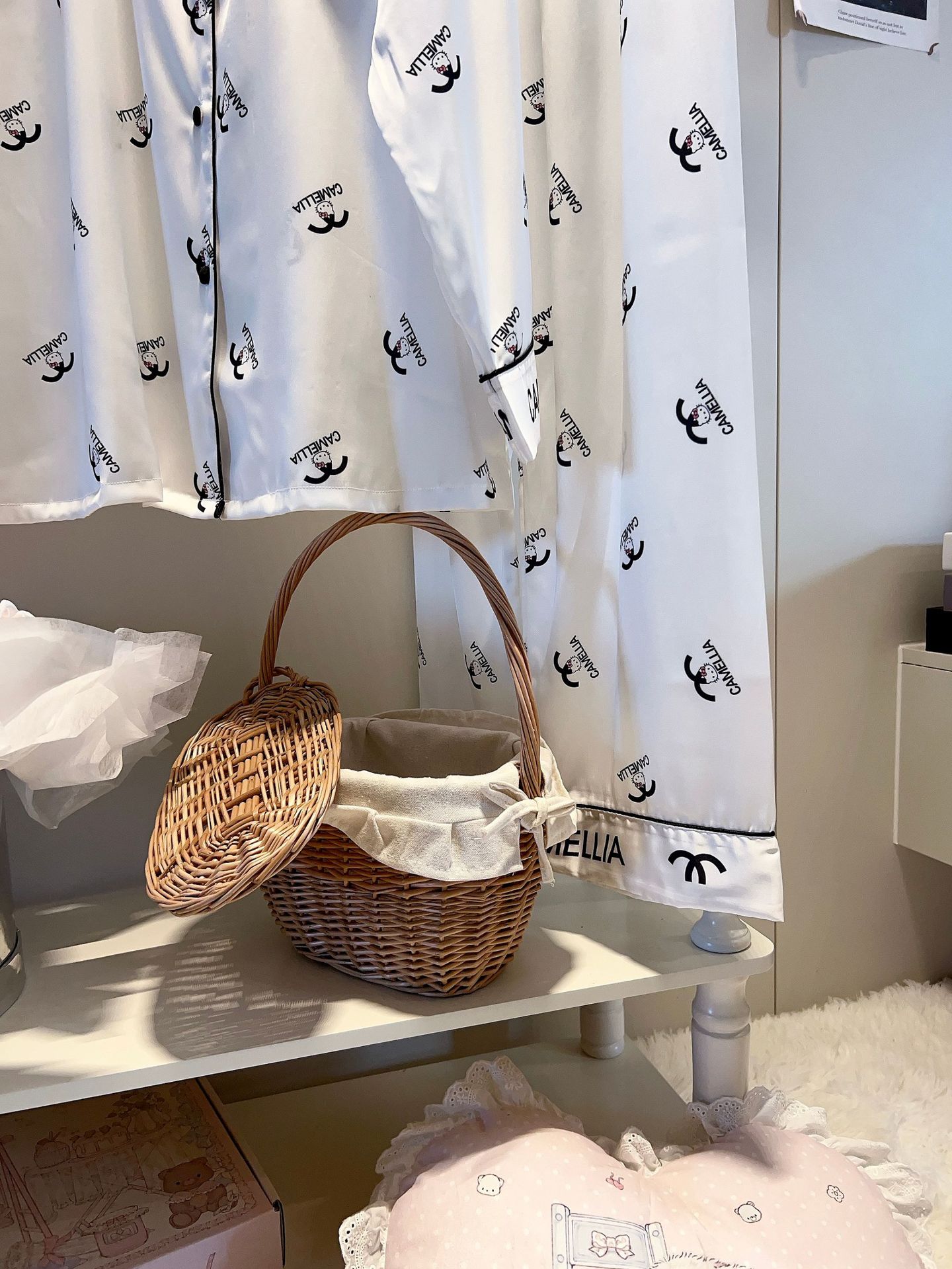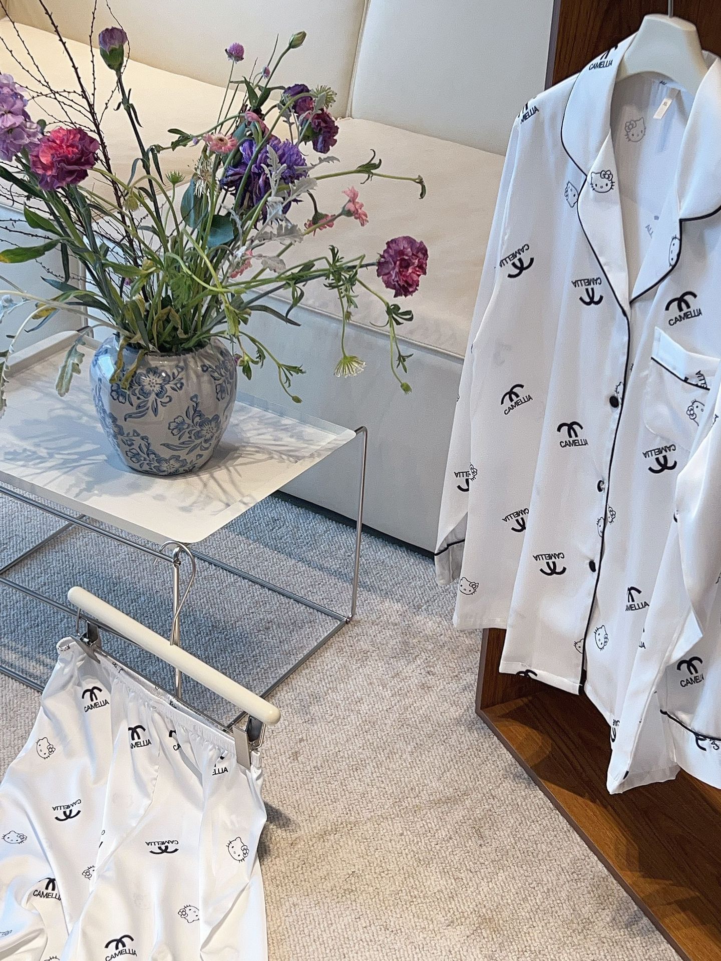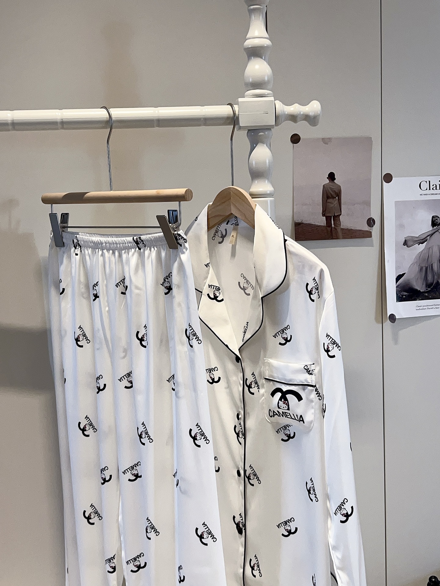 2025 봄과 여름 새로운 잠옷 여성 긴팔 바지 아이스 실크 홈 의류 세트 샤넬 스타일 KT 고양이 달콤한 외모스토어 가기