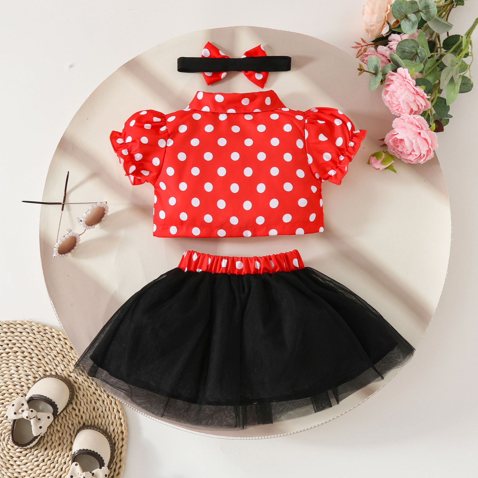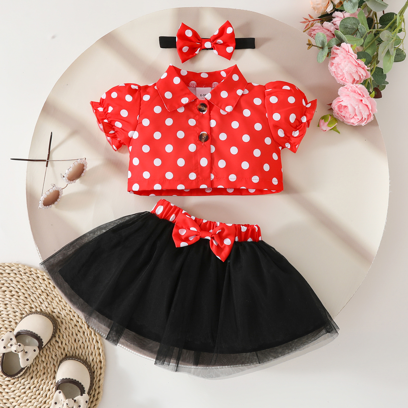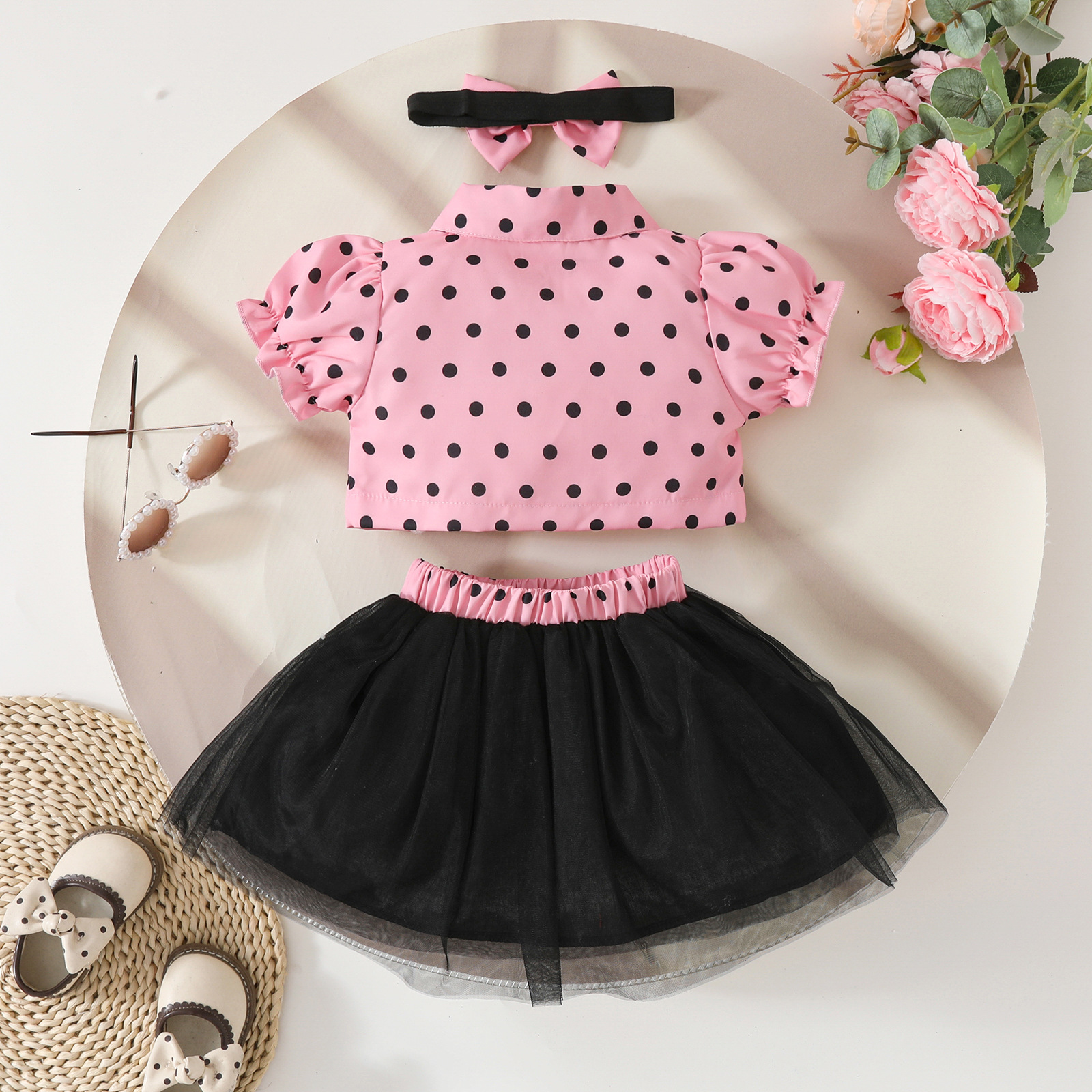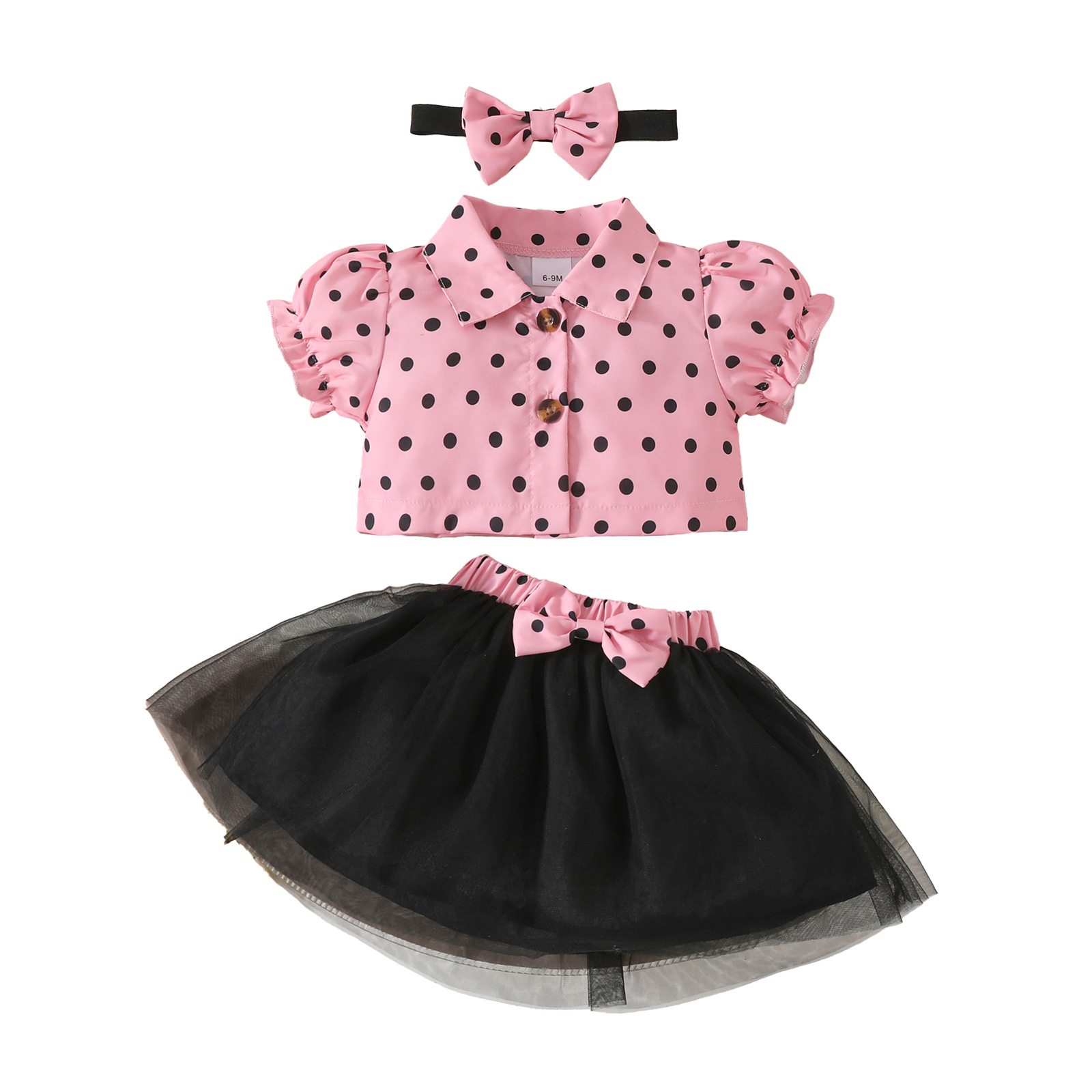 2025 여자 짧은 싱글 브레스트 반팔 재킷 블랙 메쉬 스커트 활 헤어 스트랩 스커트 3 피스 세트