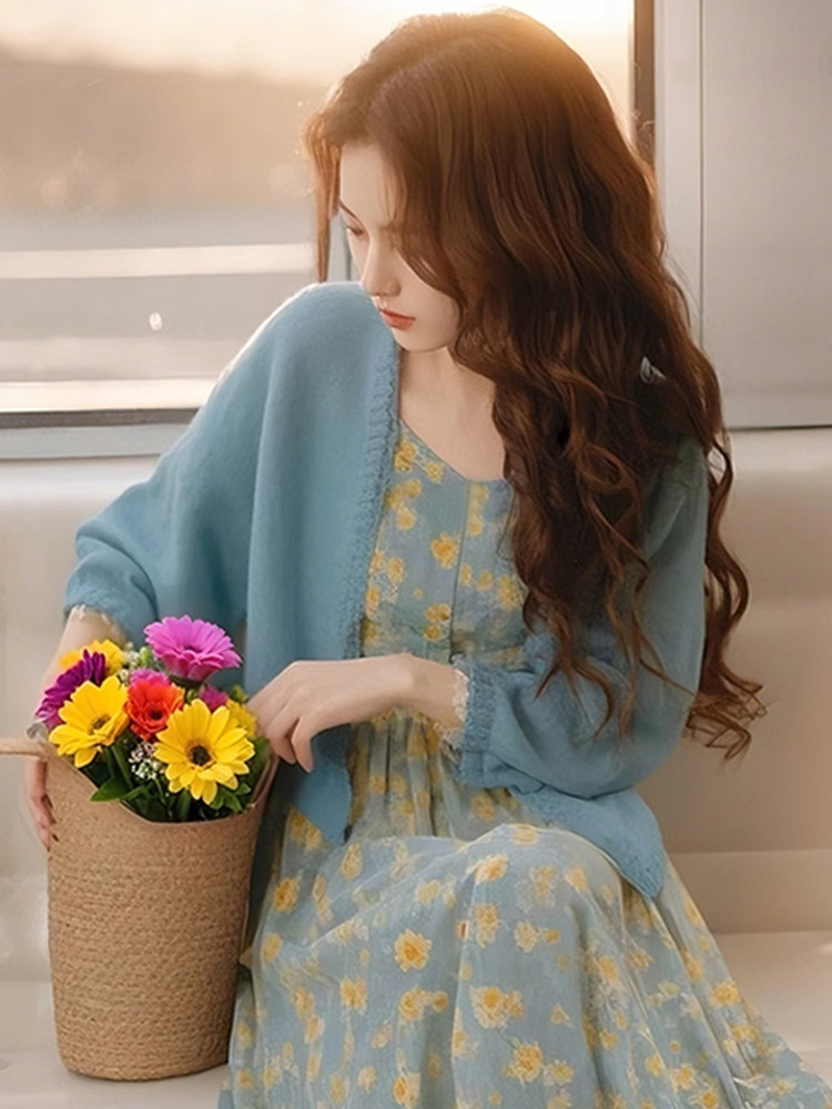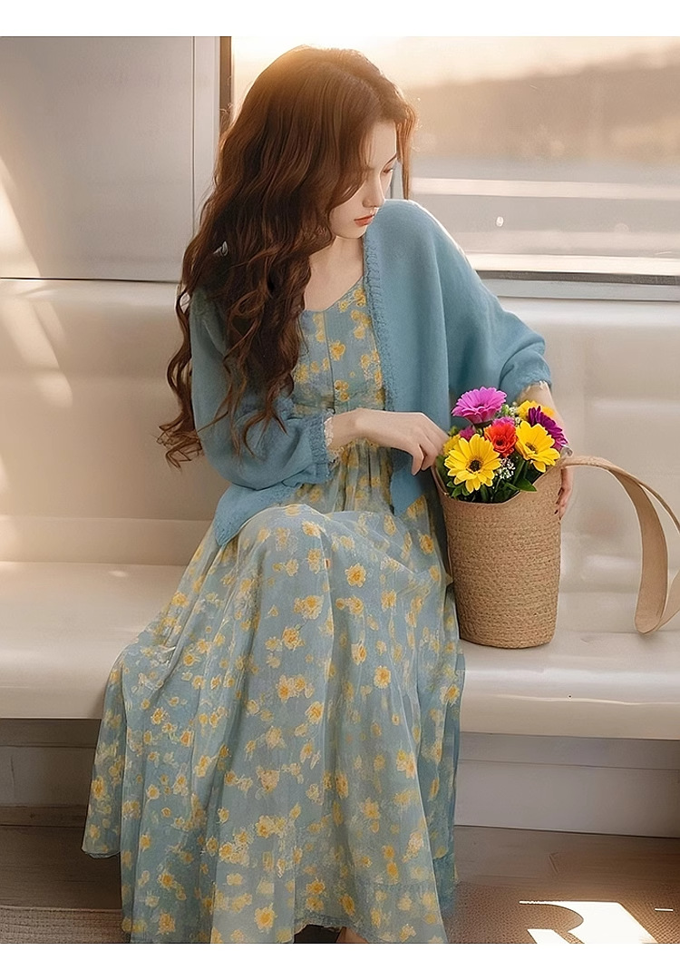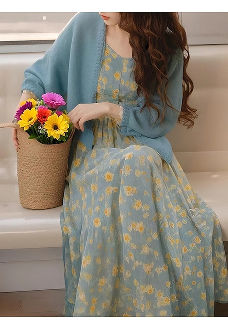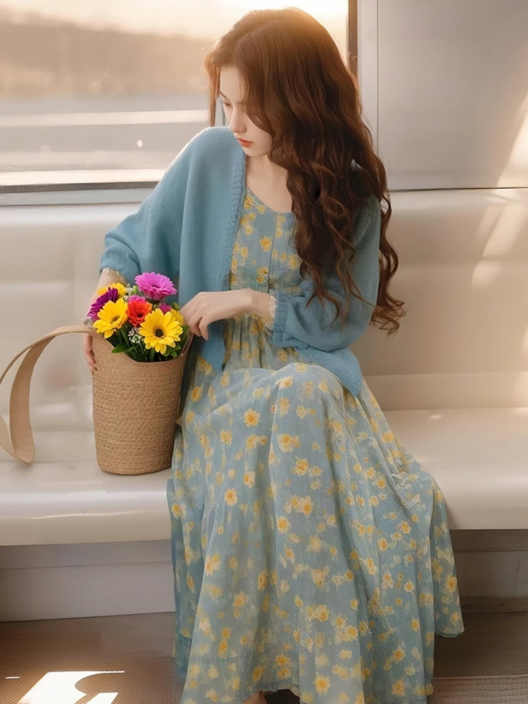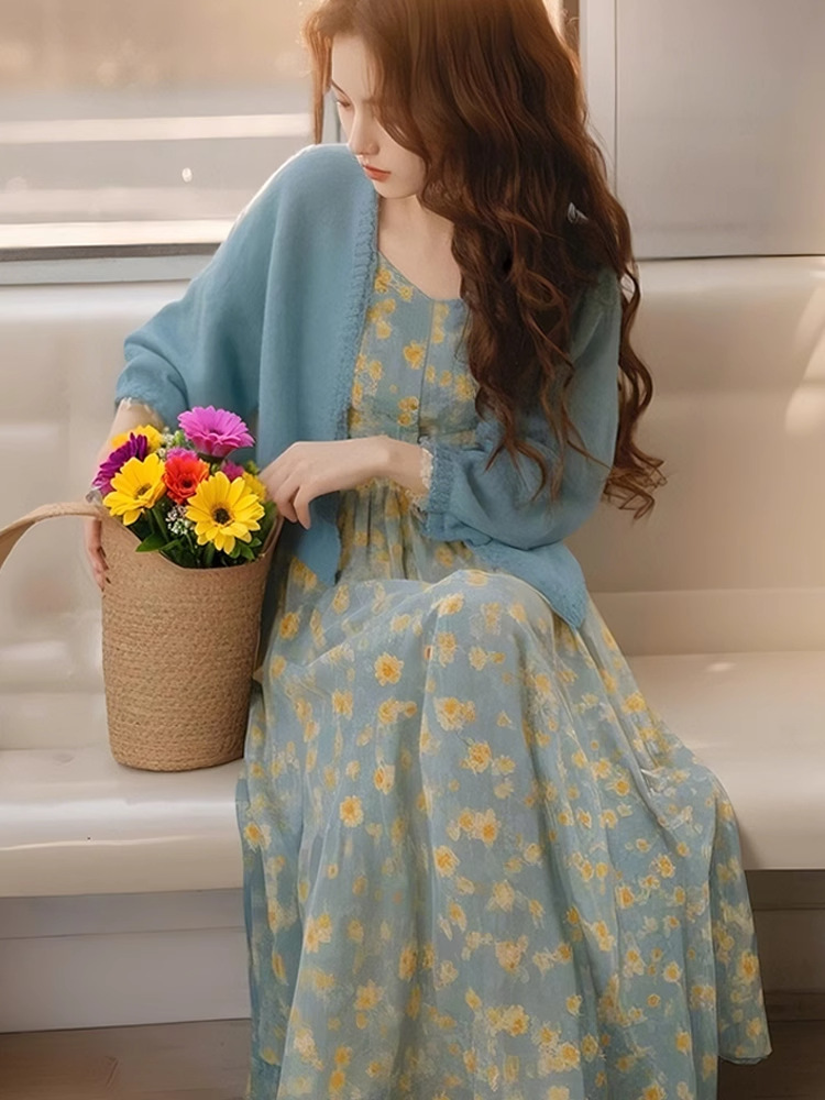 한국 스타일 블루 플로랄 원피스 세트 카디건 하이 엔드 우아한 여성 2025 슈퍼 인기 새 스커트스토어 가기