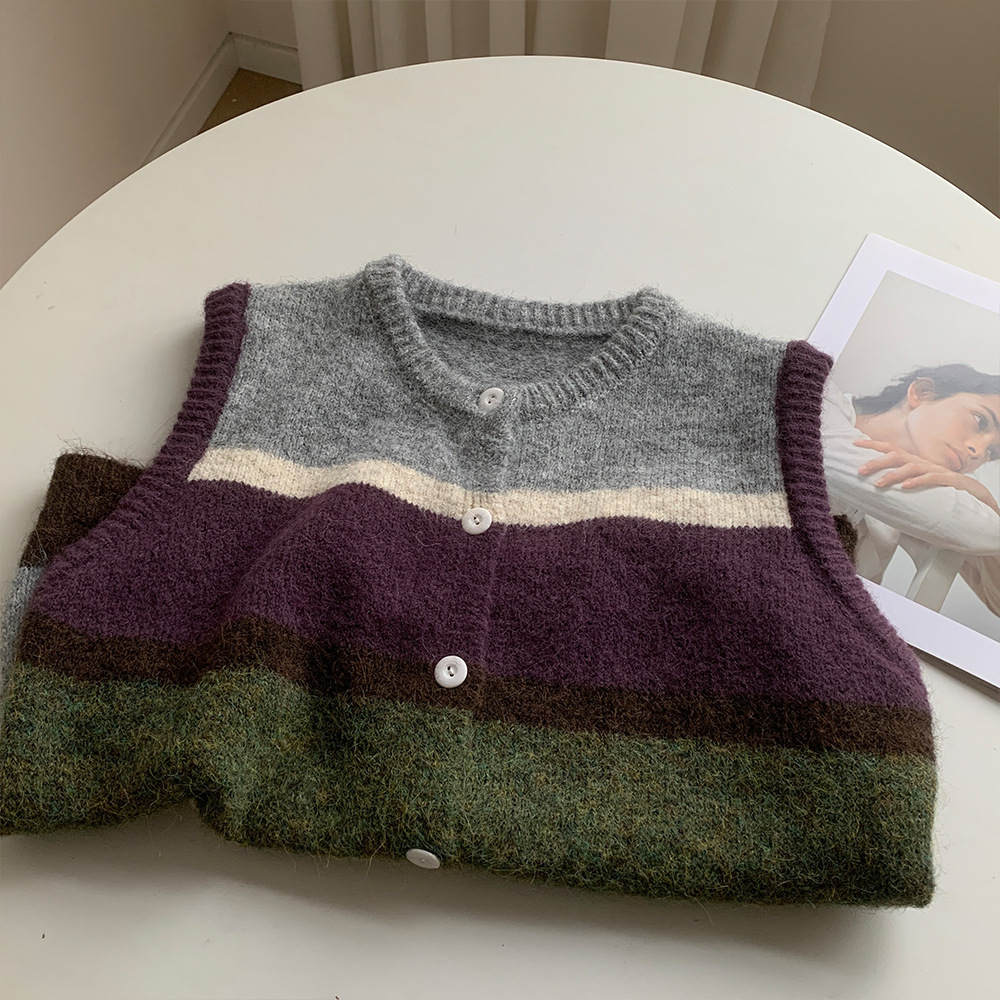 빈티지 아카데미 스타일 콘트라스트 컬러 스트립 니트 조끼 여성 한국식 봄 새로운 소프트 왁스 젠틀 스타일 올매치 스택 조끼