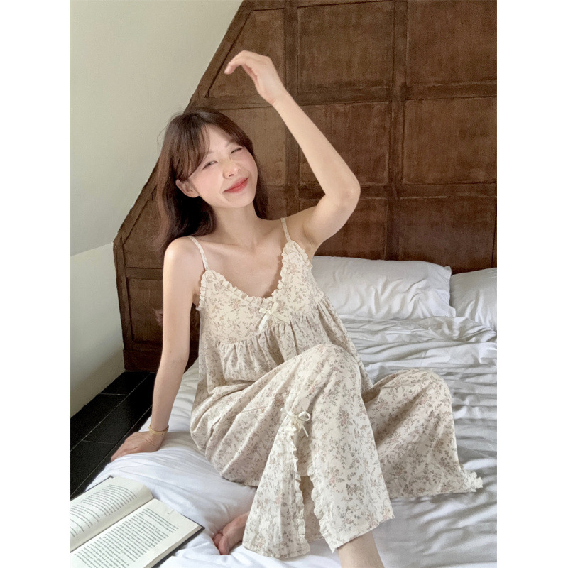 리얼 샷 2025 달콤한 활 레이스 더블 레이어 원사 꽃 무늬 스트랩 브래지어 가슴 패드 홈 옷 잠옷 세트스토어 가기