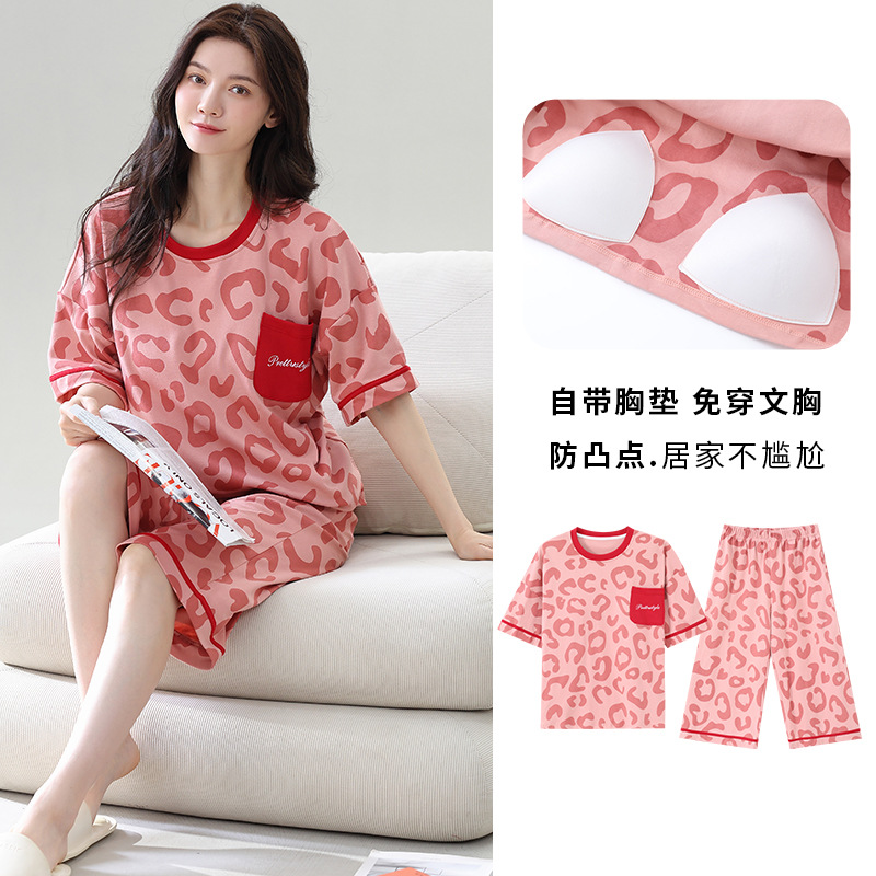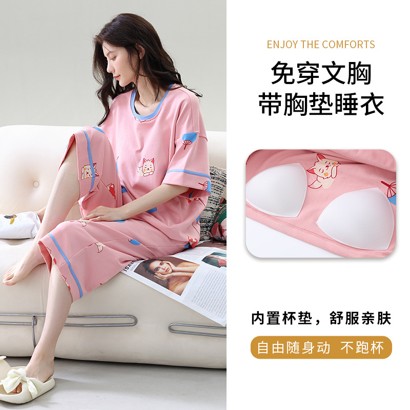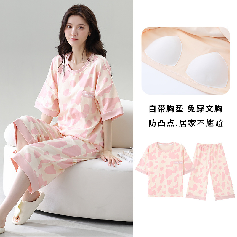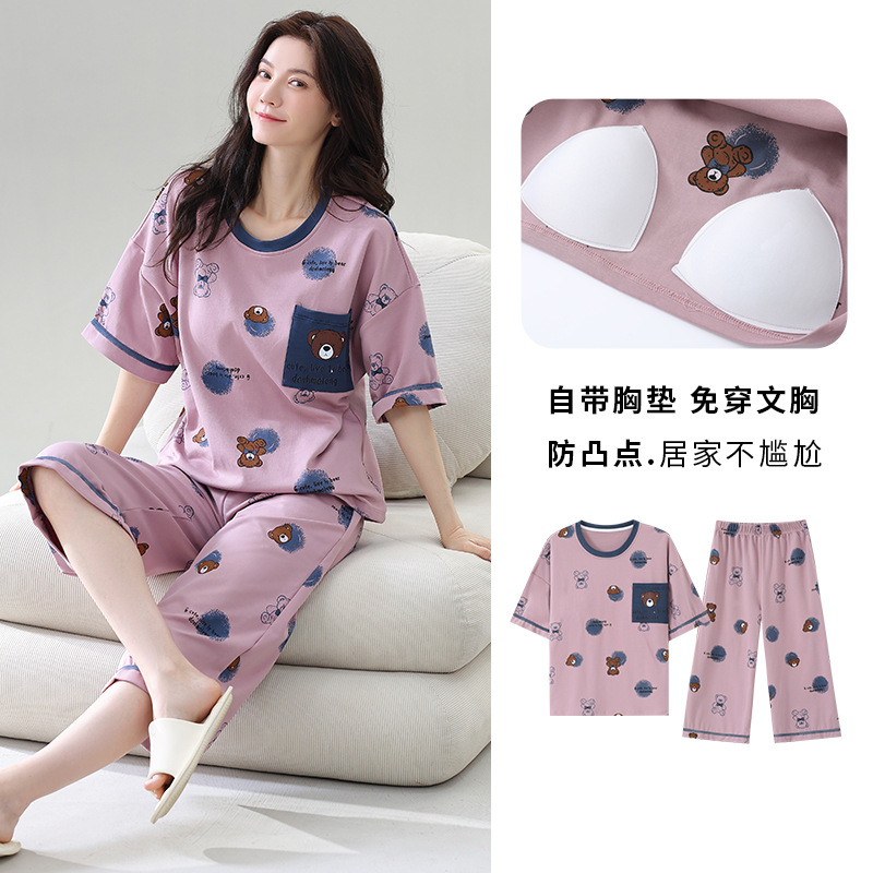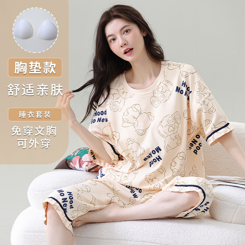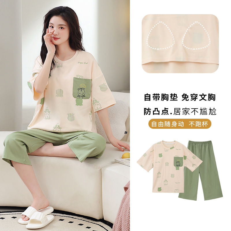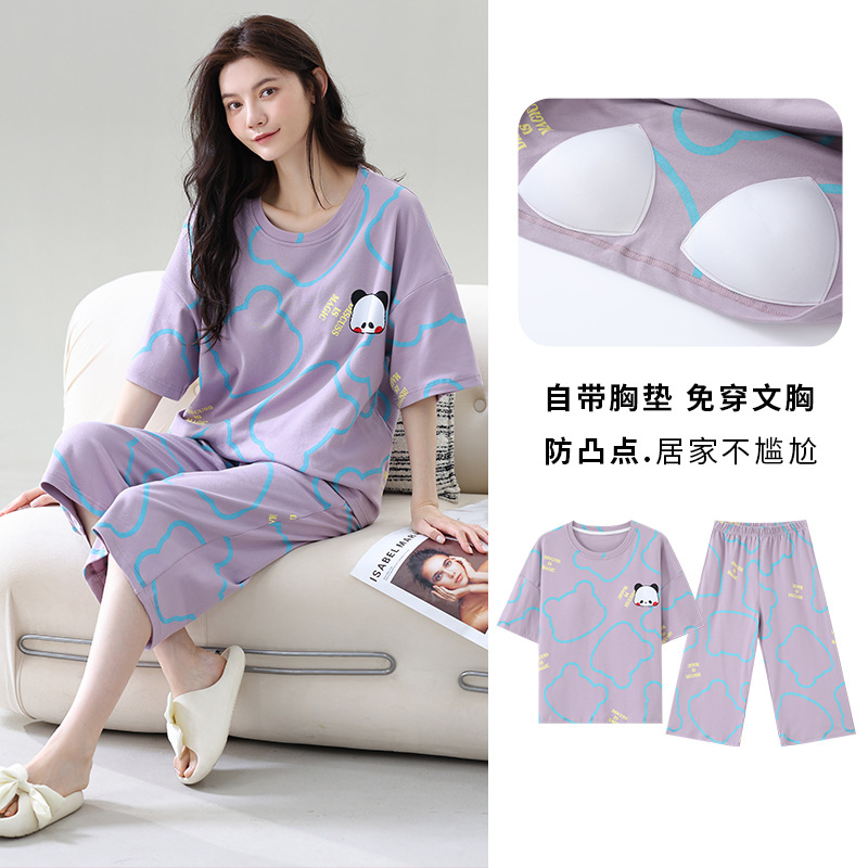 가슴 패드 잠옷을 입은 반소매 자른 바지 여성용 여름 얇은 플러스 사이즈 만화 소녀의 집 옷 세트 외복스토어 가기