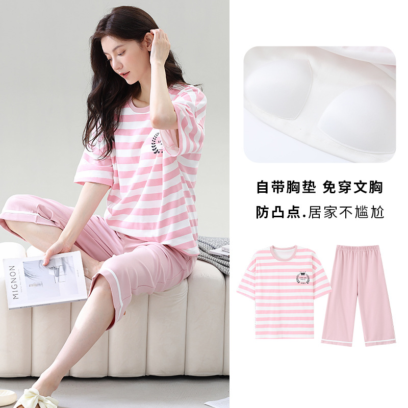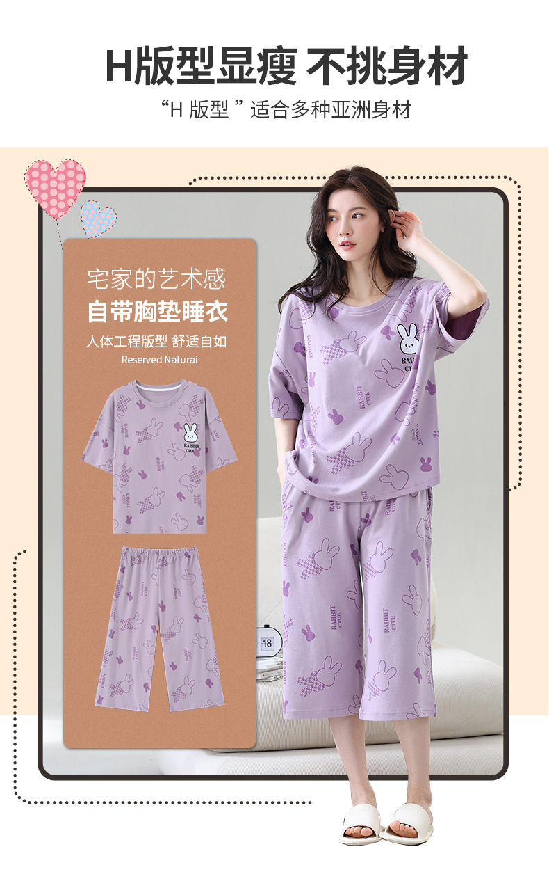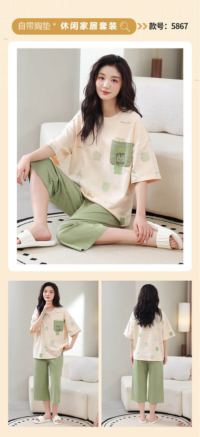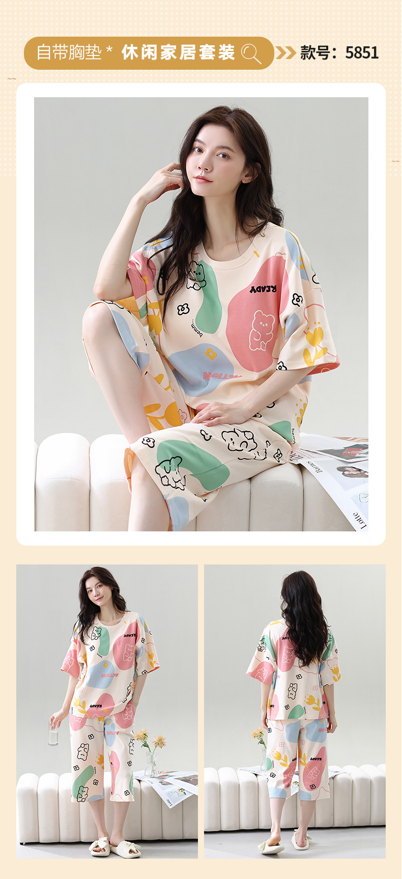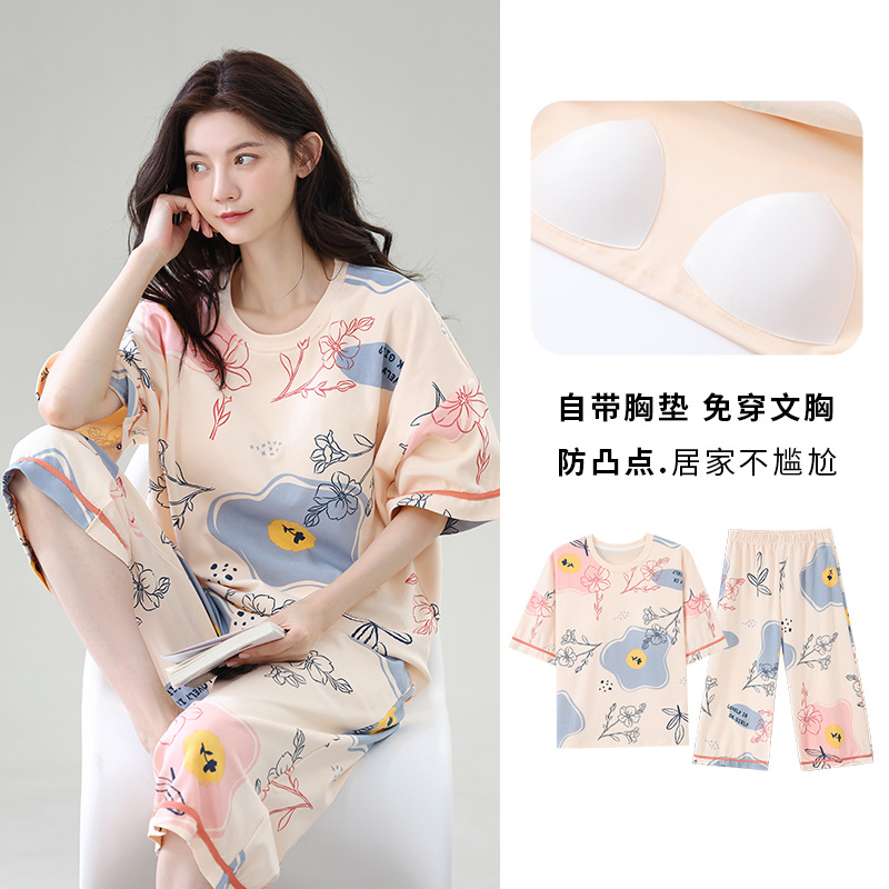가슴 패드 잠옷을 입은 반소매 자른 바지 여성용 여름 얇은 플러스 사이즈 만화 소녀의 집 옷 세트 외복스토어 가기