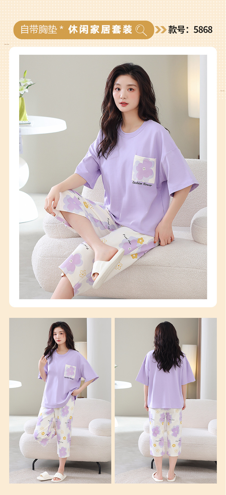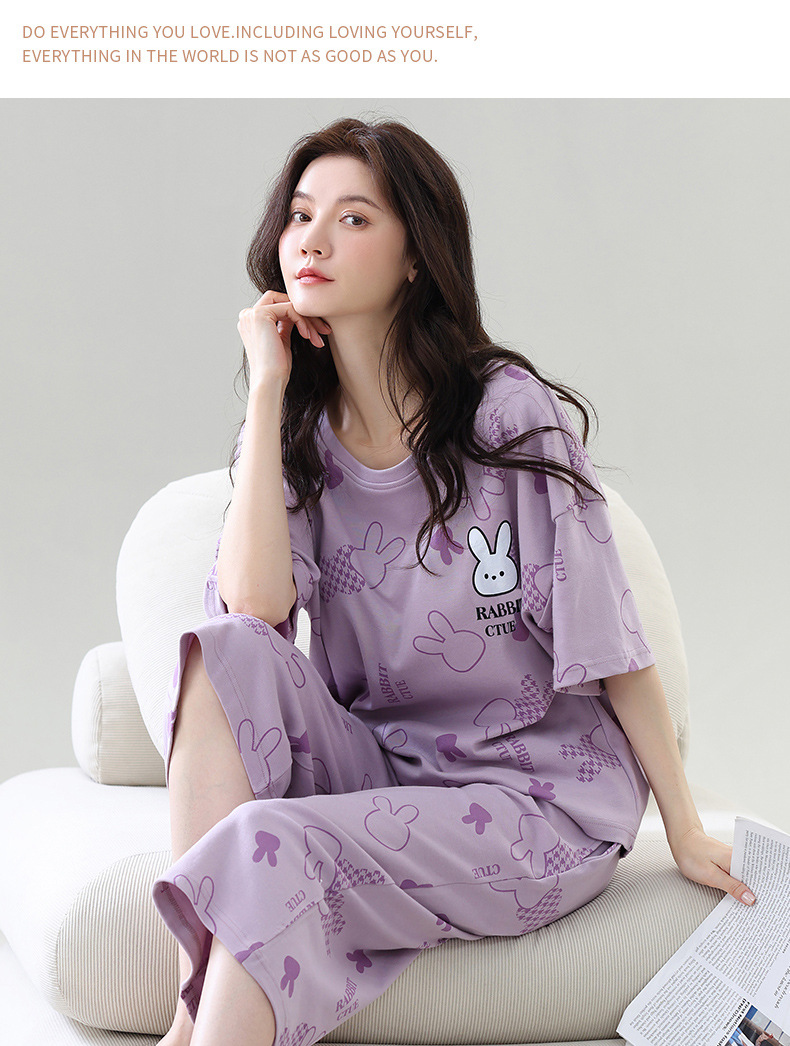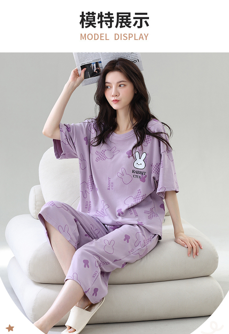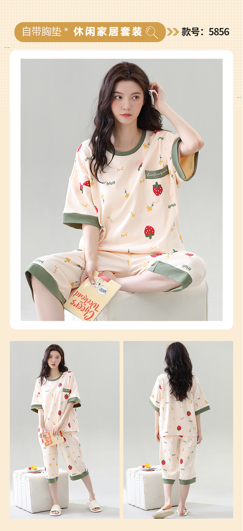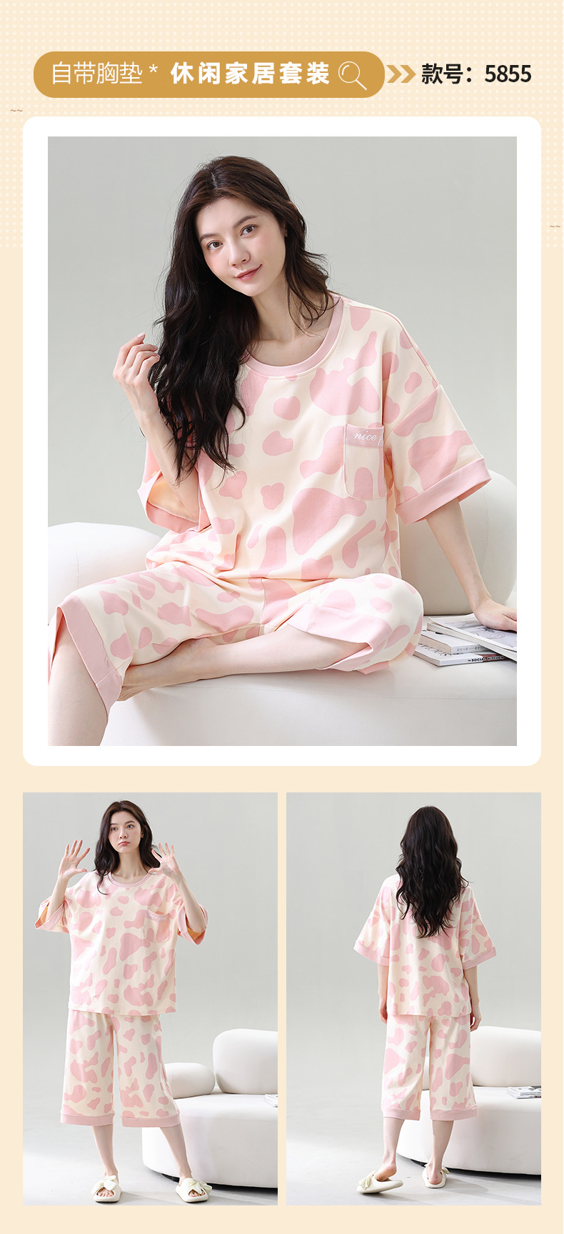 가슴 패드 잠옷을 입은 반소매 자른 바지 여성용 여름 얇은 플러스 사이즈 만화 소녀의 집 옷 세트 외복스토어 가기