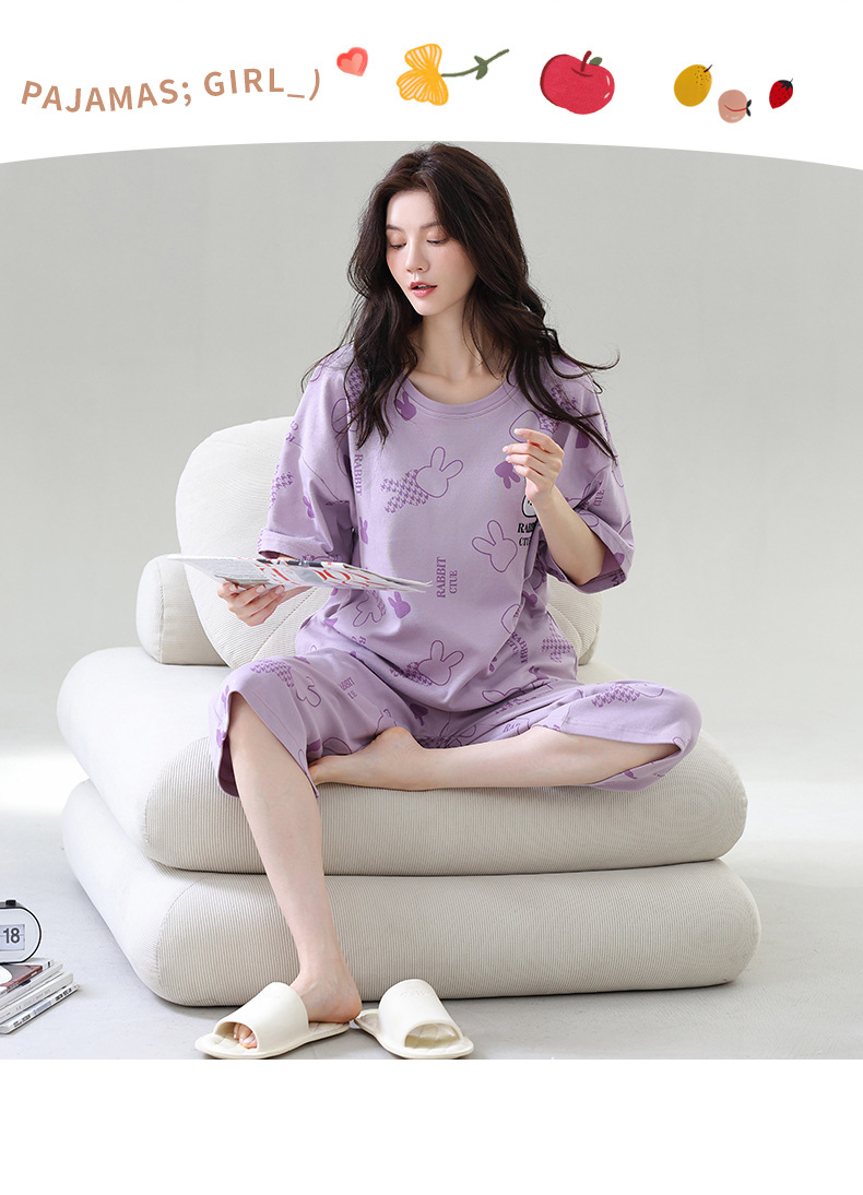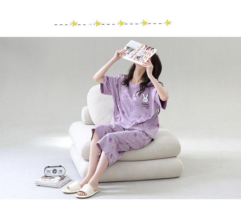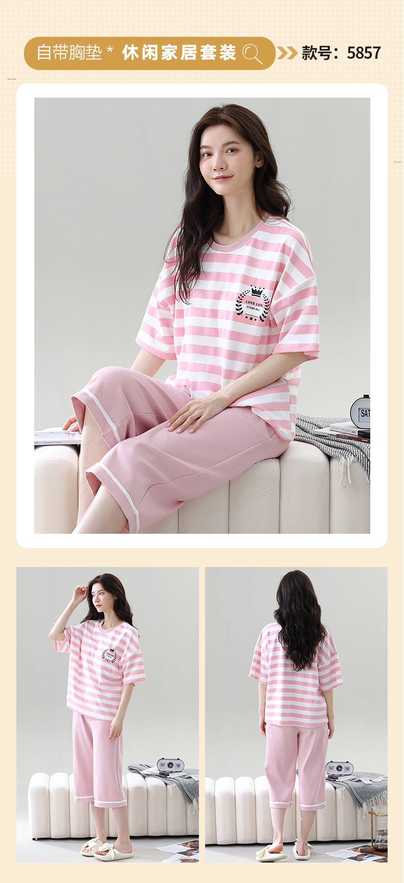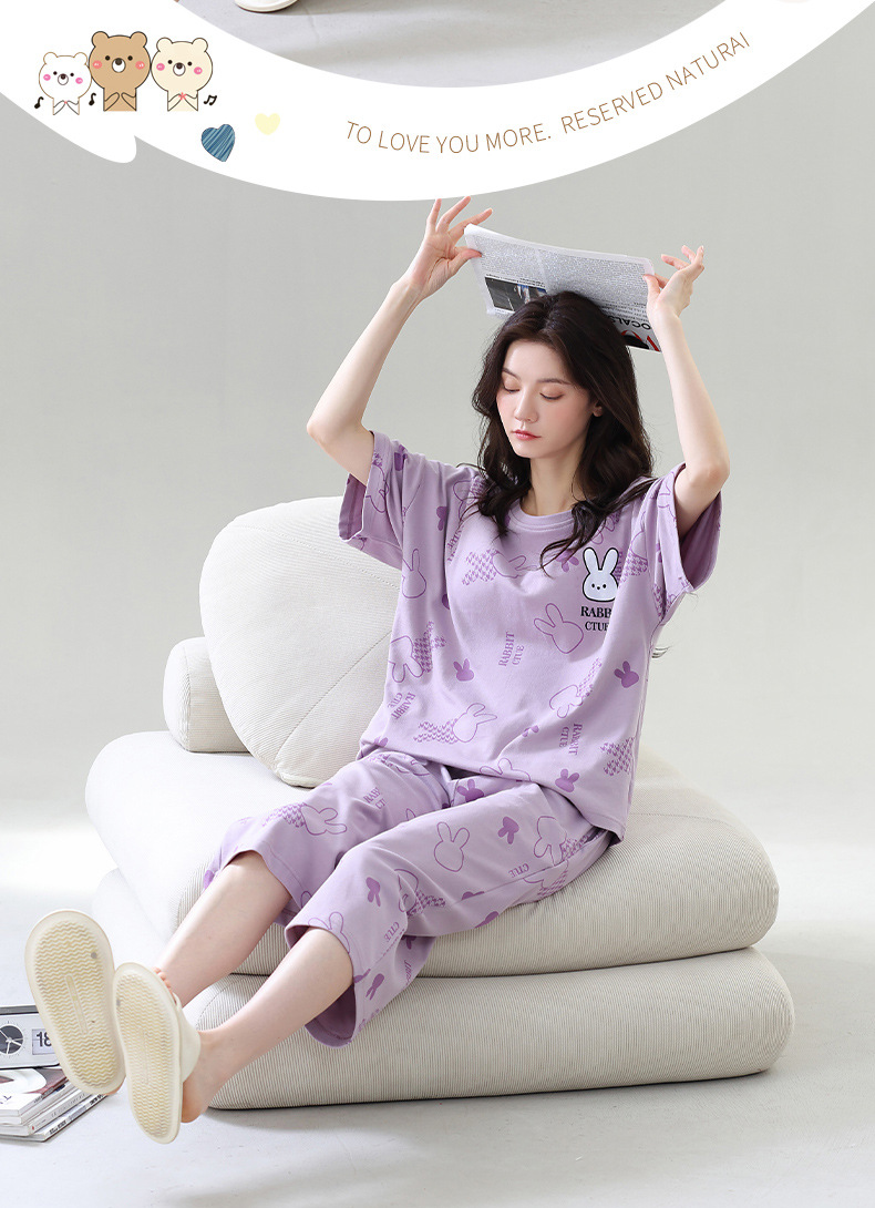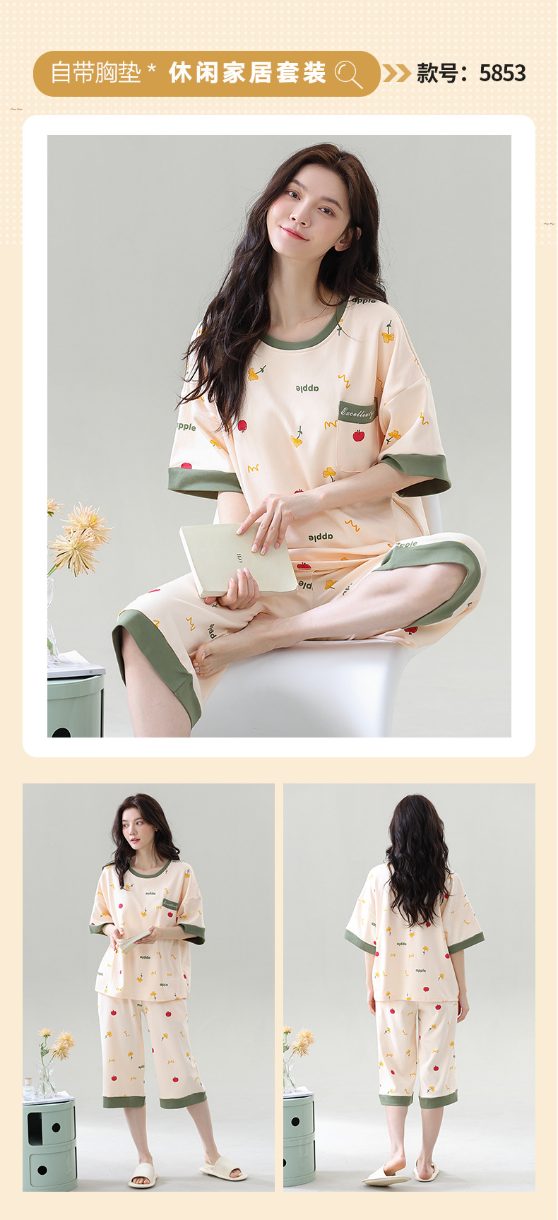가슴 패드 잠옷을 입은 반소매 자른 바지 여성용 여름 얇은 플러스 사이즈 만화 소녀의 집 옷 세트 외복스토어 가기