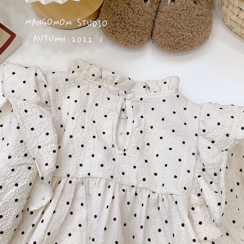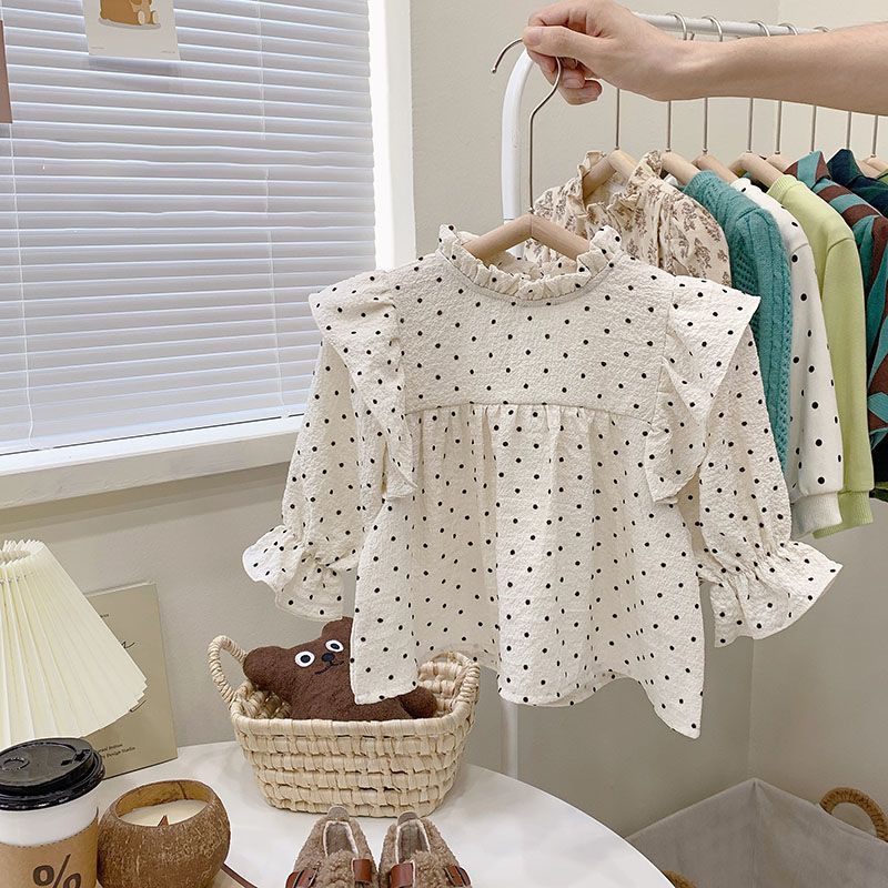 봄과 가을 소녀 티셔츠 셔츠 아기의 서양식 어린이 성격 유행 브랜드 달콤한 웨이브 도트 레이스 플라잉 슬리브 베이스 셔츠스토어 가기