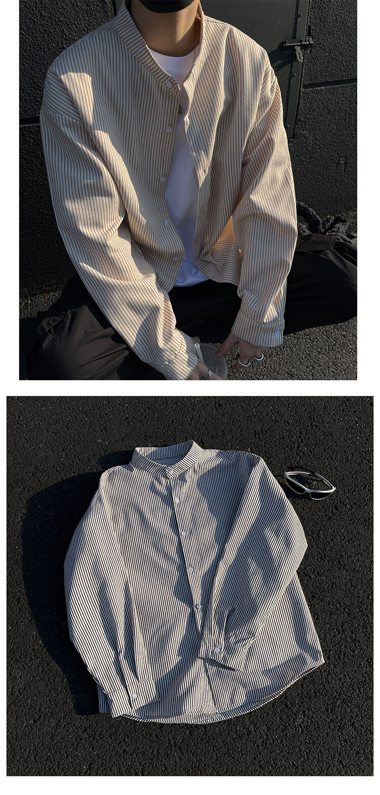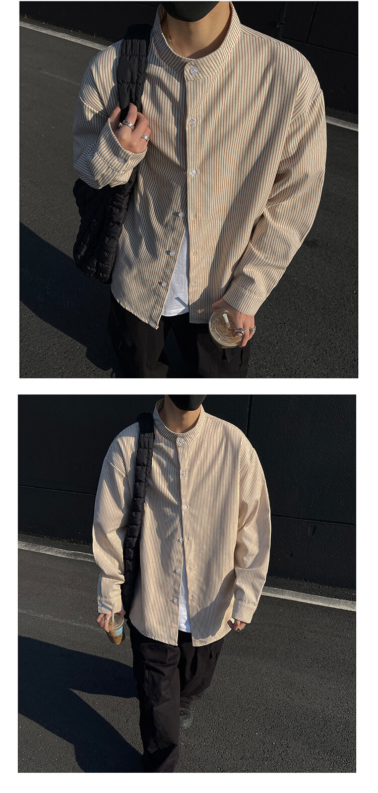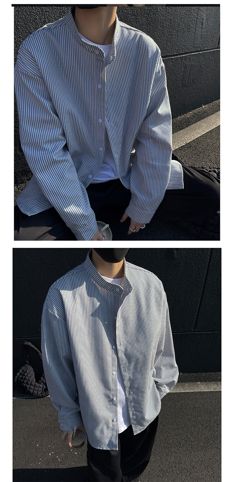 스트라이프 스탠드 칼라 긴팔 셔츠 남성 봄과 가을 미국 복고풍 게으른 스타일 셔츠 러피안 잘 생긴 코트 십대 남성