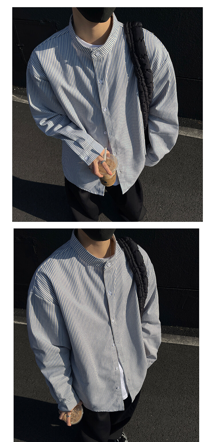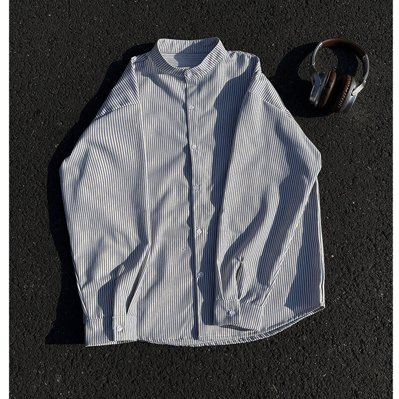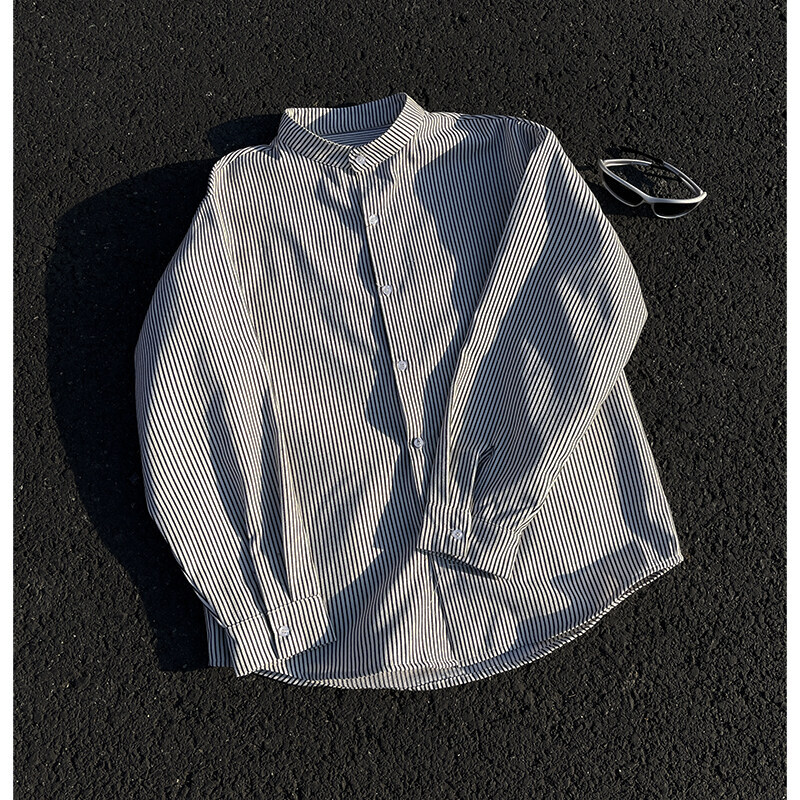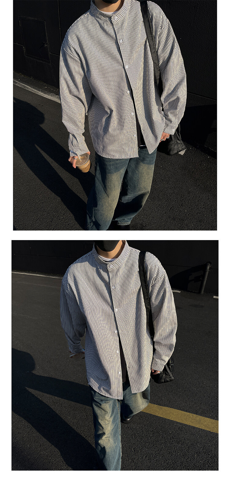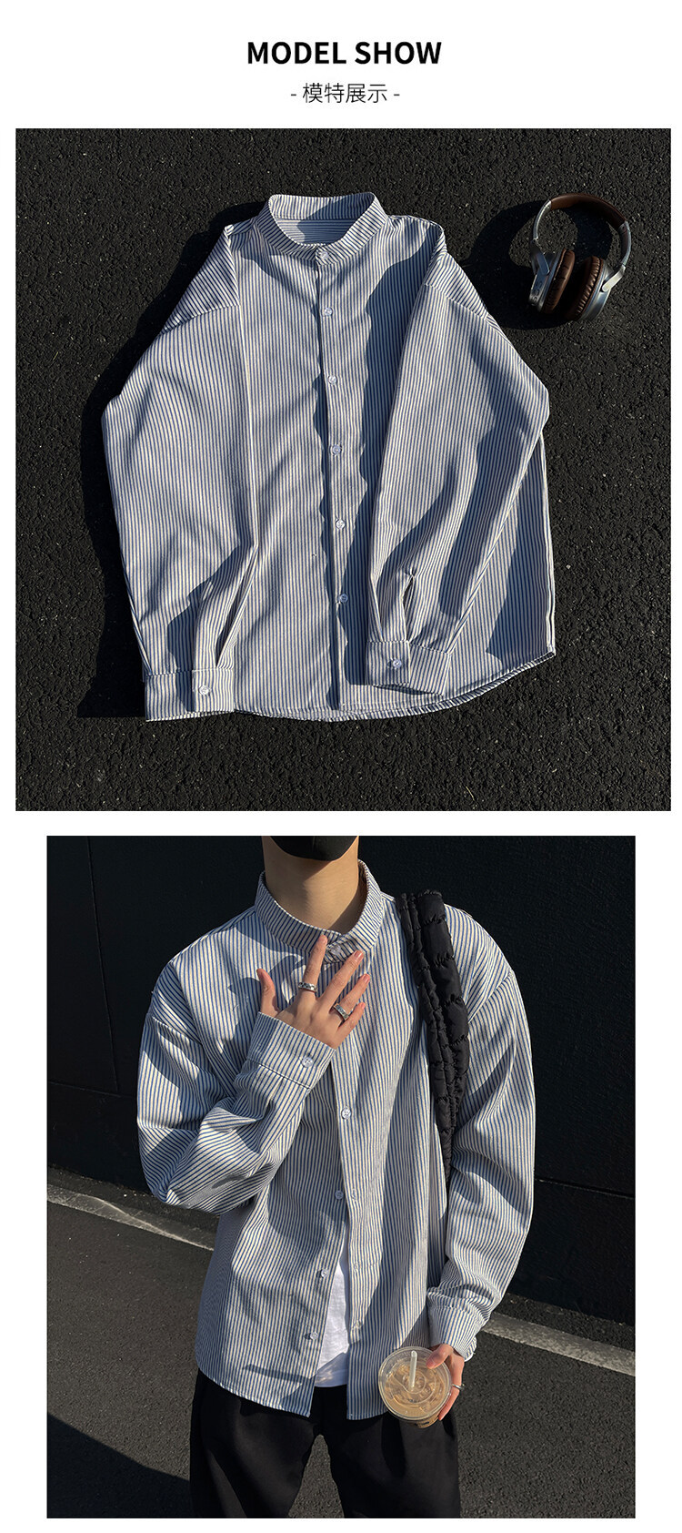 스트라이프 스탠드 칼라 긴팔 셔츠 남성 봄과 가을 미국 복고풍 게으른 스타일 셔츠 러피안 잘 생긴 코트 십대 남성스토어 가기