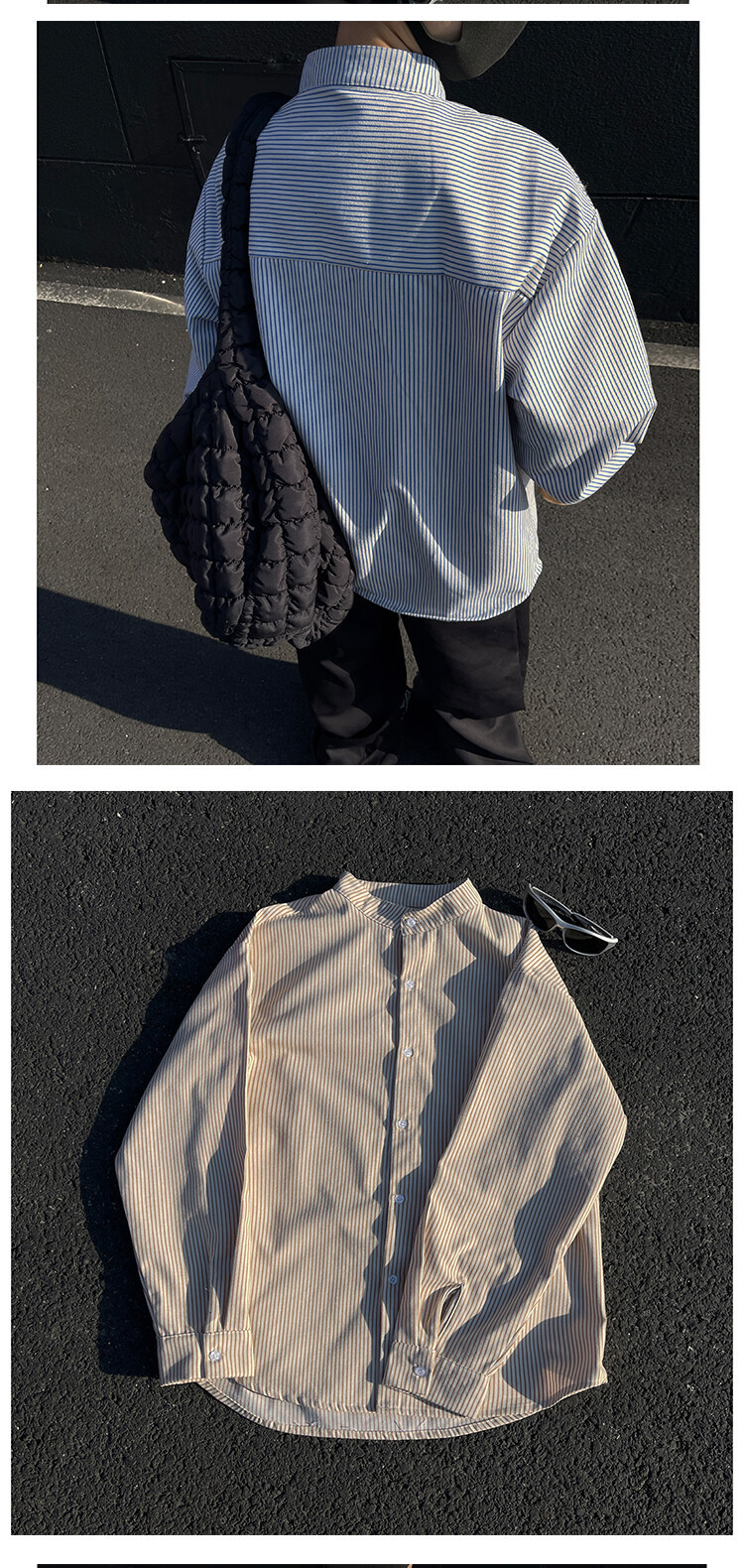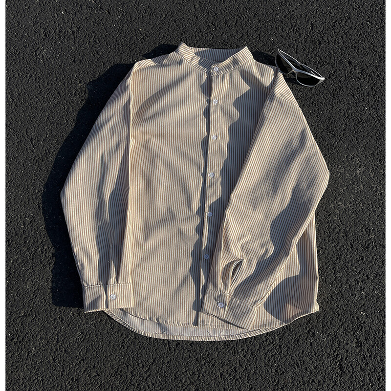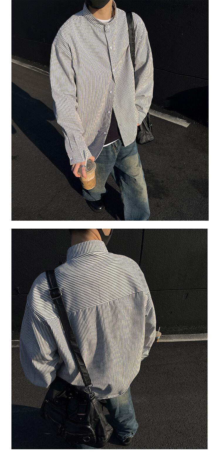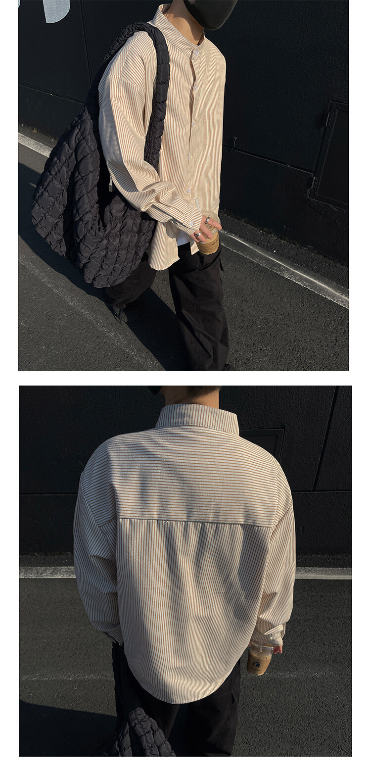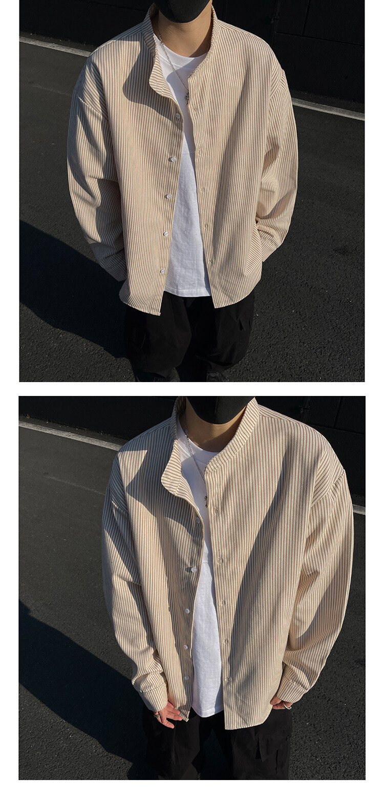 스트라이프 스탠드 칼라 긴팔 셔츠 남성 봄과 가을 미국 복고풍 게으른 스타일 셔츠 러피안 잘 생긴 코트 십대 남성스토어 가기