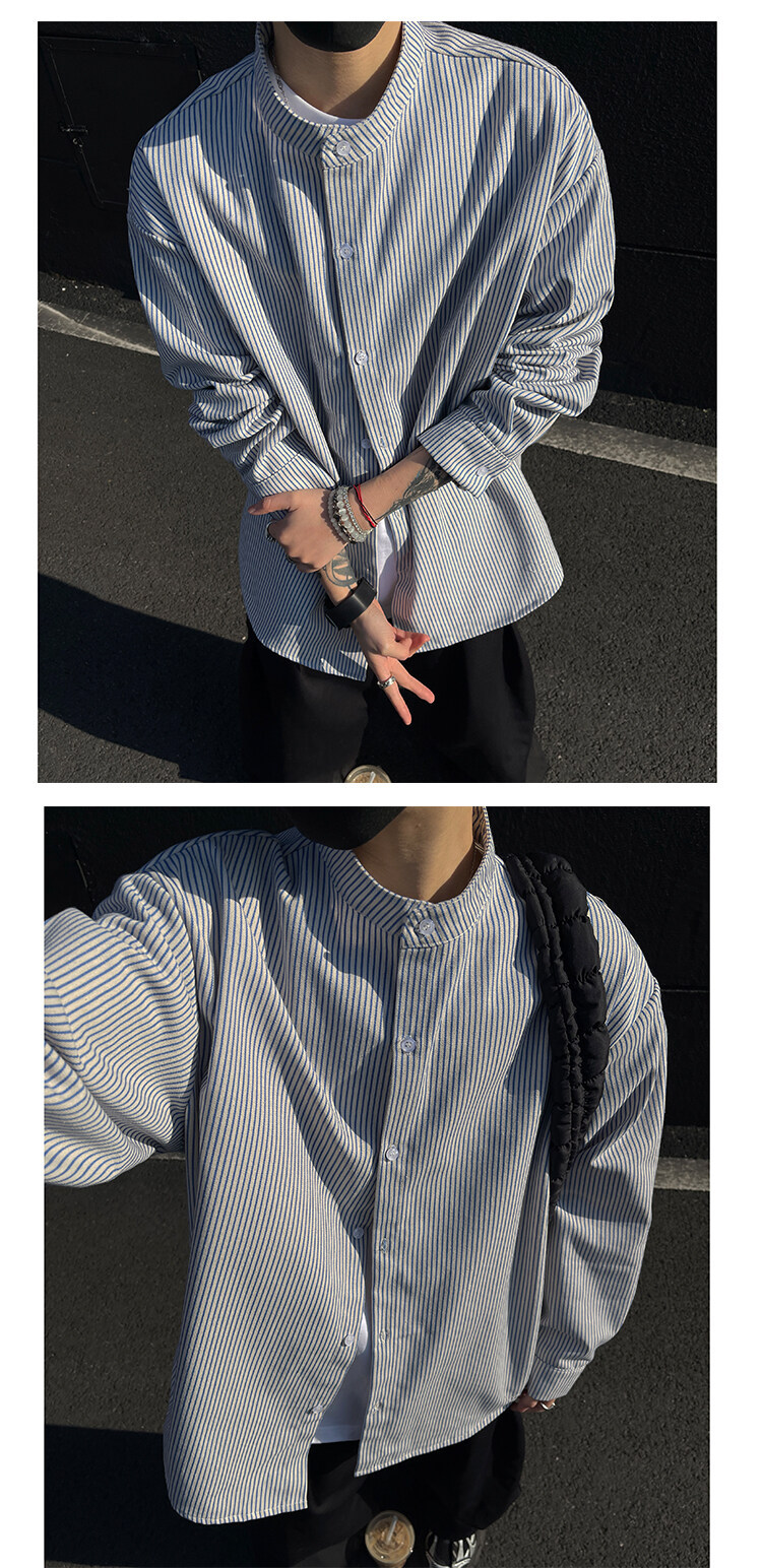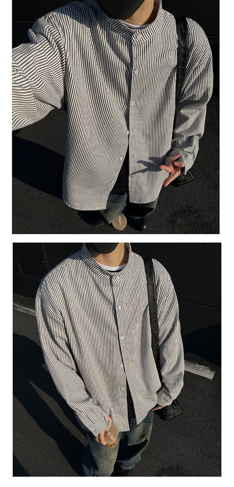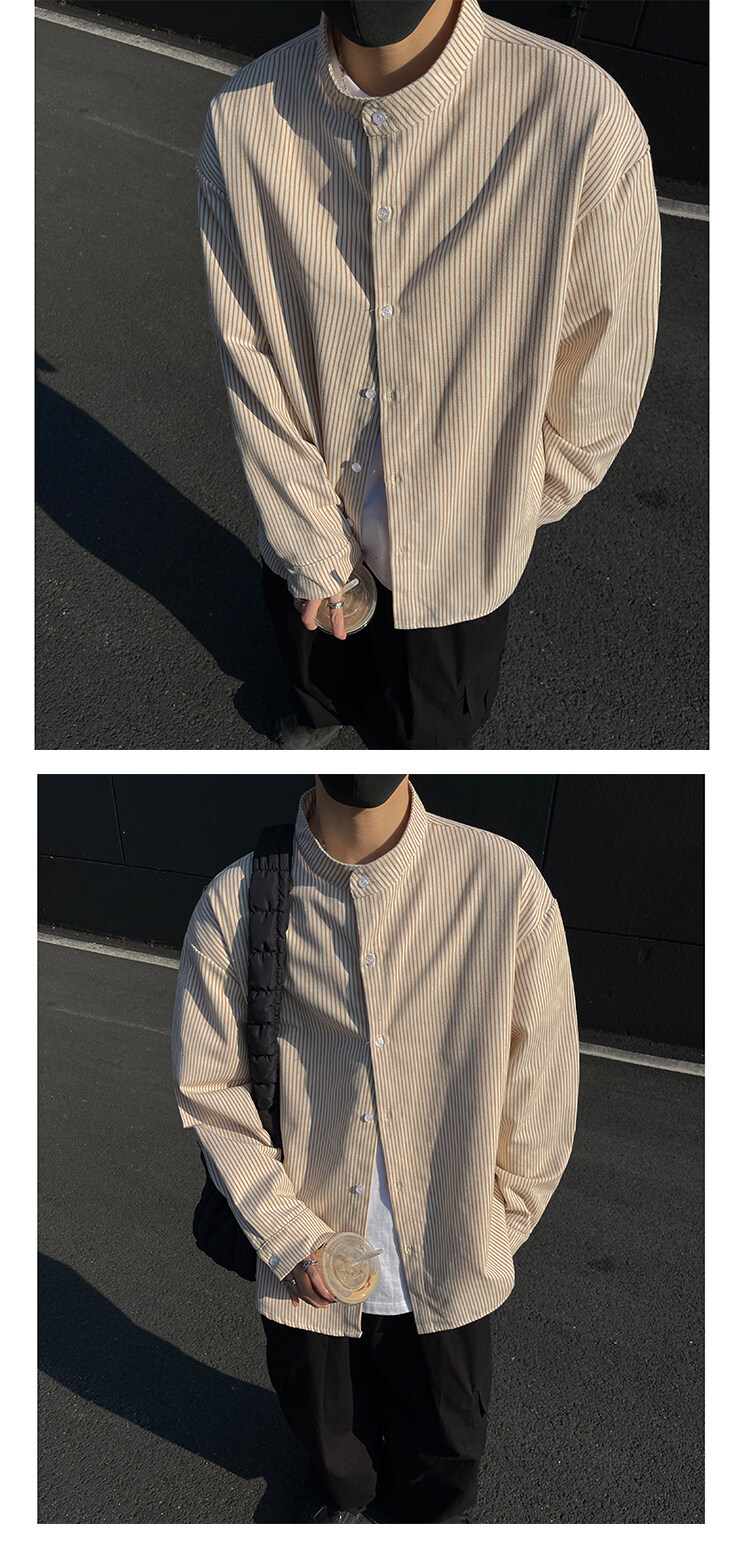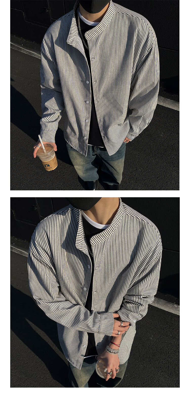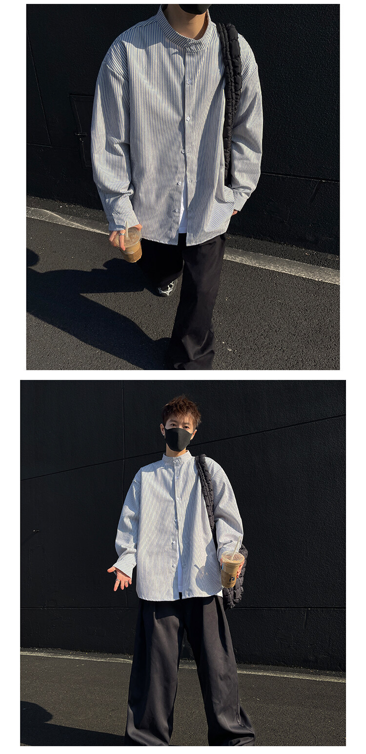 스트라이프 스탠드 칼라 긴팔 셔츠 남성 봄과 가을 미국 복고풍 게으른 스타일 셔츠 러피안 잘 생긴 코트 십대 남성스토어 가기